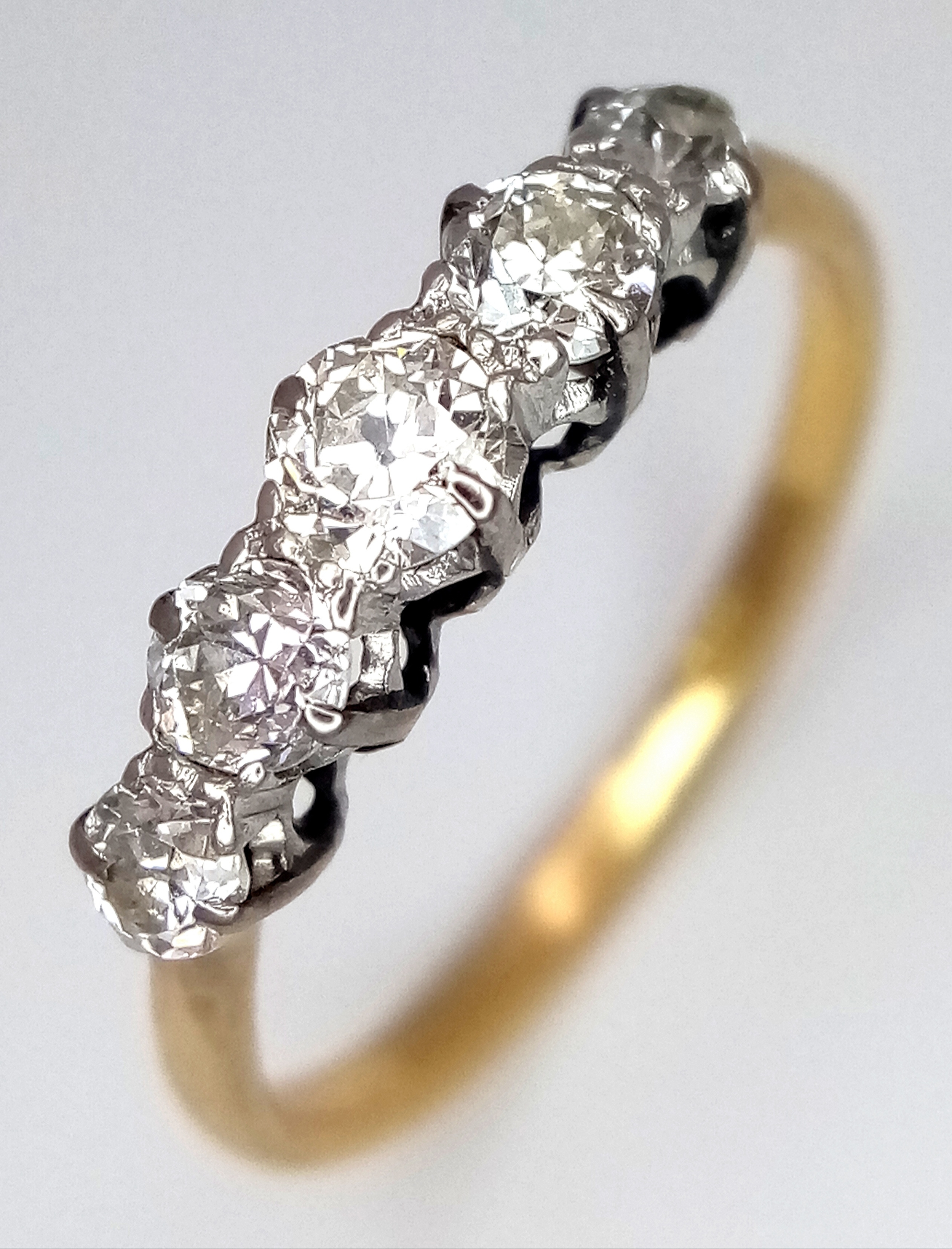 AN 18K YELLOW GOLD VINTAGE OLD CUT DIAMOND 5 STONE RING. 0.6...