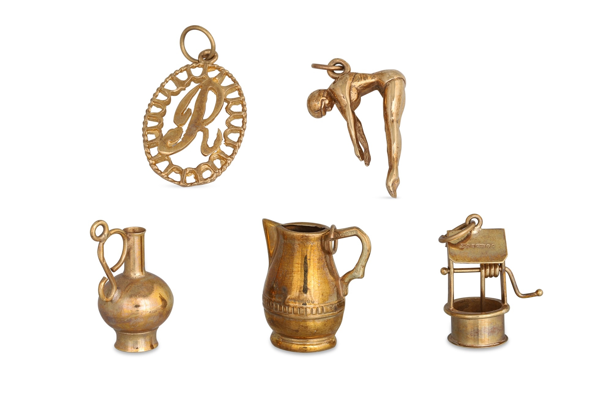 FIVE 9CT GOLD VINTAGE CHARMS, of various forms, 10.6 g