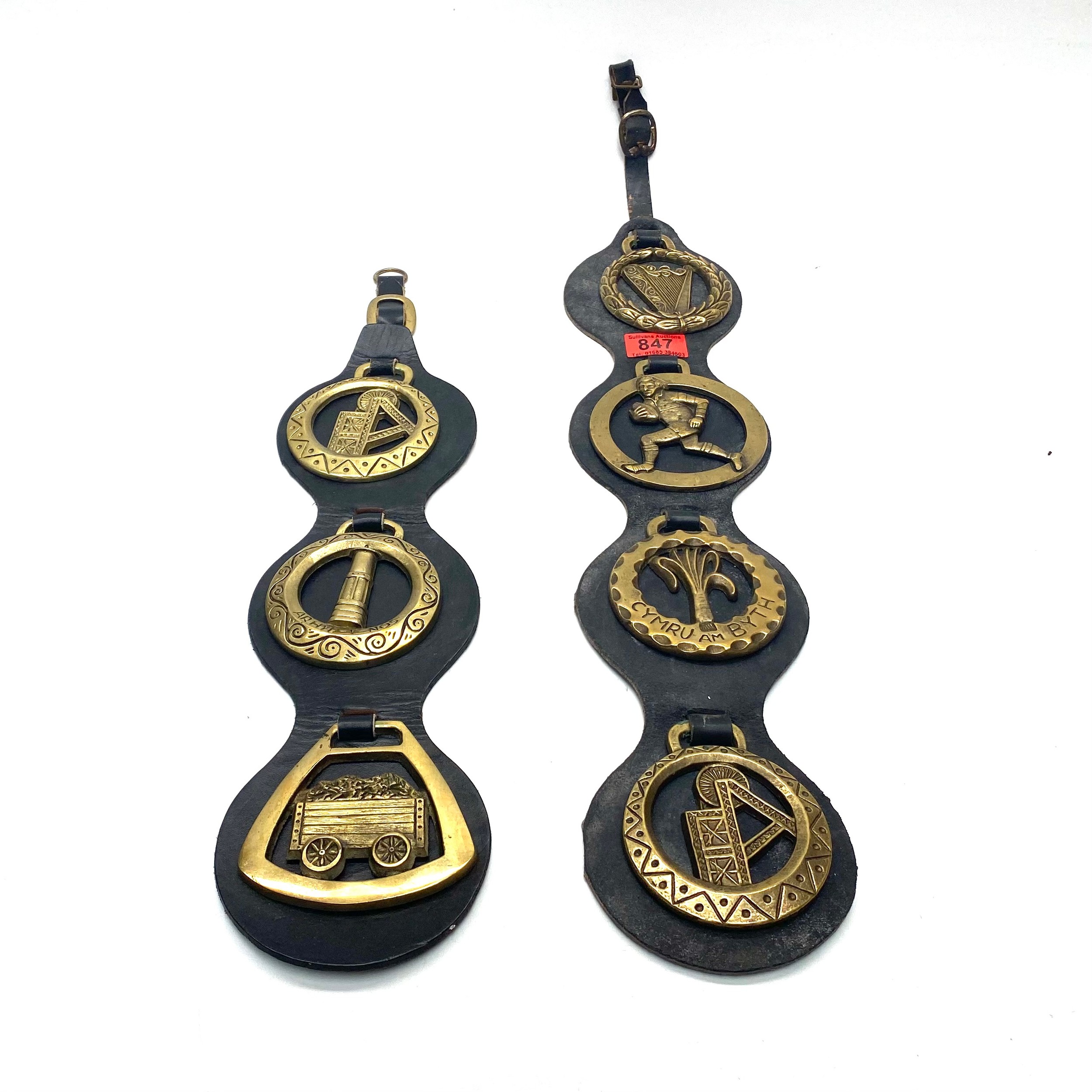 Horse brasses themed on Welsh culture including: "Cymru Am Byth".
