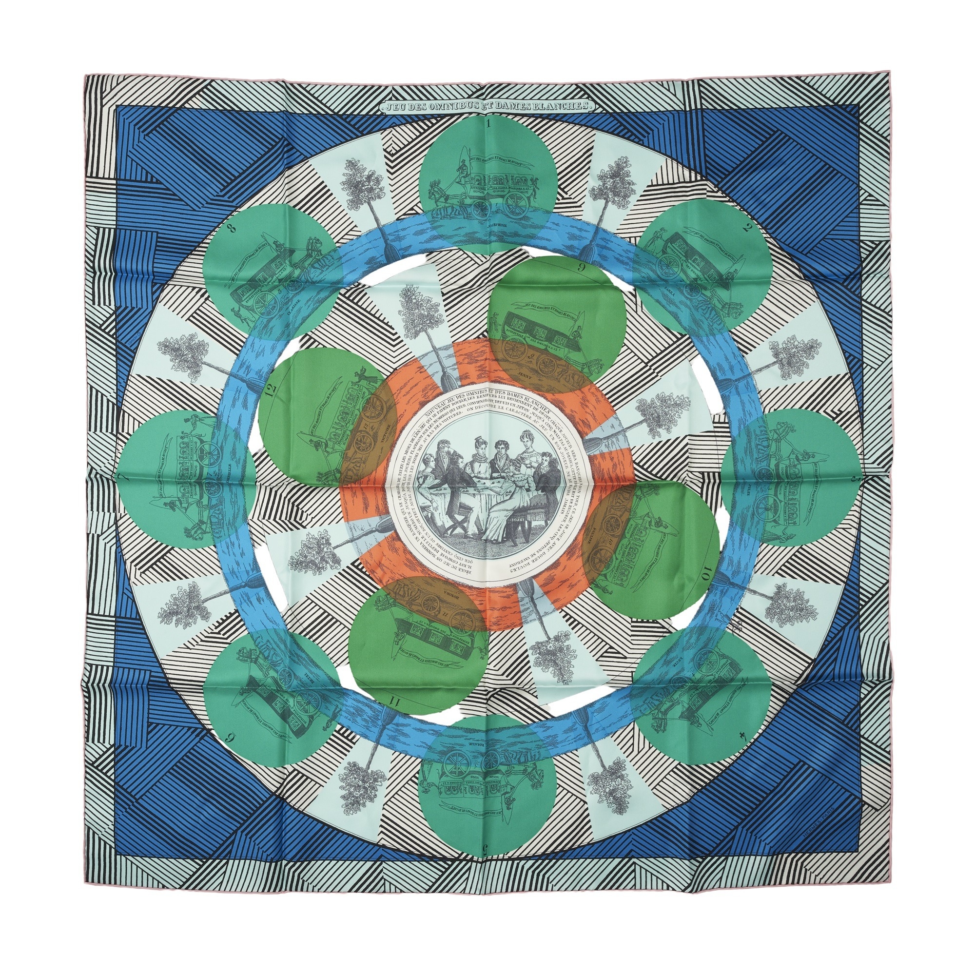 Hermes, a Jeu des Omnibus Remix silk scarf, designed by Giancarlo Pagni in 2018 and features a multicoloured block coloured motif, creating a modern updated version of the original design released in 1937, measuring 90 by 90cm