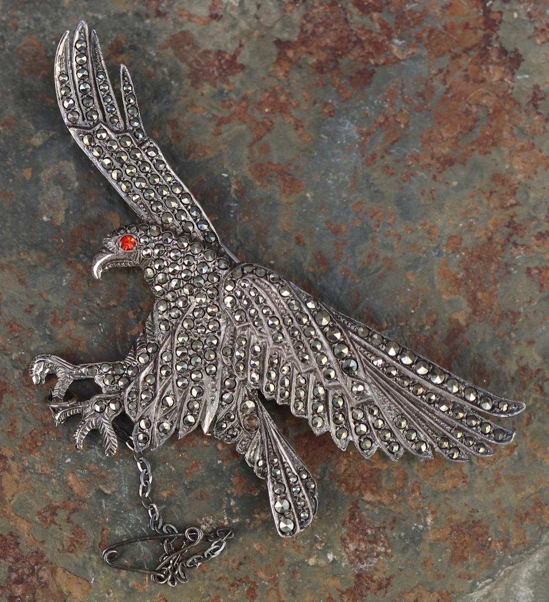 Vintage silver eagle marcasite brooch - Approx 35.4g