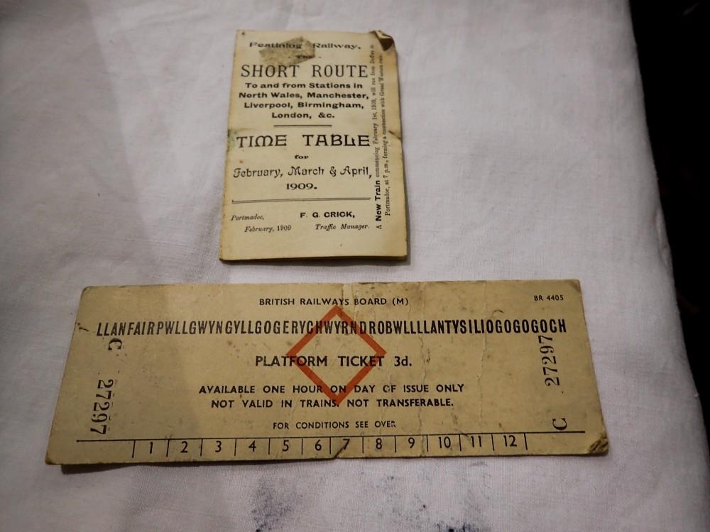 1909 dated timetable for the Festing Railway and a platform ticket for Lanfairpwllgwyngyllgogerychwyrndrobwllllantysiliogogogoch. UK P&P Group 1 (£16+VAT for the first lot and £2+VAT for subsequent lots)
