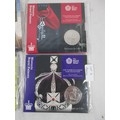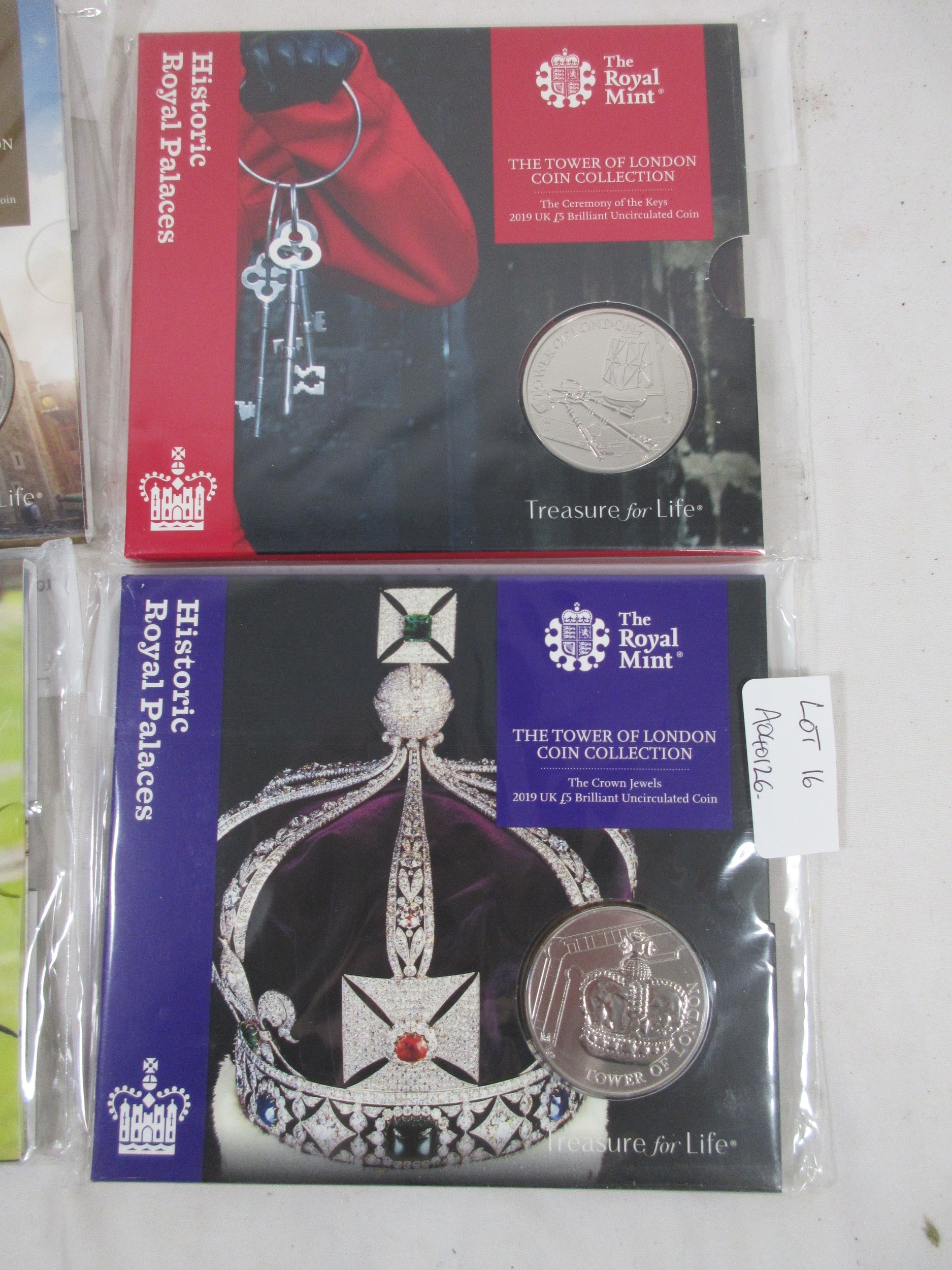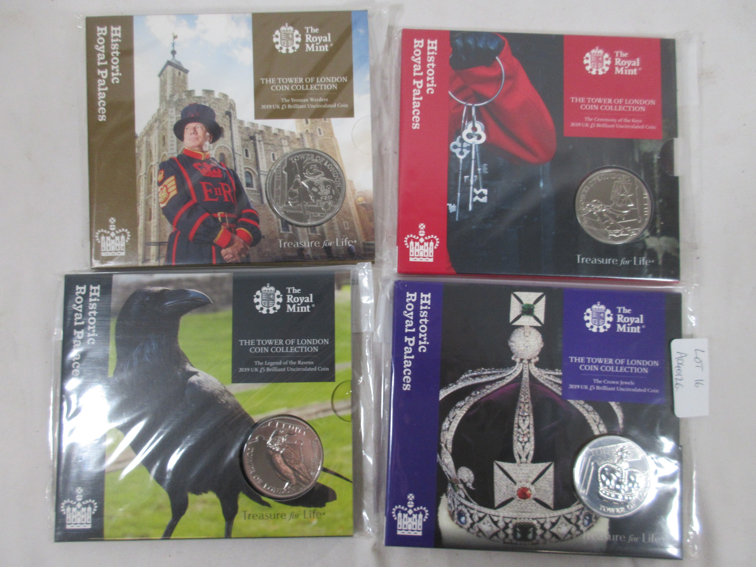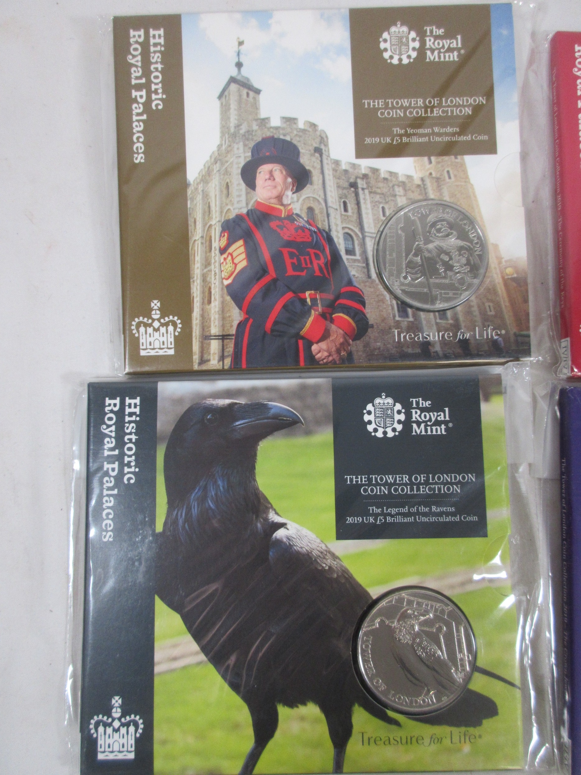 Royal Mint 2019 The Tower of London Coin Collection set of four brilliant uncirculated £5 coins, The Ceremony of the Keys, The Yeoman Warders, The Legend of the Ravens, The Crown Jewels. With a slightly a/f crumpled cardboard slip case
