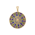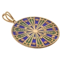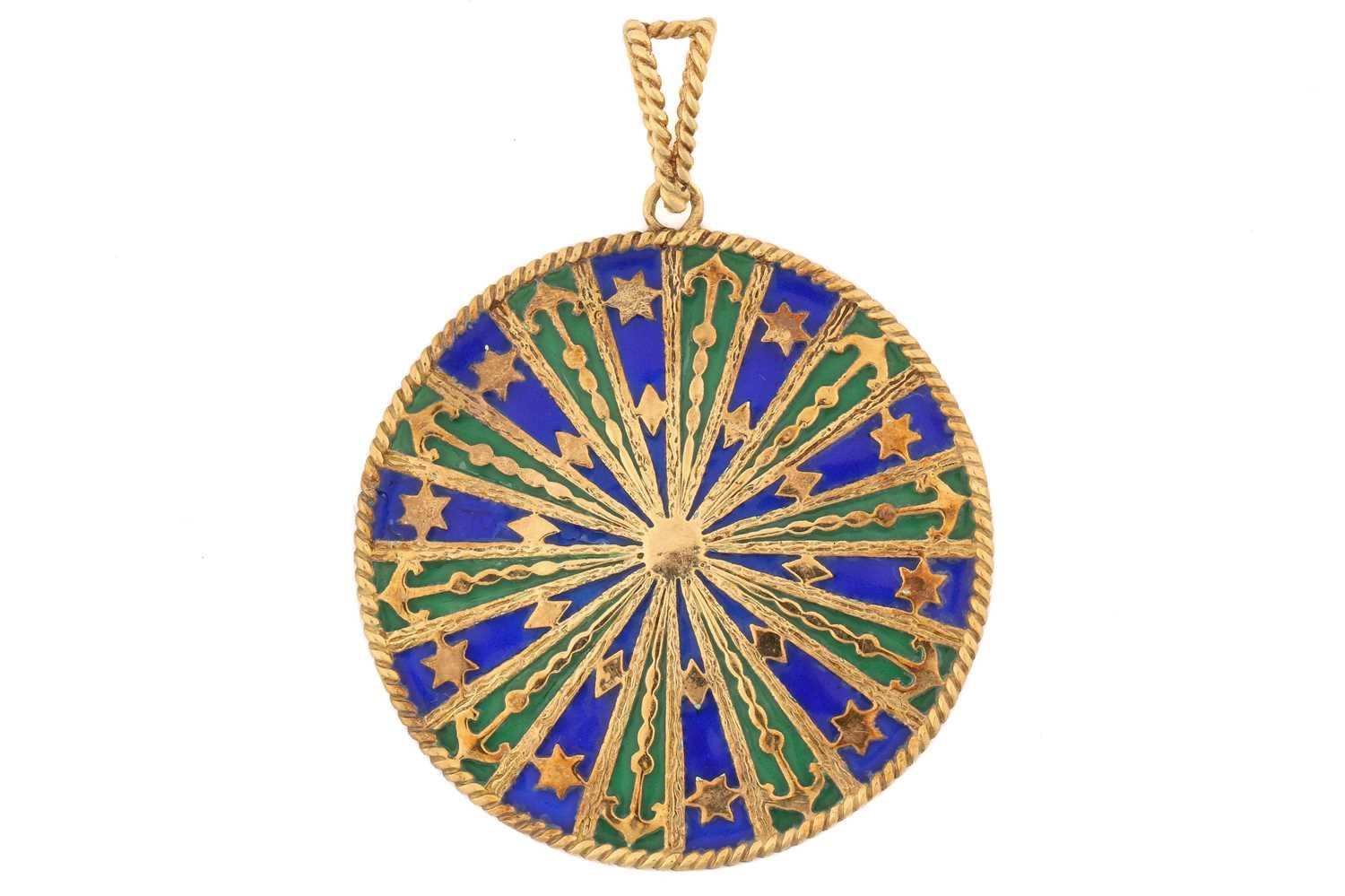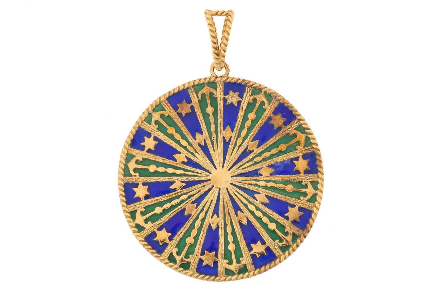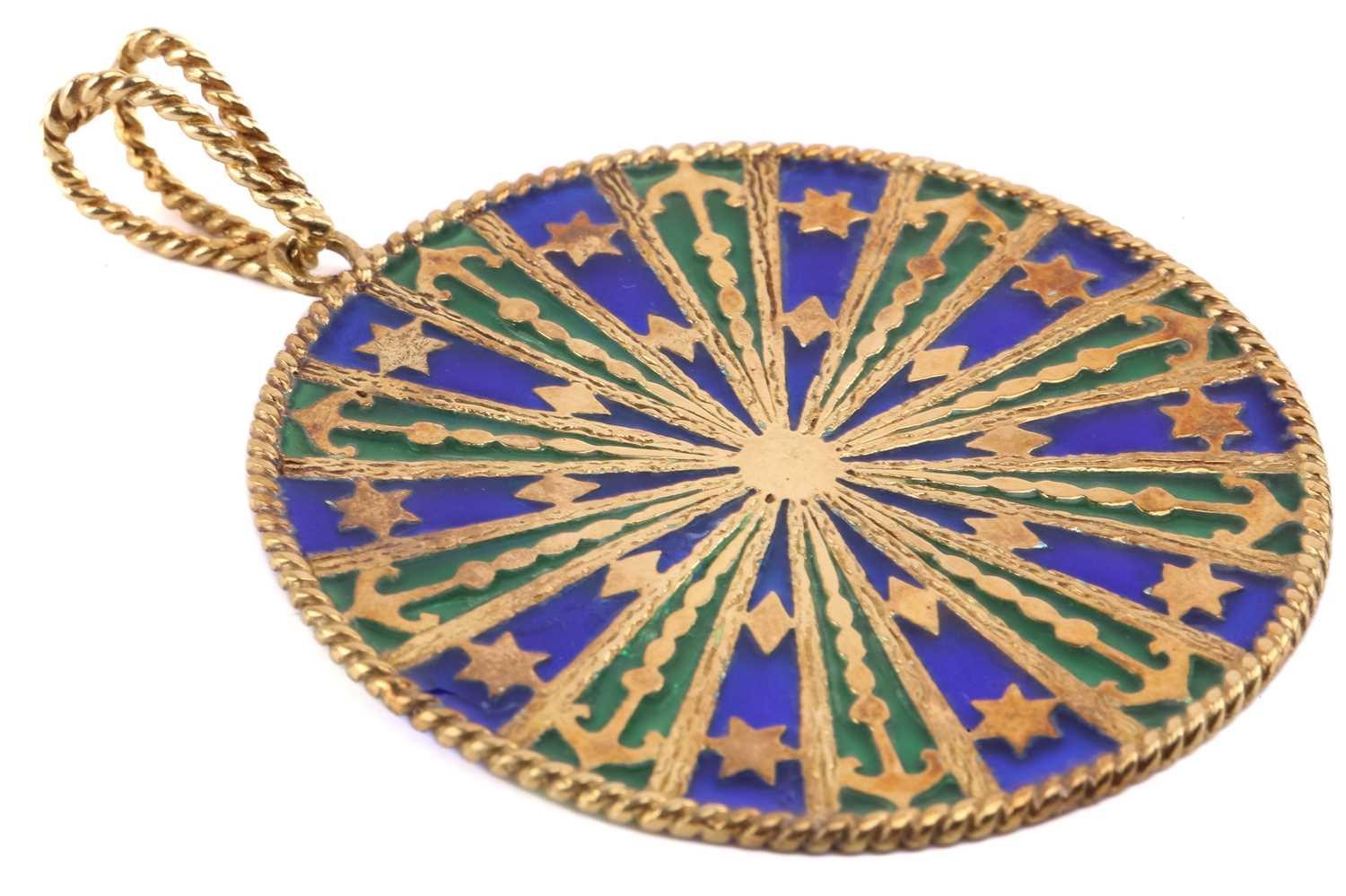 A plique-à-jour enamel Rose Window pendant in 18ct gold, with nautic design motifs, green and blue enamelwork, twisted rope edge and bail, struck with London import marks for 18ct gold, with 'FWO' sponsor's mark, 1974, measures 5.2 cm across, total weight of item 18.1 grams.