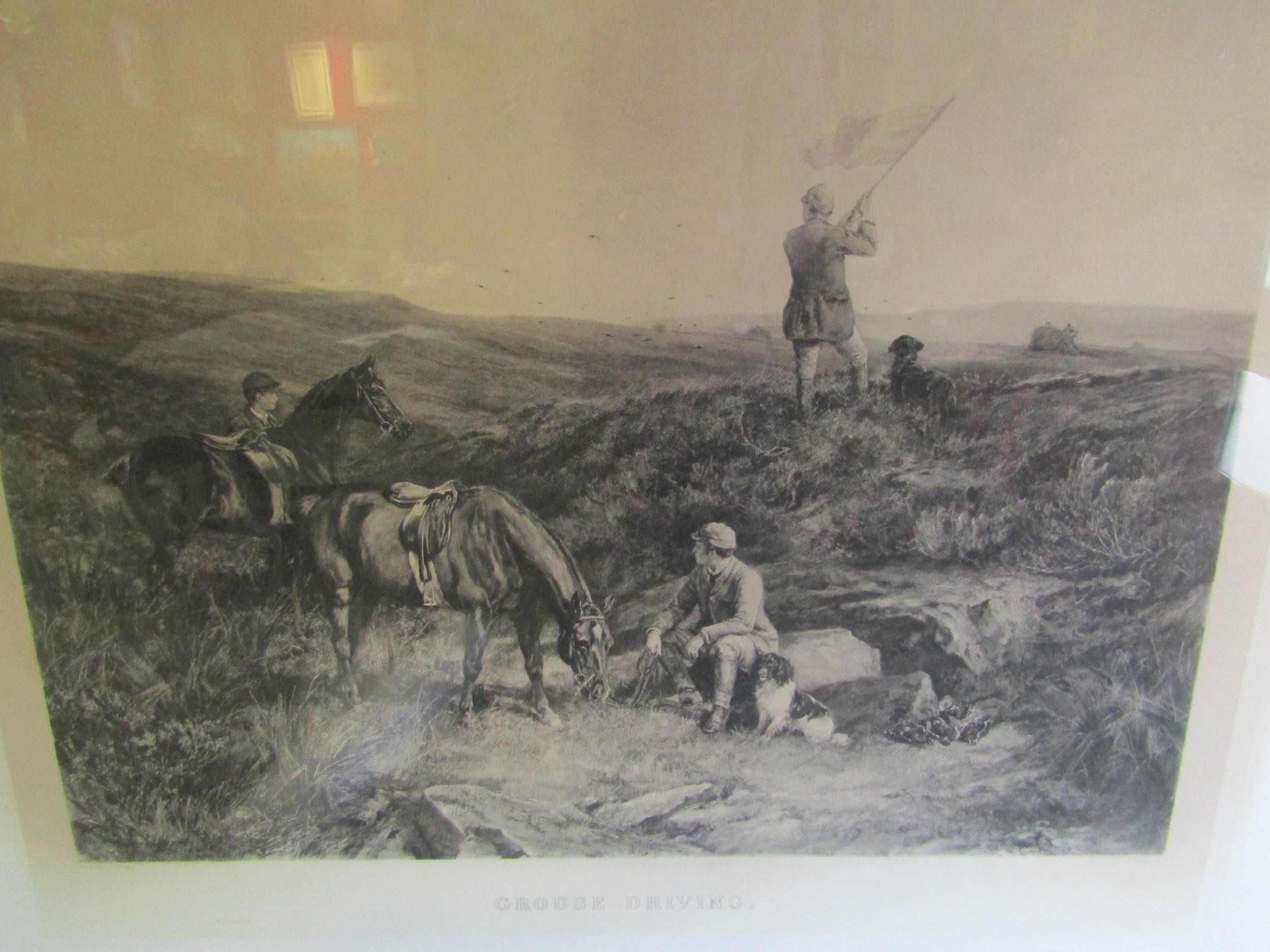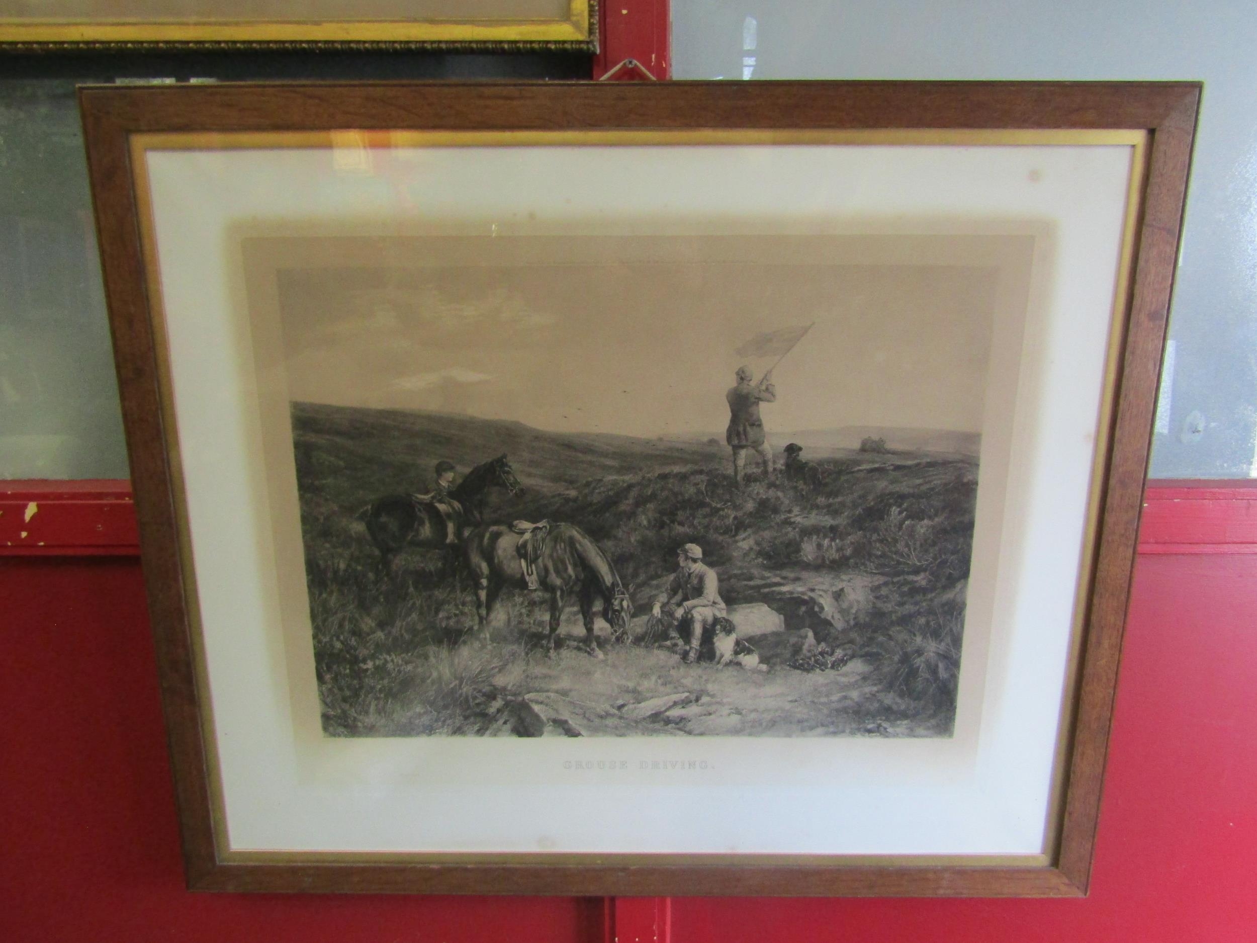 A print "Grouse Driving" in oak frame with gilt slips and glazed, 79cm x 93cm overall size (D)