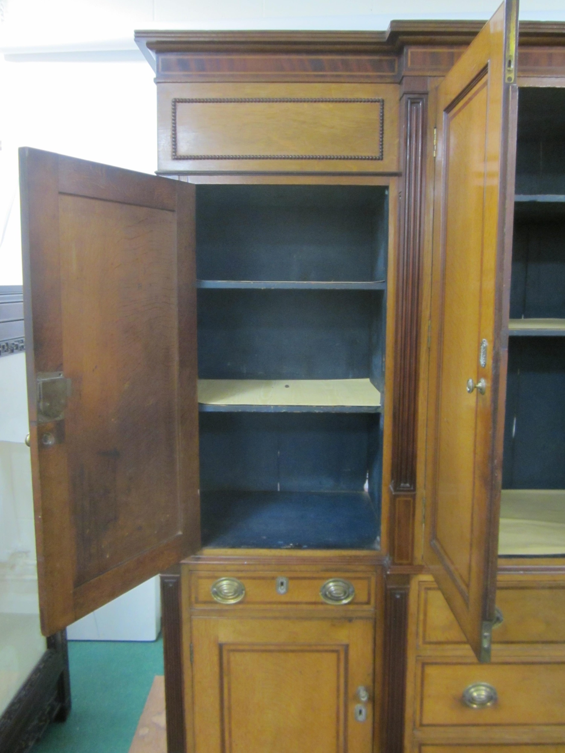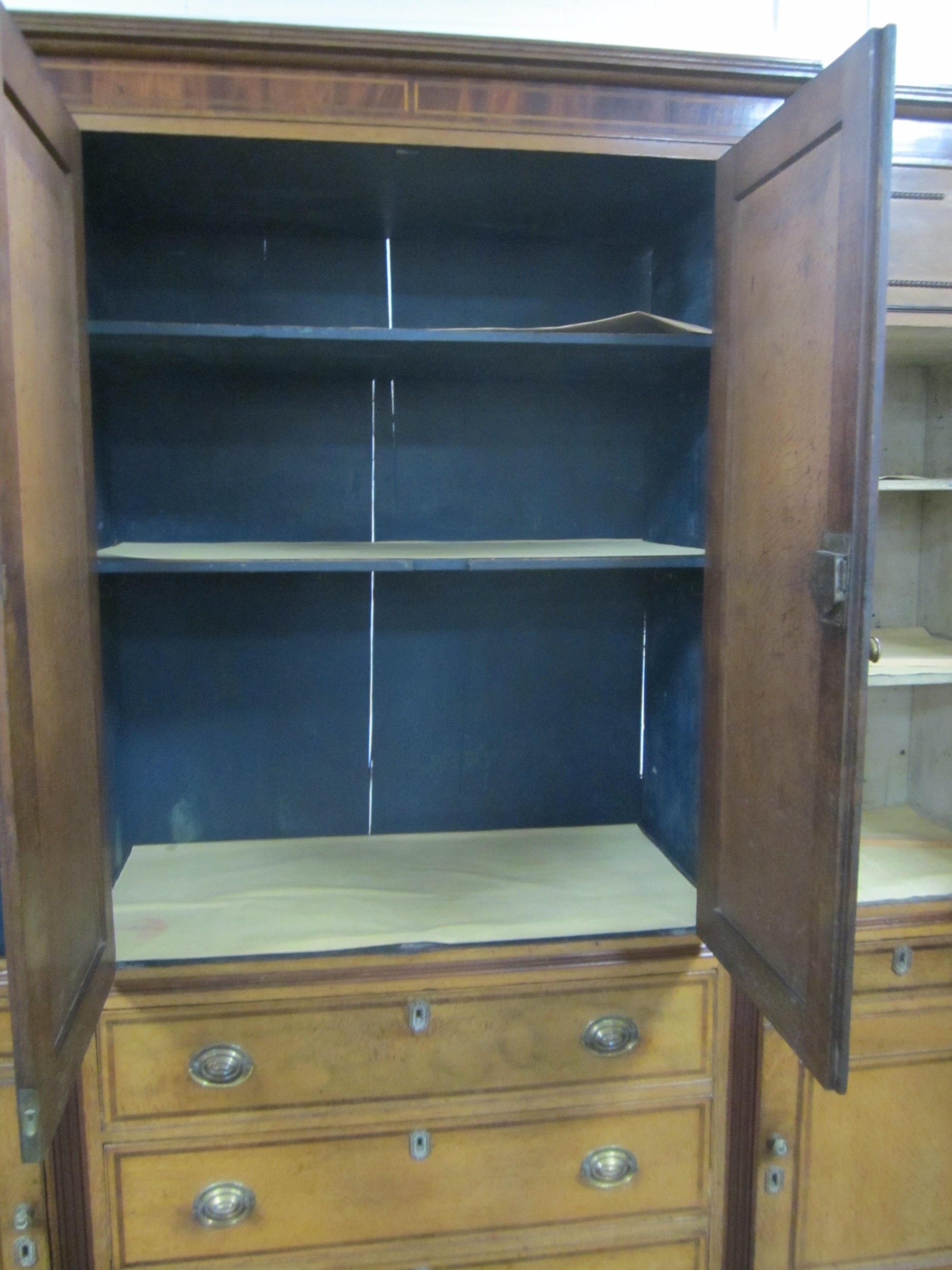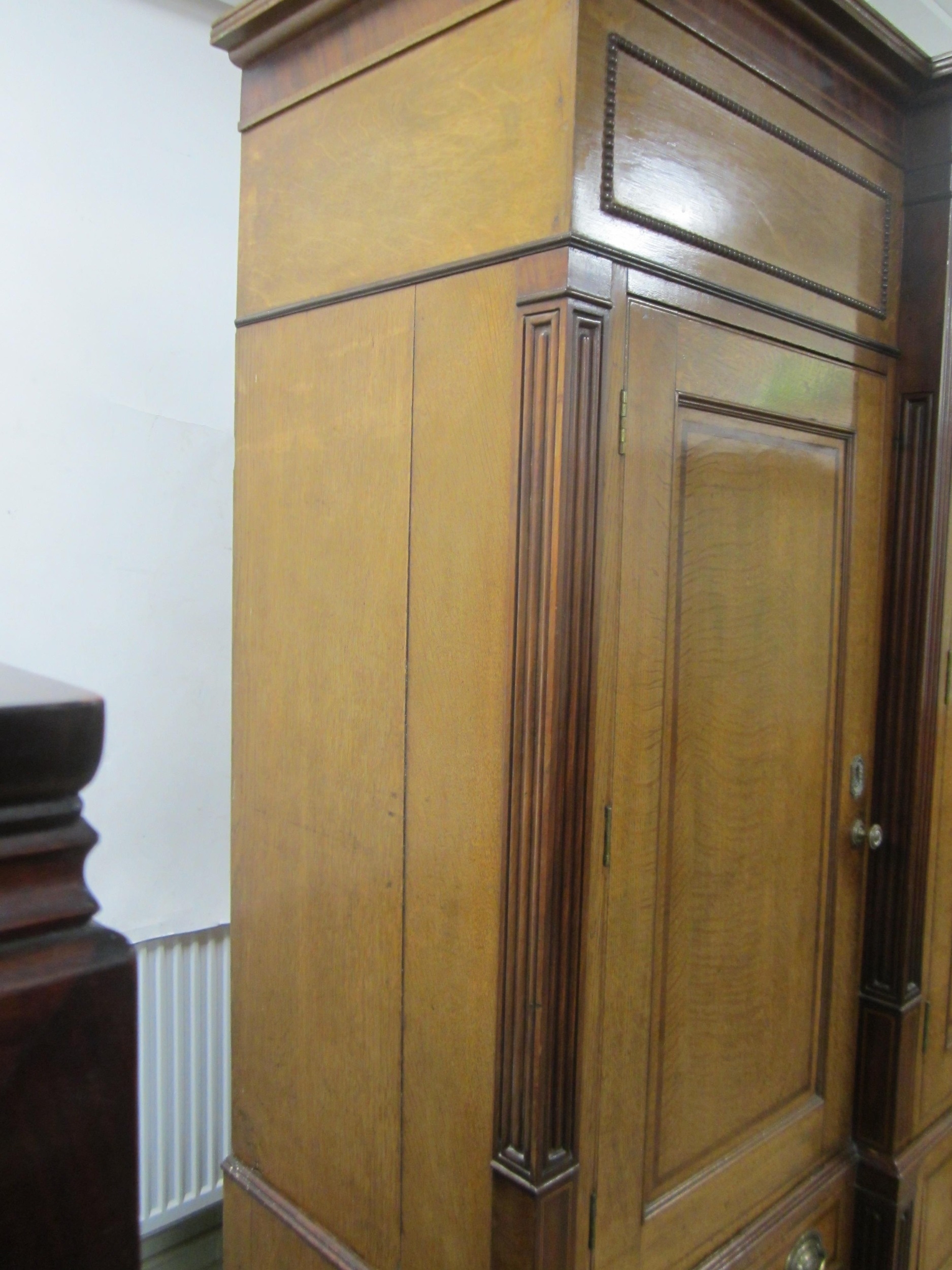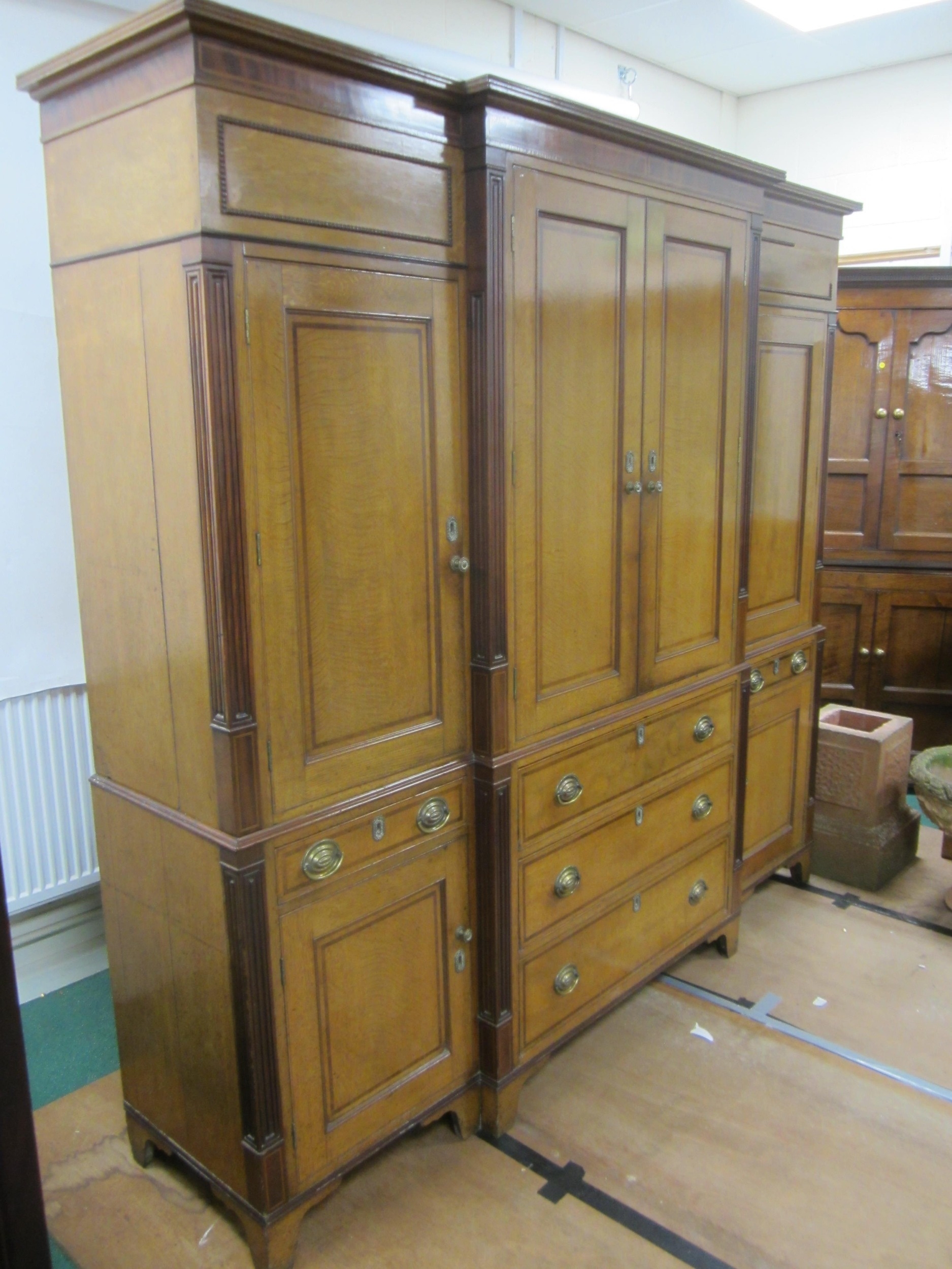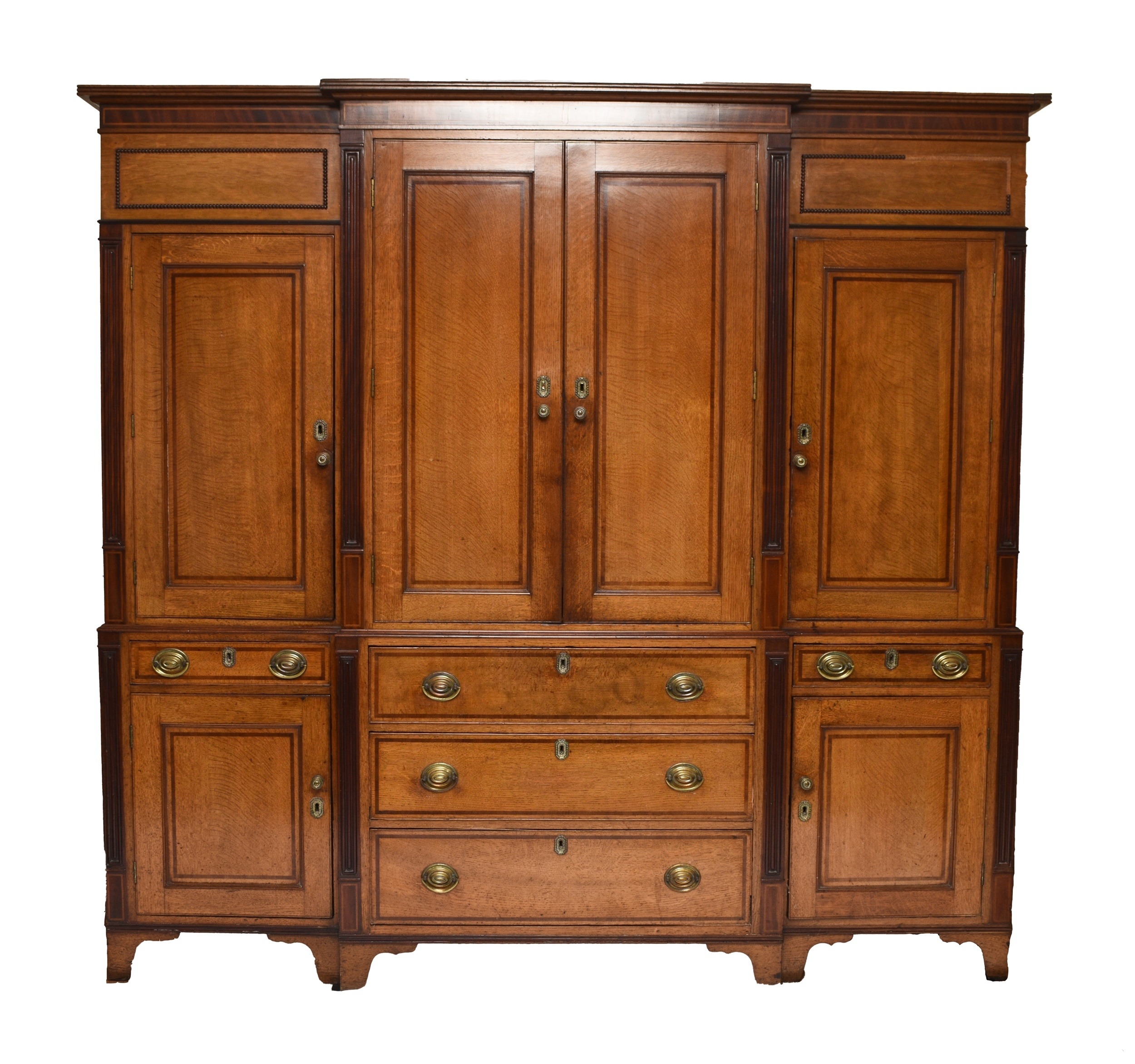 A George III cross-banded oak break-front housekeeper's cupboard The reeded cornice above a mahogany and line-inlaid frieze and twin panelled cupboard doors flanked by conforming single doors, the lower section with three graduated drawers flanked by short drawers and cupboards, bordered by reeded mahogany pilasters, the interior with fixed shelving, raised on bracket feet. 218cm wide x 55cm deep x 206cm high Condition:Generally good with some minor cosmetic marks consistent with age and use. Typical splits to side panels. Section of beading to top right frieze panel loose with a further adjacent small section missing. Drawer handles are later replacements. No keys.