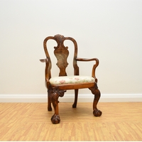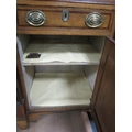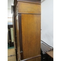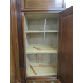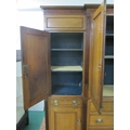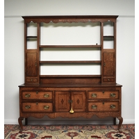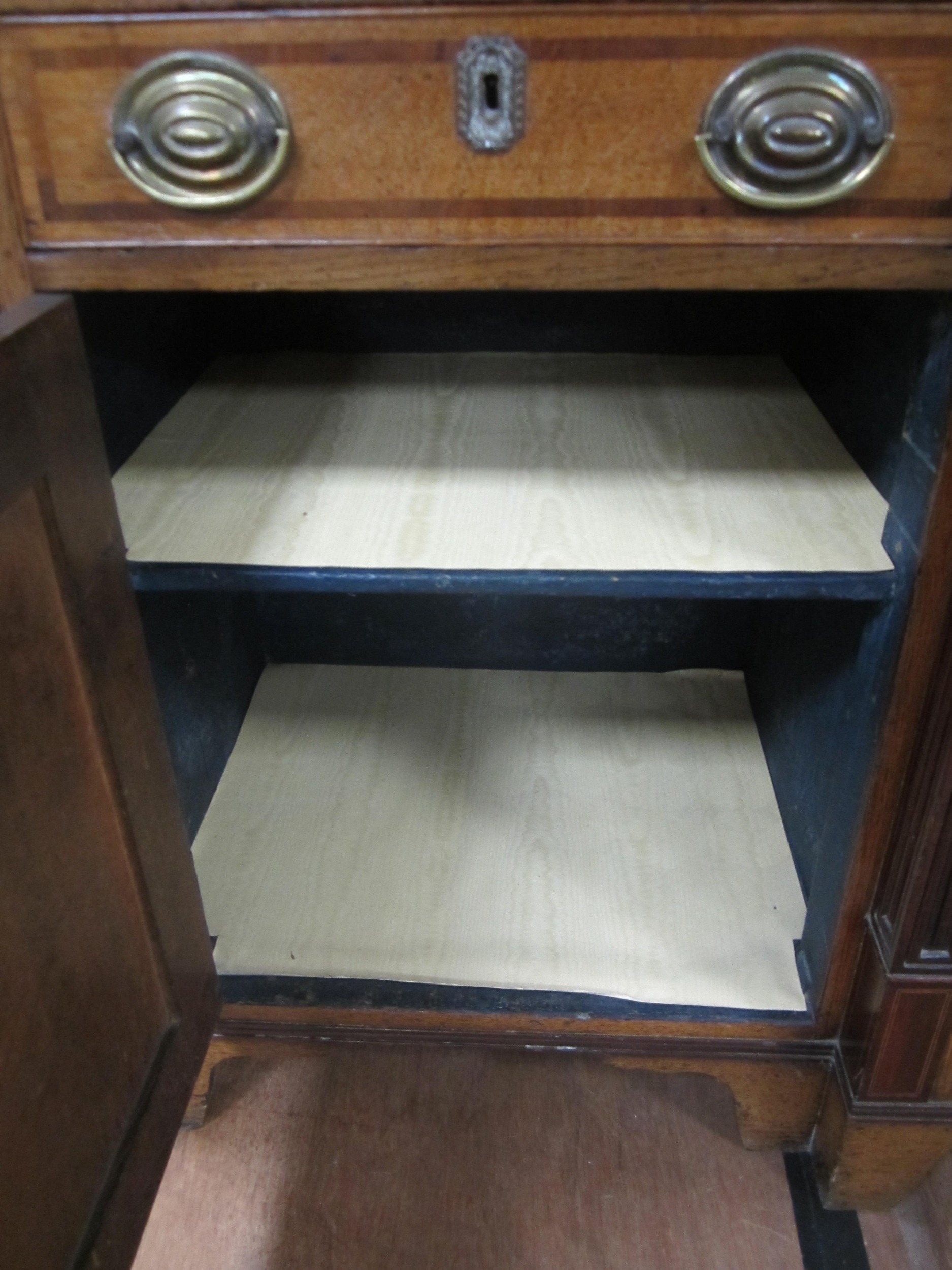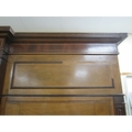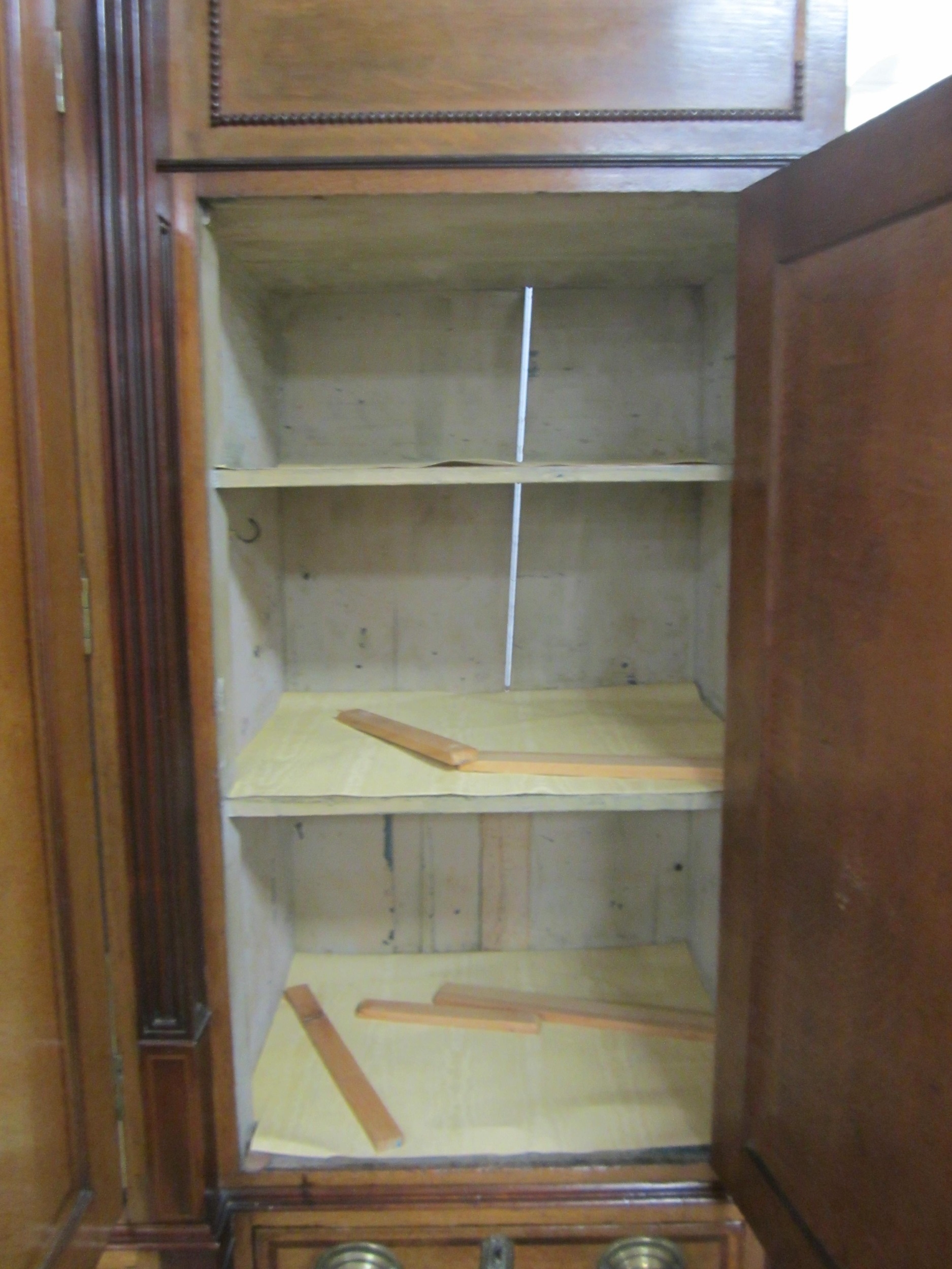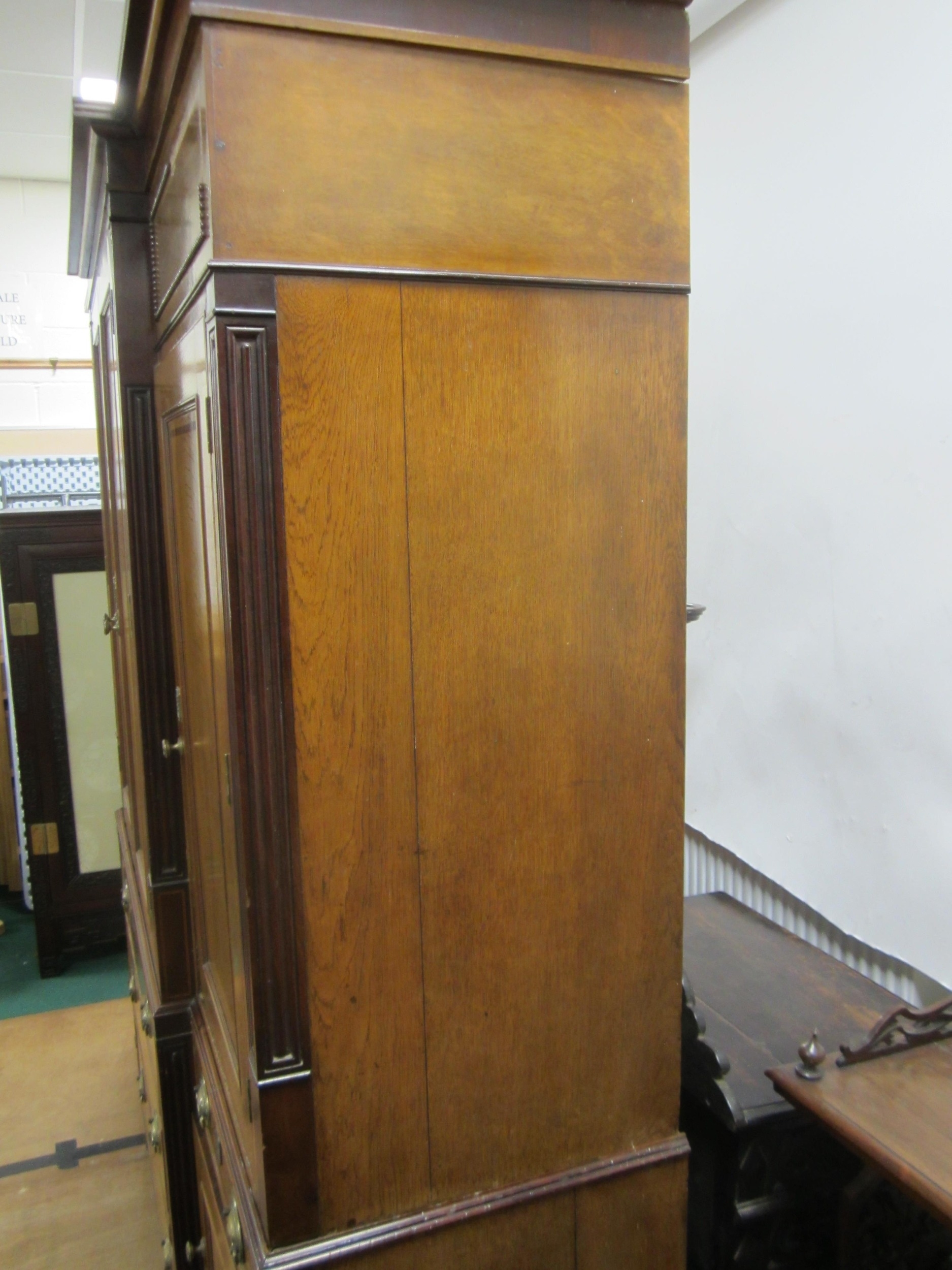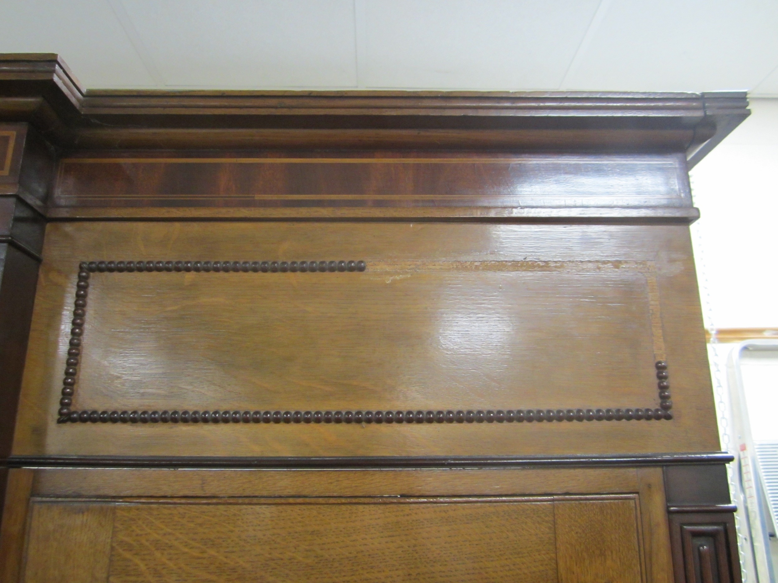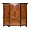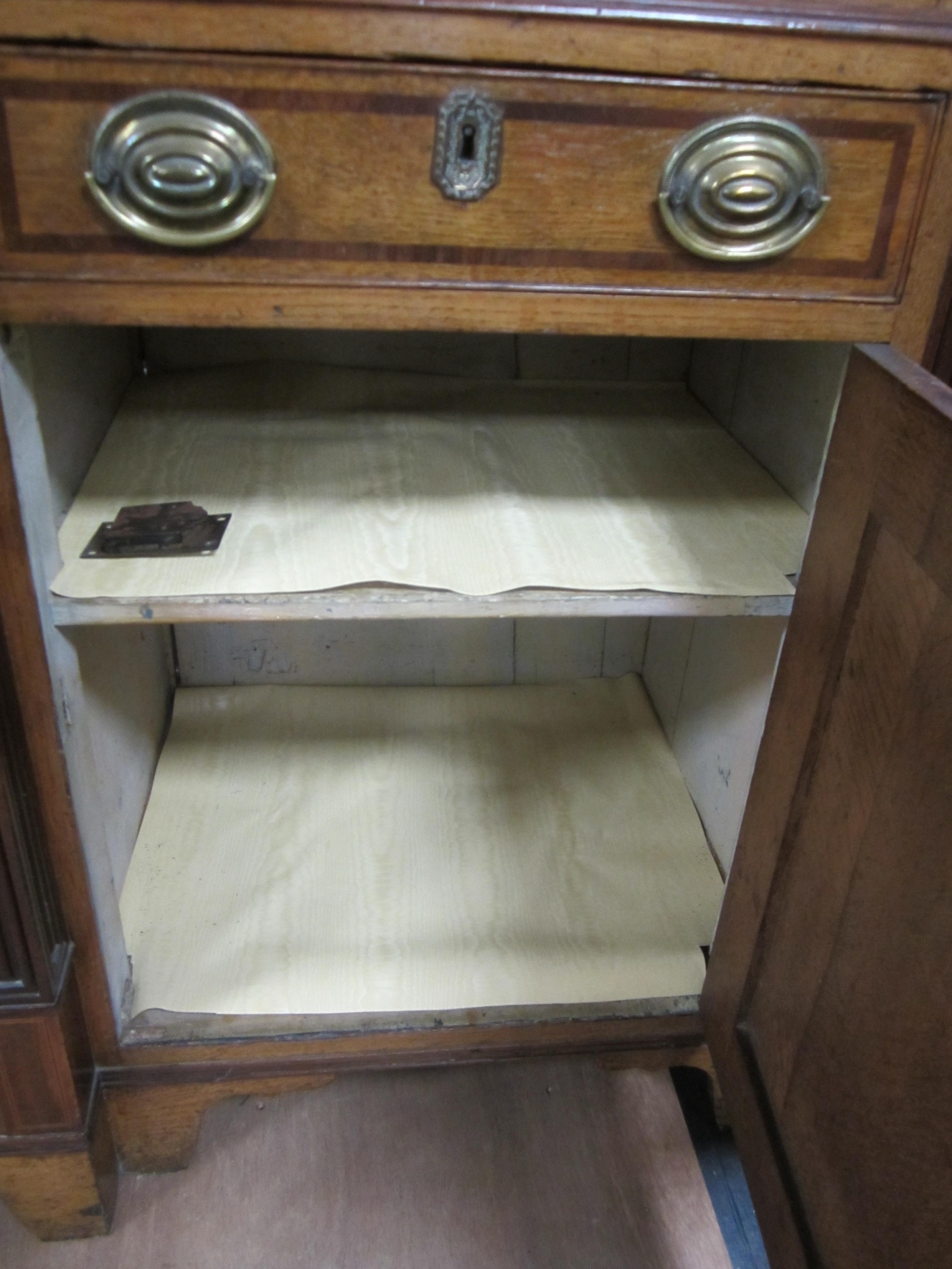 A George III cross-banded oak break-front housekeeper's cupboard The reeded cornice above a mahogany and line-inlaid frieze and twin panelled cupboard doors flanked by conforming single doors, the lower section with three graduated drawers flanked by short drawers and cupboards, bordered by reeded mahogany pilasters, the interior with fixed shelving, raised on bracket feet. 218cm wide x 55cm deep x 206cm high Condition:Generally good with some minor cosmetic marks consistent with age and use. Typical splits to side panels. Section of beading to top right frieze panel loose with a further adjacent small section missing. Drawer handles are later replacements. No keys.