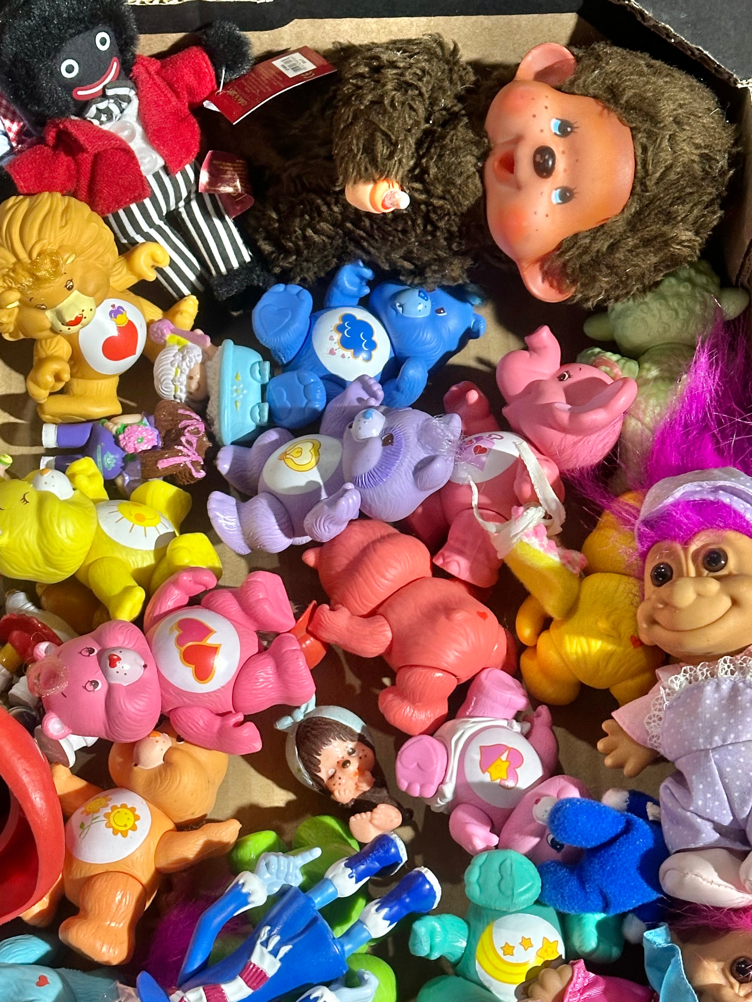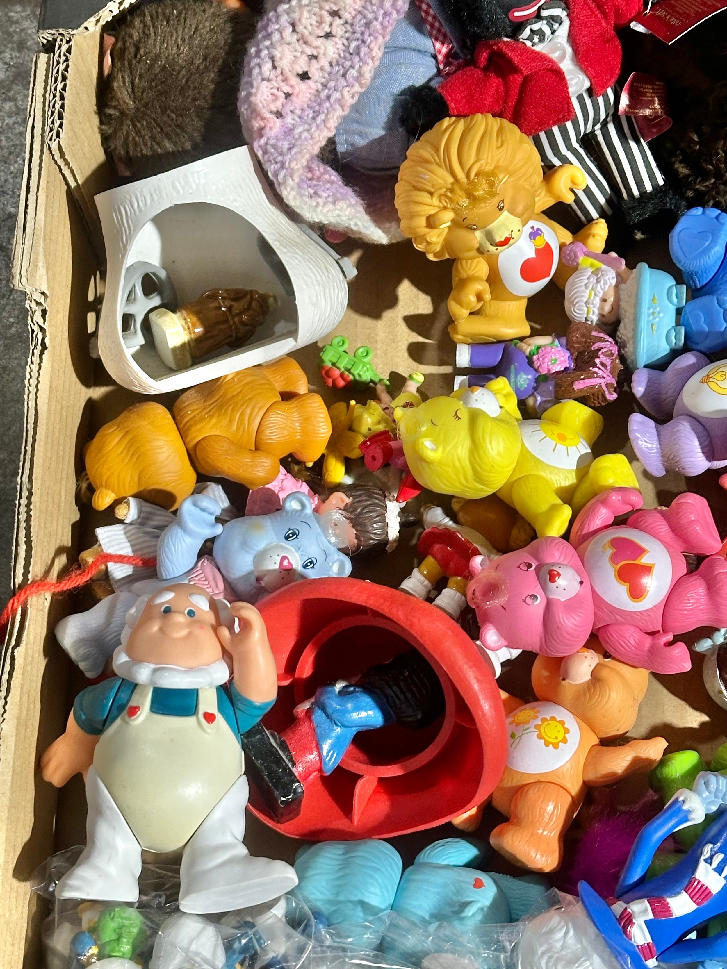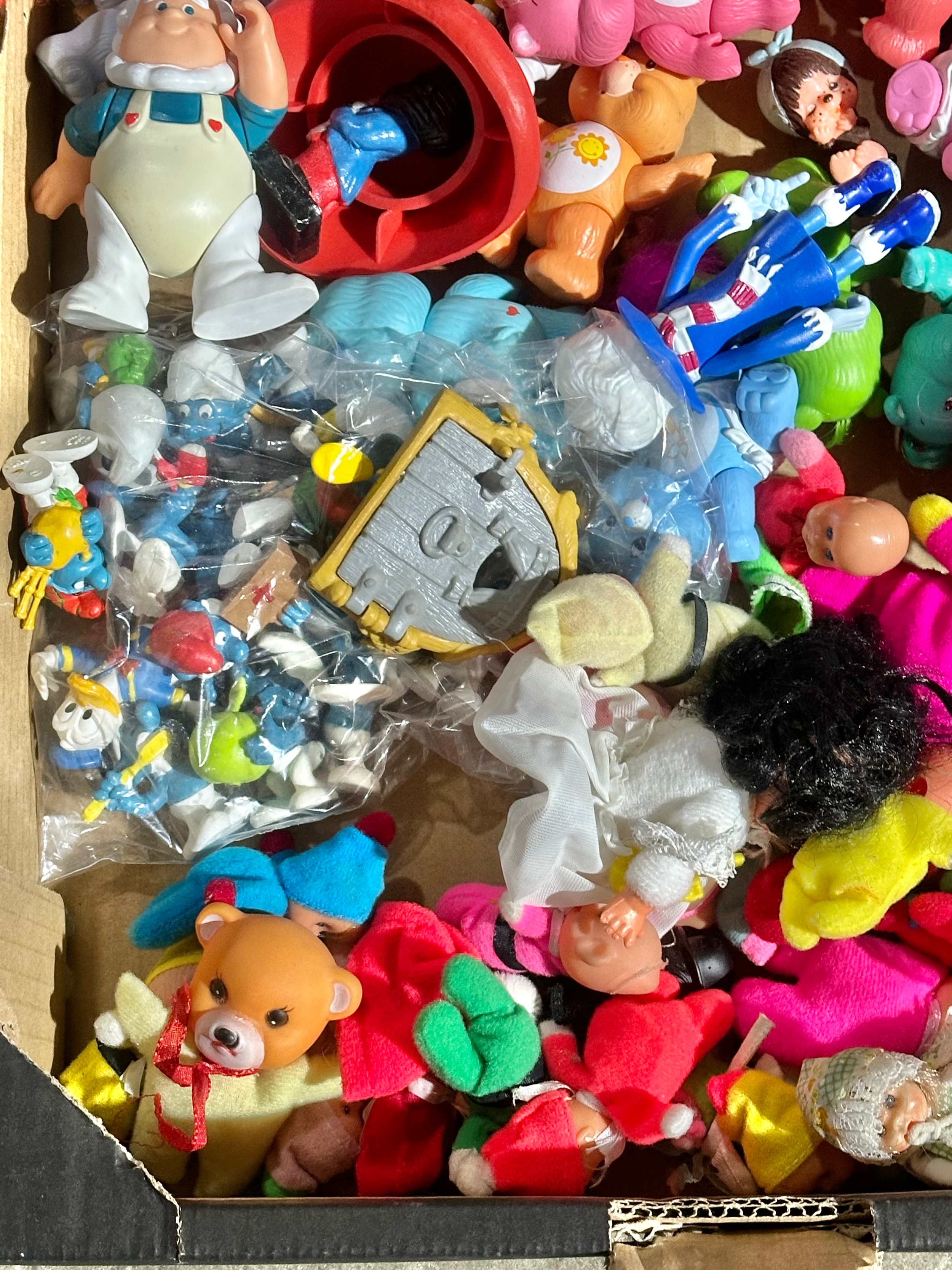 A box of vintage dolls and toys. Care Bears, Smirfs etc