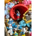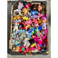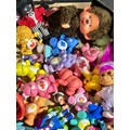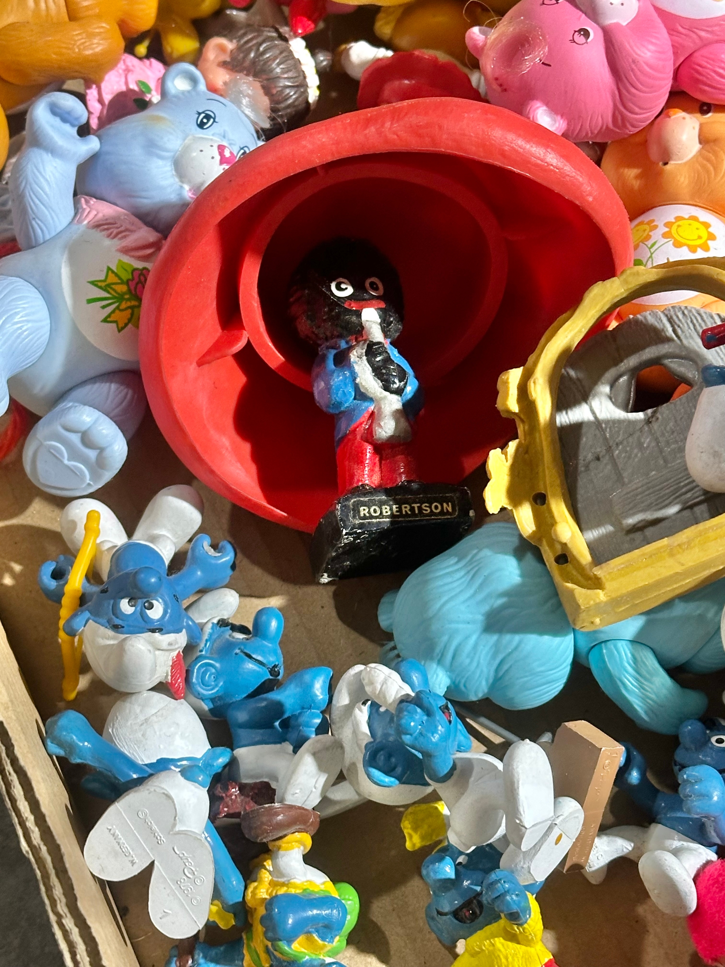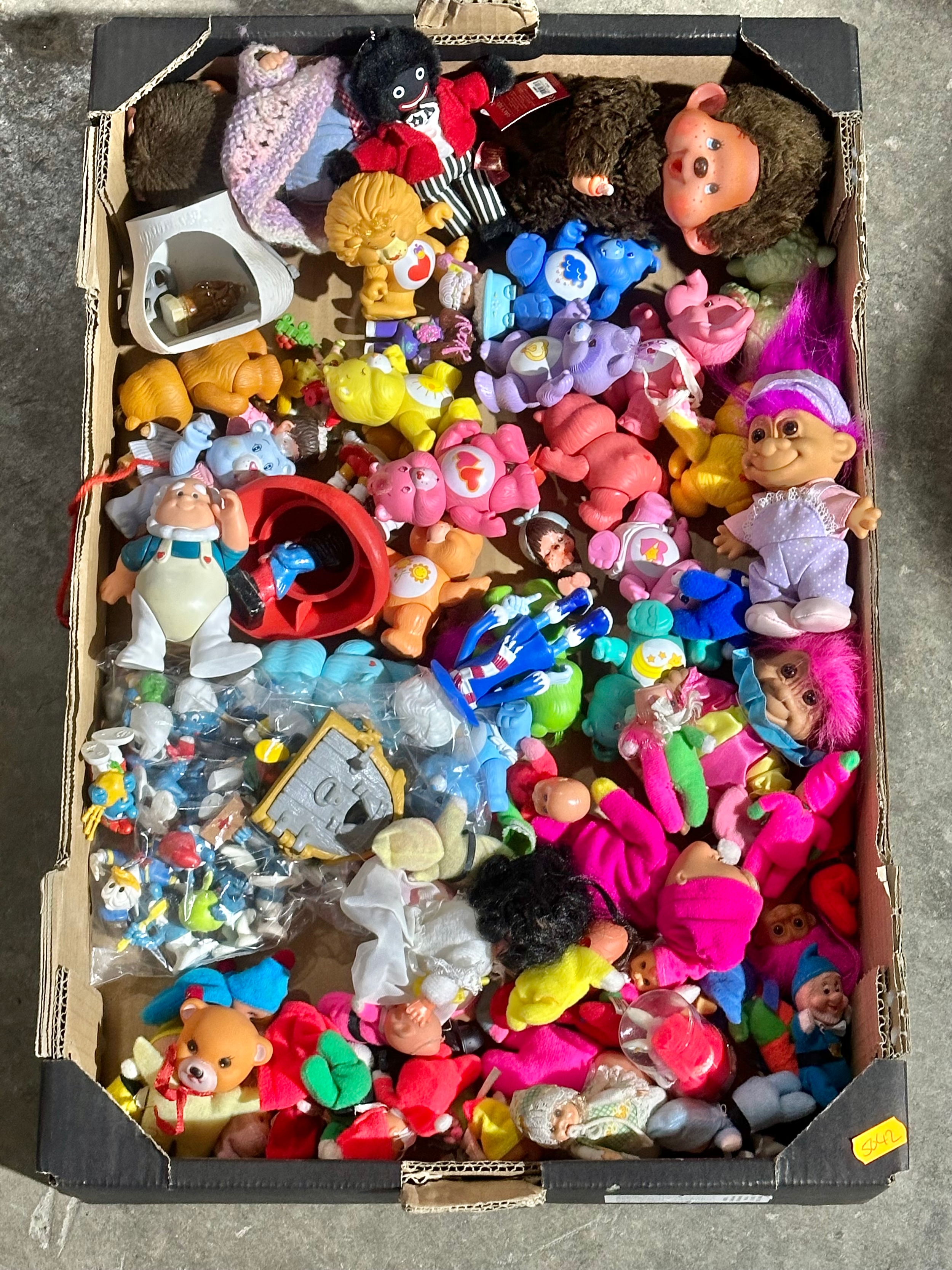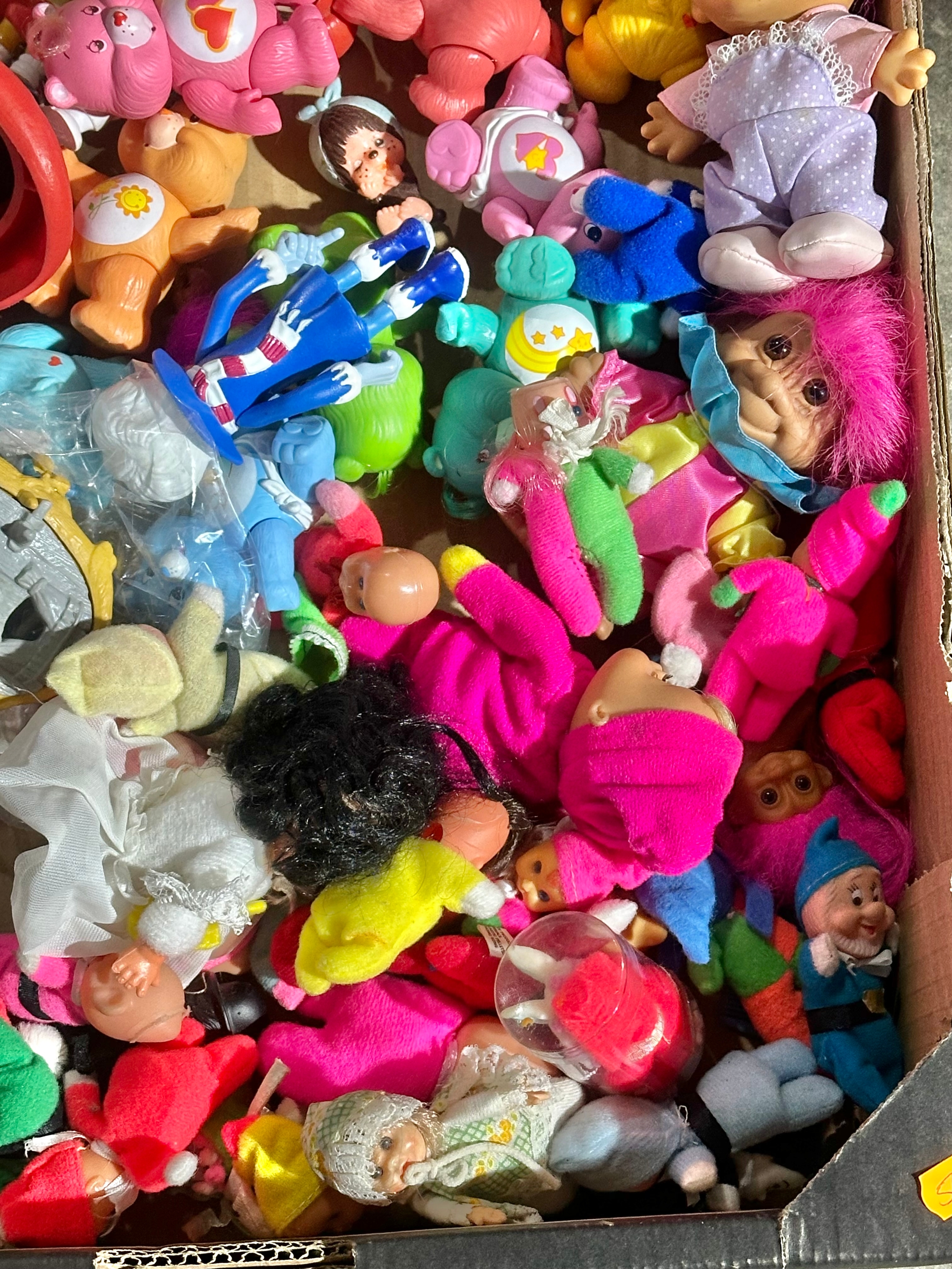 A box of vintage dolls and toys. Care Bears, Smirfs etc