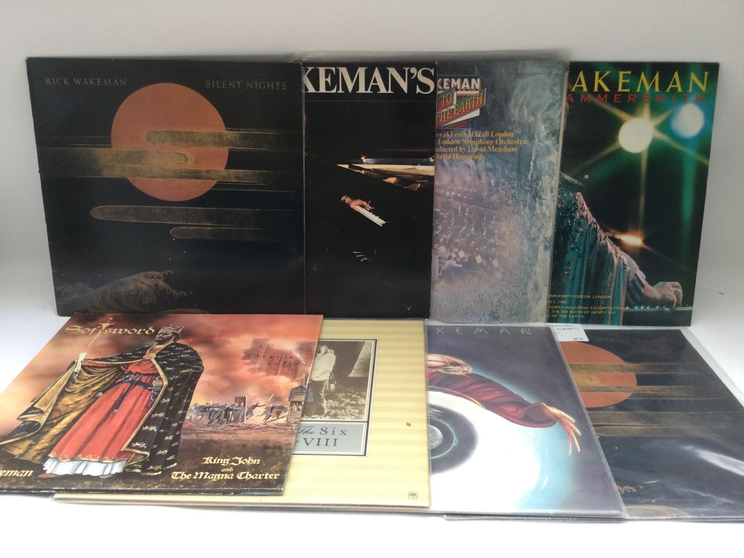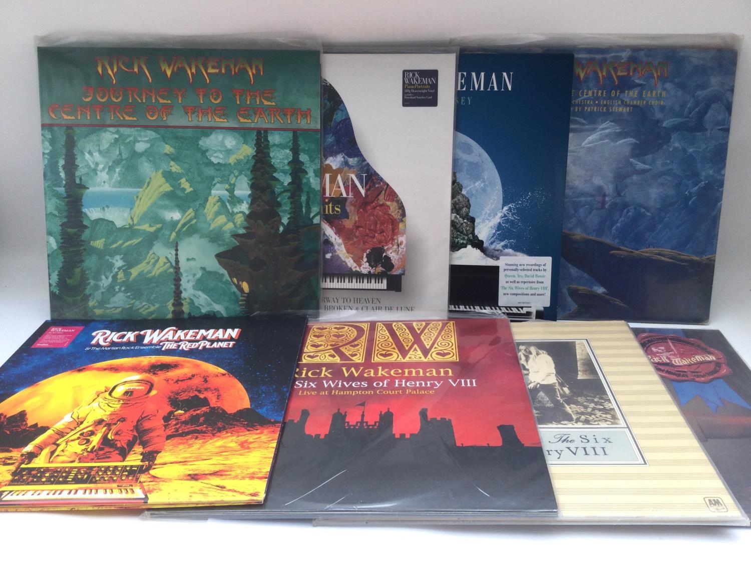 Two bags containing 16 Rick Wakeman LPs comprising 180g vinyl and original pressings.