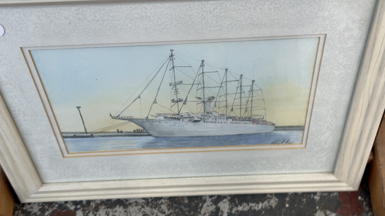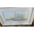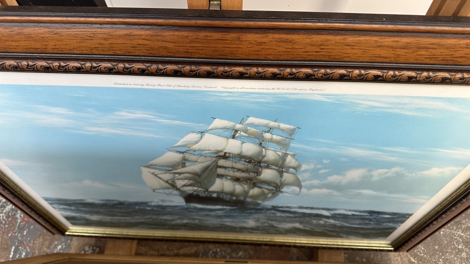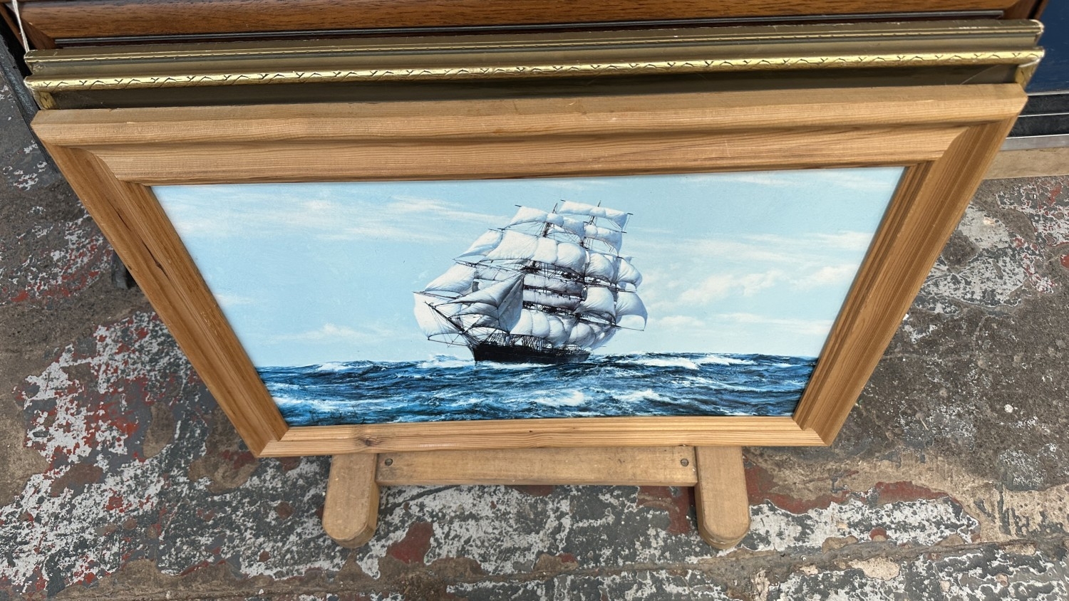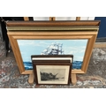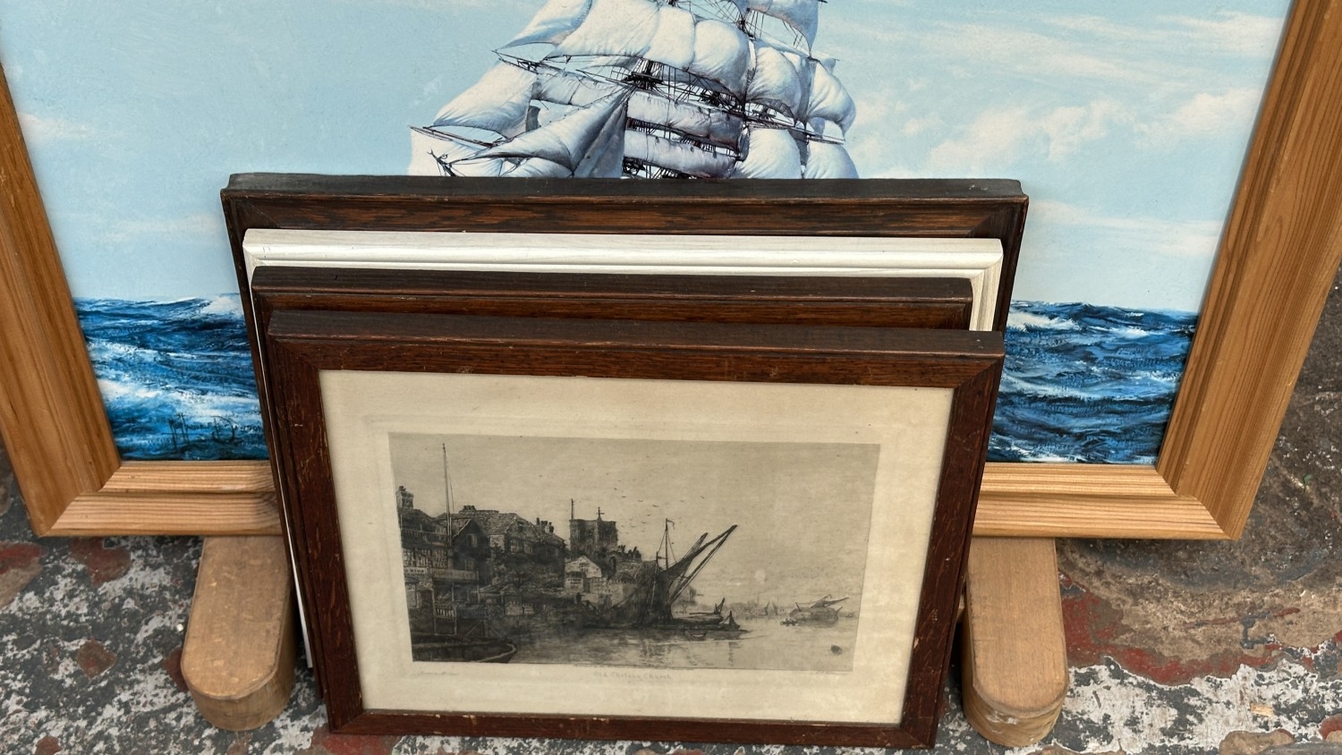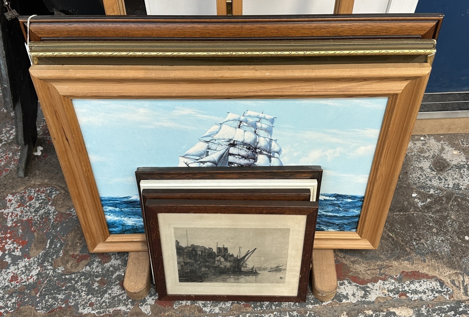 Seven framed pictures, three Montague Dawson prints, two 19th century engravings, one late 19th/early 20th century print and one C.A. Payne watercolour titled 'Windsurf' - largest approx. 62cm high x 83cm wide
