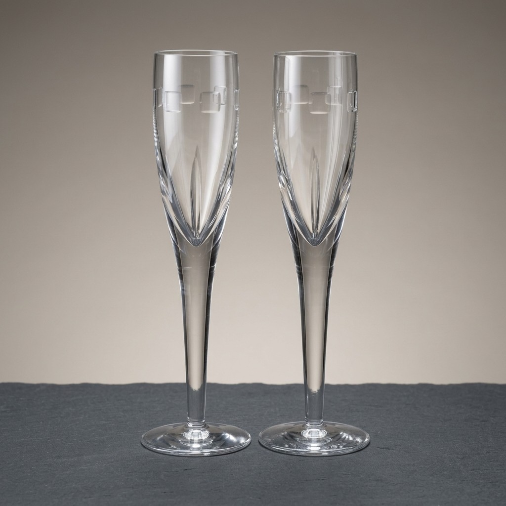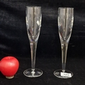 Two elegant John Rocha Waterford Crystal glasses. These flutes are from the Geo Collection. Both in excellent condition with John Rocha Waterford Crystal acid marks.