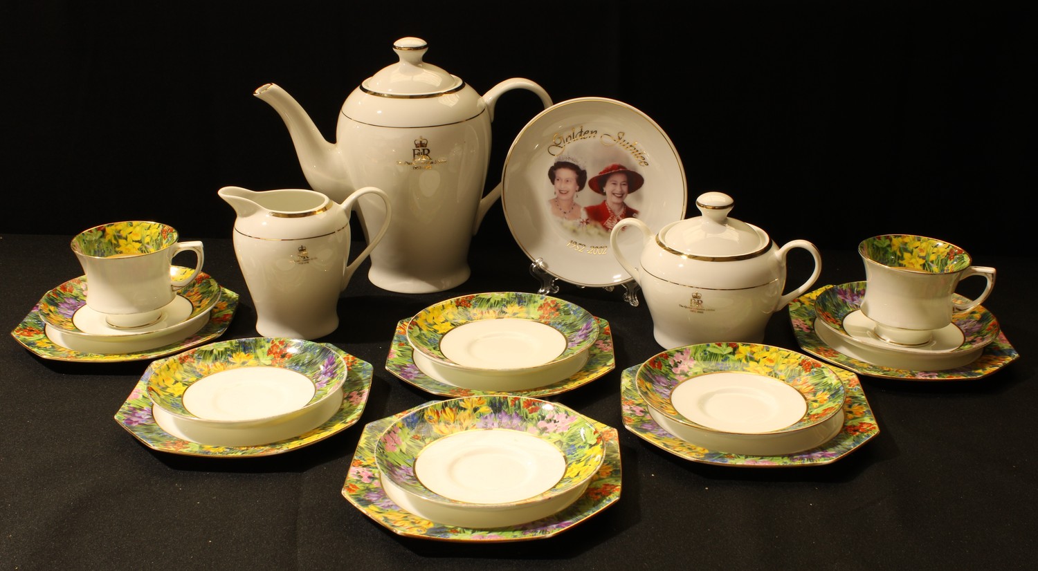 A Royal Paragon floral printed tea set, replica of one produced for HM The Queen; a commemorative Golden Jubilee coffee set, including coffee pot; a similar plate