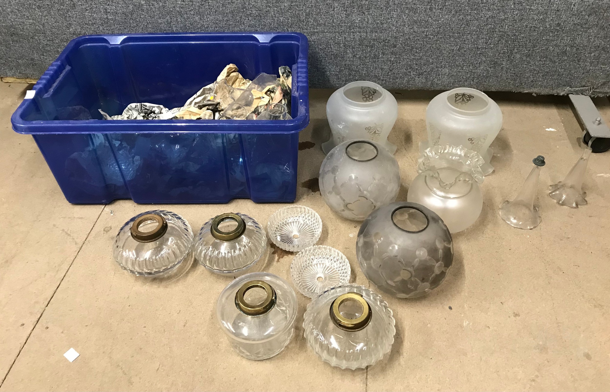 Assorted glass light shades, oil lamp reservoirs, etc.