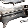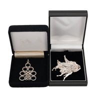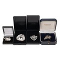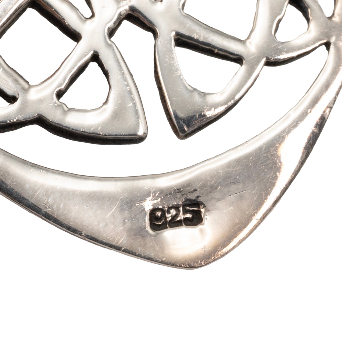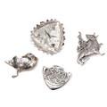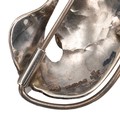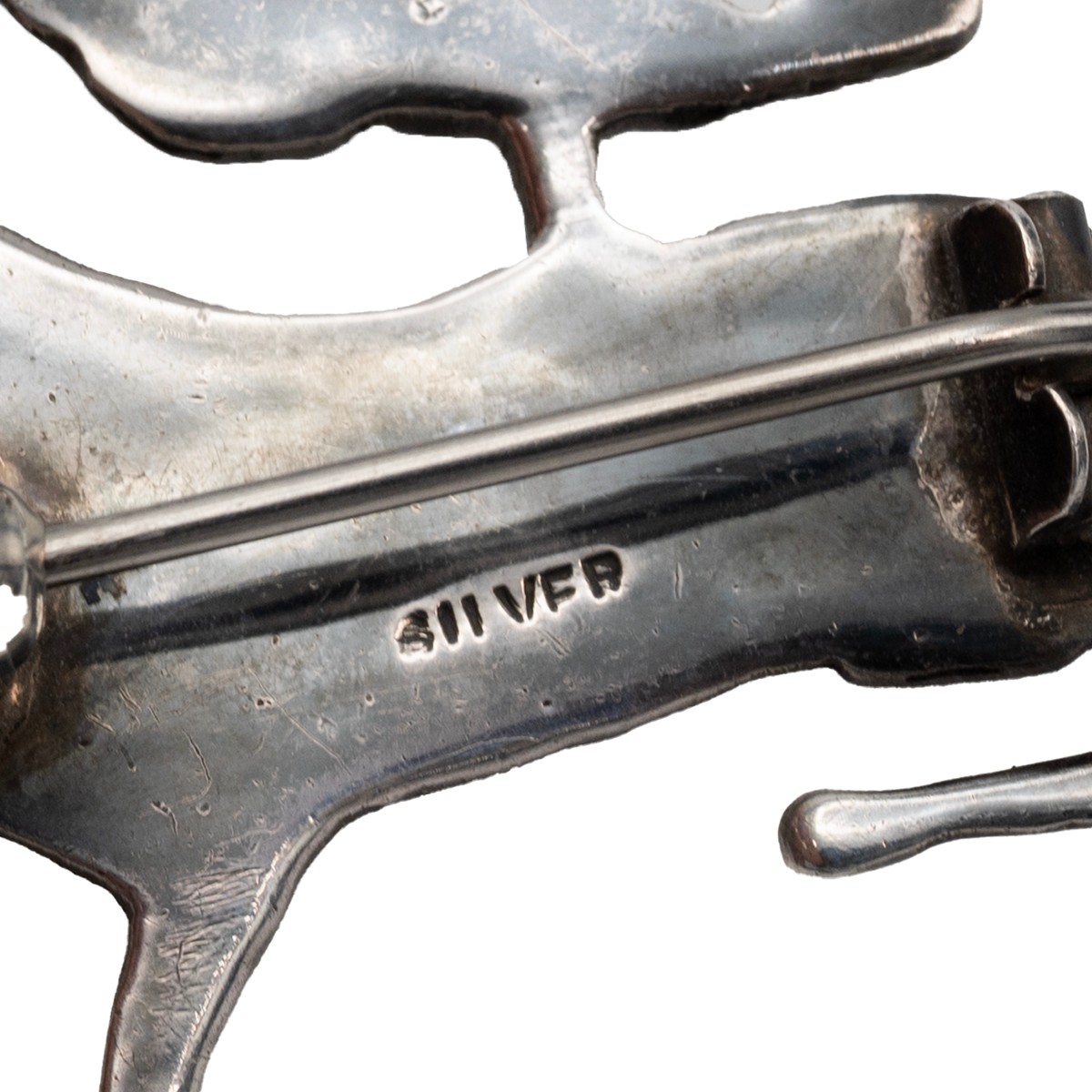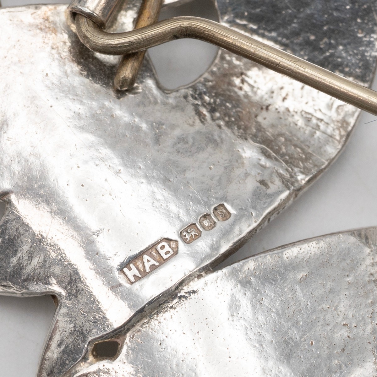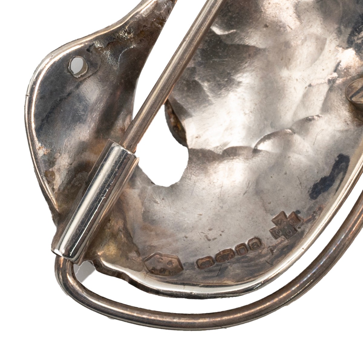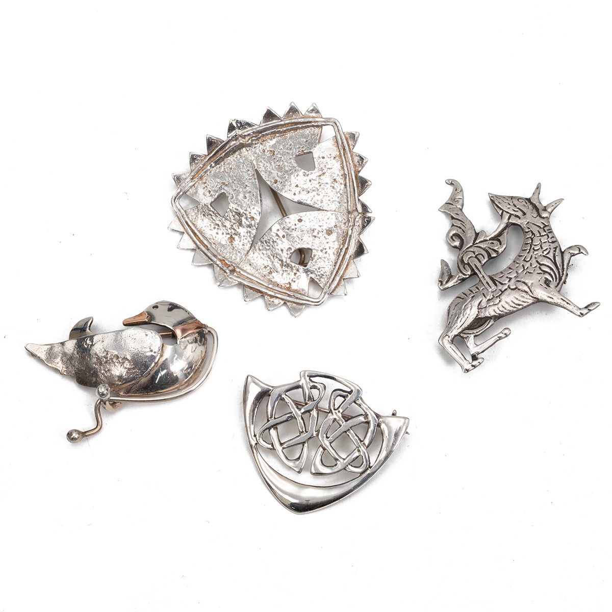 A modernist silver brooch of triangular form with pierced decoration and triangle border, hallmarked London 1973, sponsor mark HAB; a Scottish Islands Celtic silver Maeshowe dragon brooch stamped silver; an Andrew J Wright British modernist designed silver and gold duck brooch, incorporating an ingenious separate fastening design, hallmarked London 2001; a vintage British craftsman made silver brooch of shield shape with abstract design and textured surface.