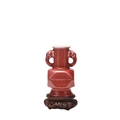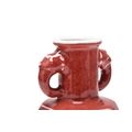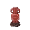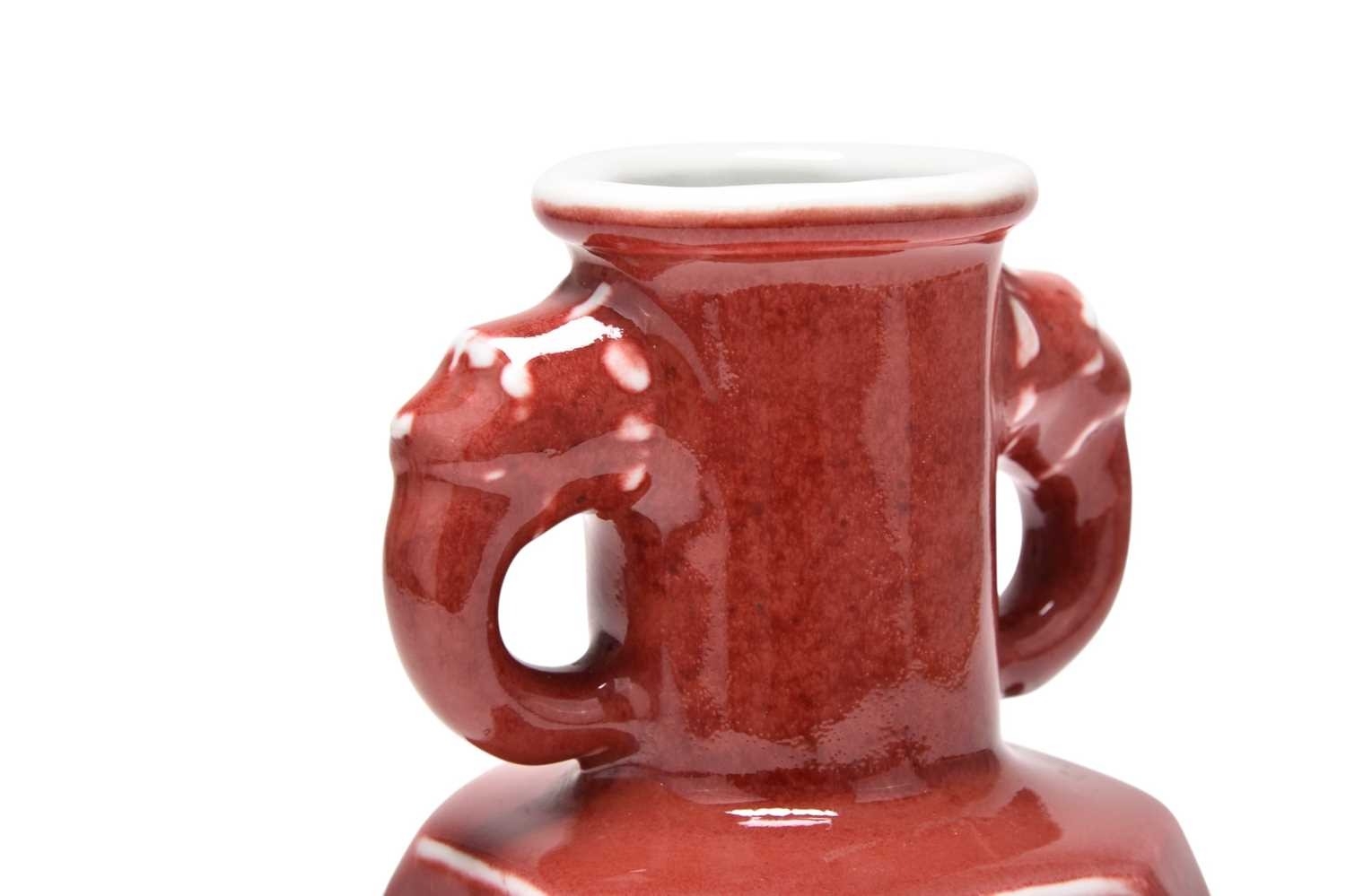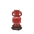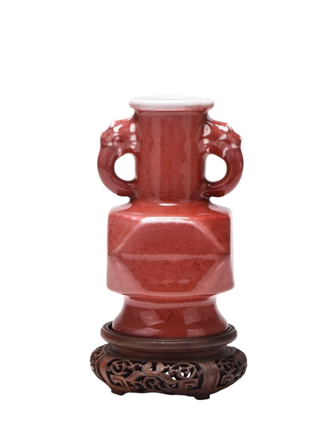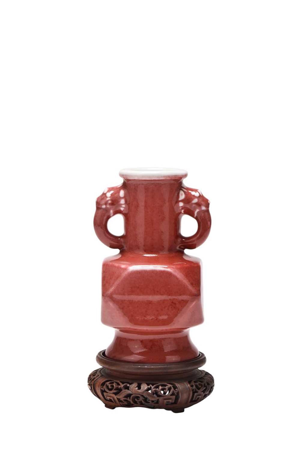 A Chinese copper red glazed Hu-form vase Qing Dynasty The cylindrical neck applied with twin dragon-head handles, the body of faceted form above a spreading foot, covered in a slightly mottled copper red glaze, thinning at the rim and handles. With carved hardwood stand. 18cm high