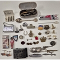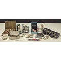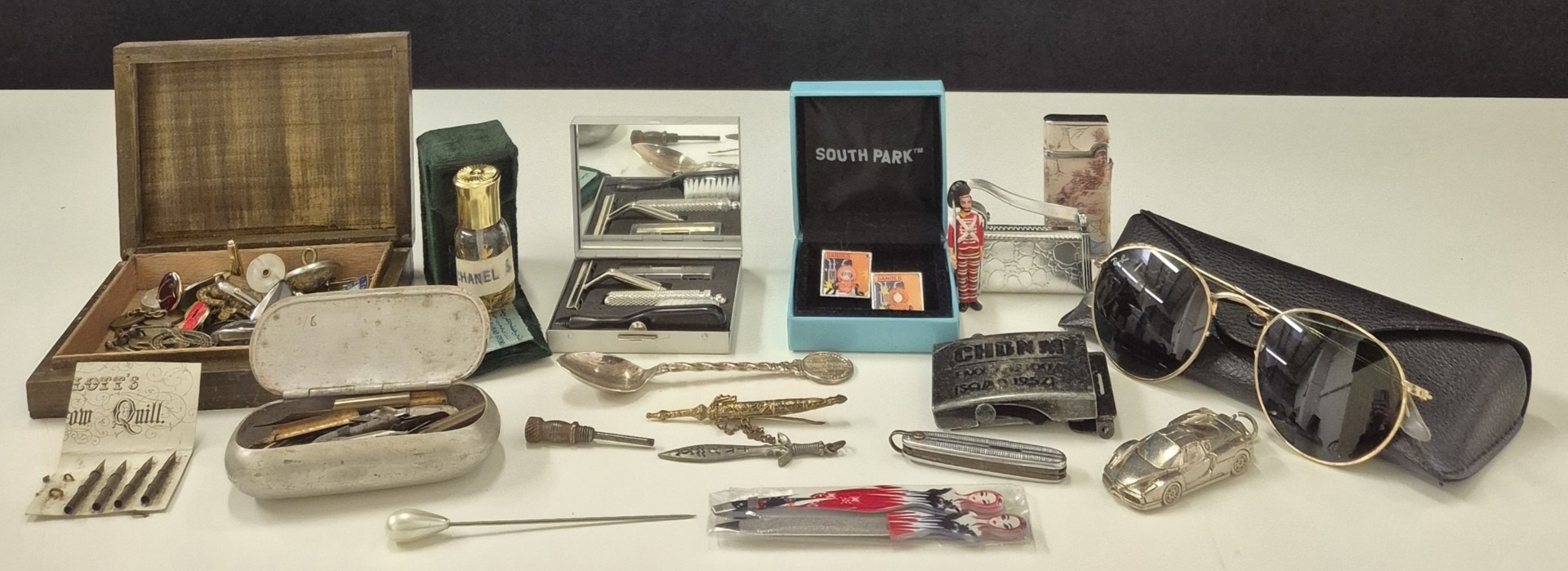 Mixed lot of vintage accessories, etc. To include fountain pen nibs, cufflinks, grooming kit, hat pin, lighters, penknife, Ray Ban sunglasses, miniature Chanel; perfume, etc.