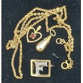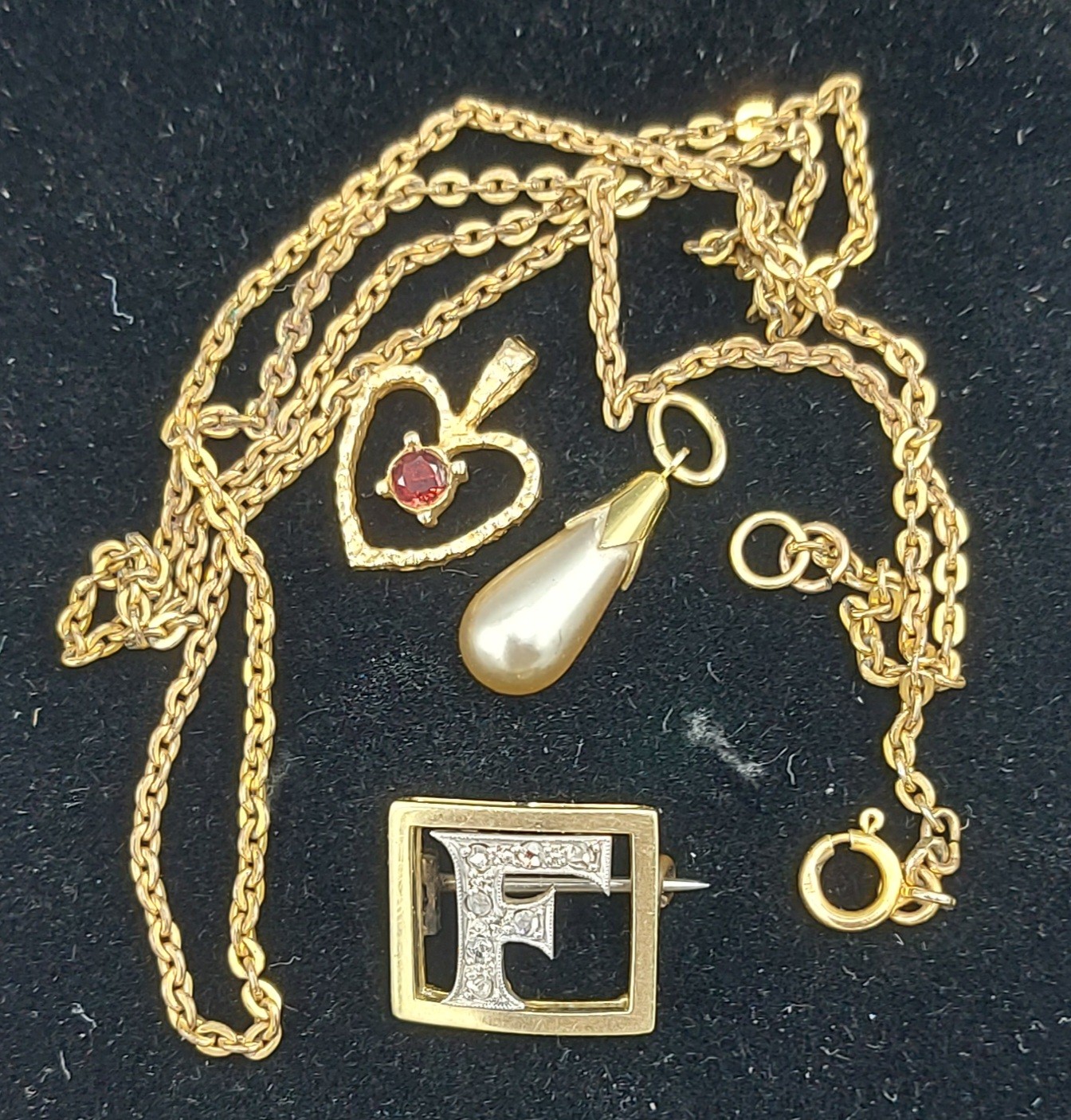 A Diamond set brooch in the form of the letter F together with a 9ct gold linked neck chain and two 9ct gold pendants, 6.2g