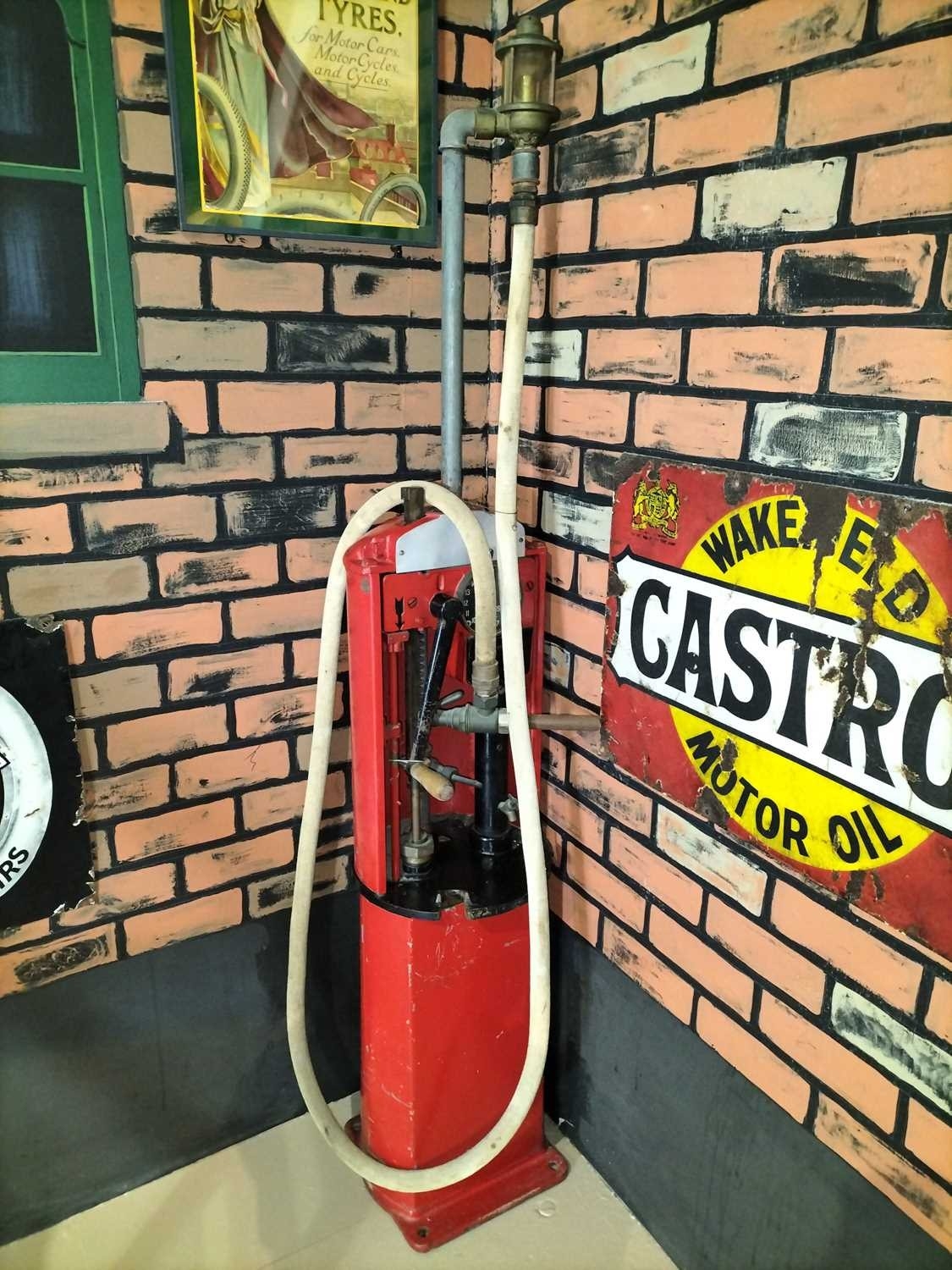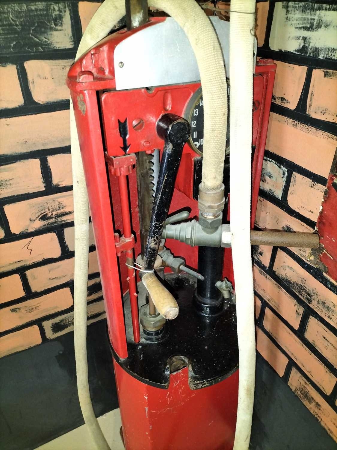 ± A hand cranked petrol pump from Flambards Garage. Height 200 cm. Please note that all lots in this auction from Flambards are subject to an additional standard rated VAT charge of 20% on the hammer price This item was from Flambards, the iconic Cornish institution which sadly closed its doors in November 2024. Lays Auctioneers proudly hosted the contents sale back in March 2025, and unexpectedly have some final lots for sale in this antiques sale. A wonderful last chance opportunity to own a piece of local history.