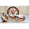 A Royal Crown Derby 1299 pattern small salt pig 9cms high, c.1905; a Royal Crown Derby teacup & suacer decorated in the Imari pallete, red painbted marks c.1820