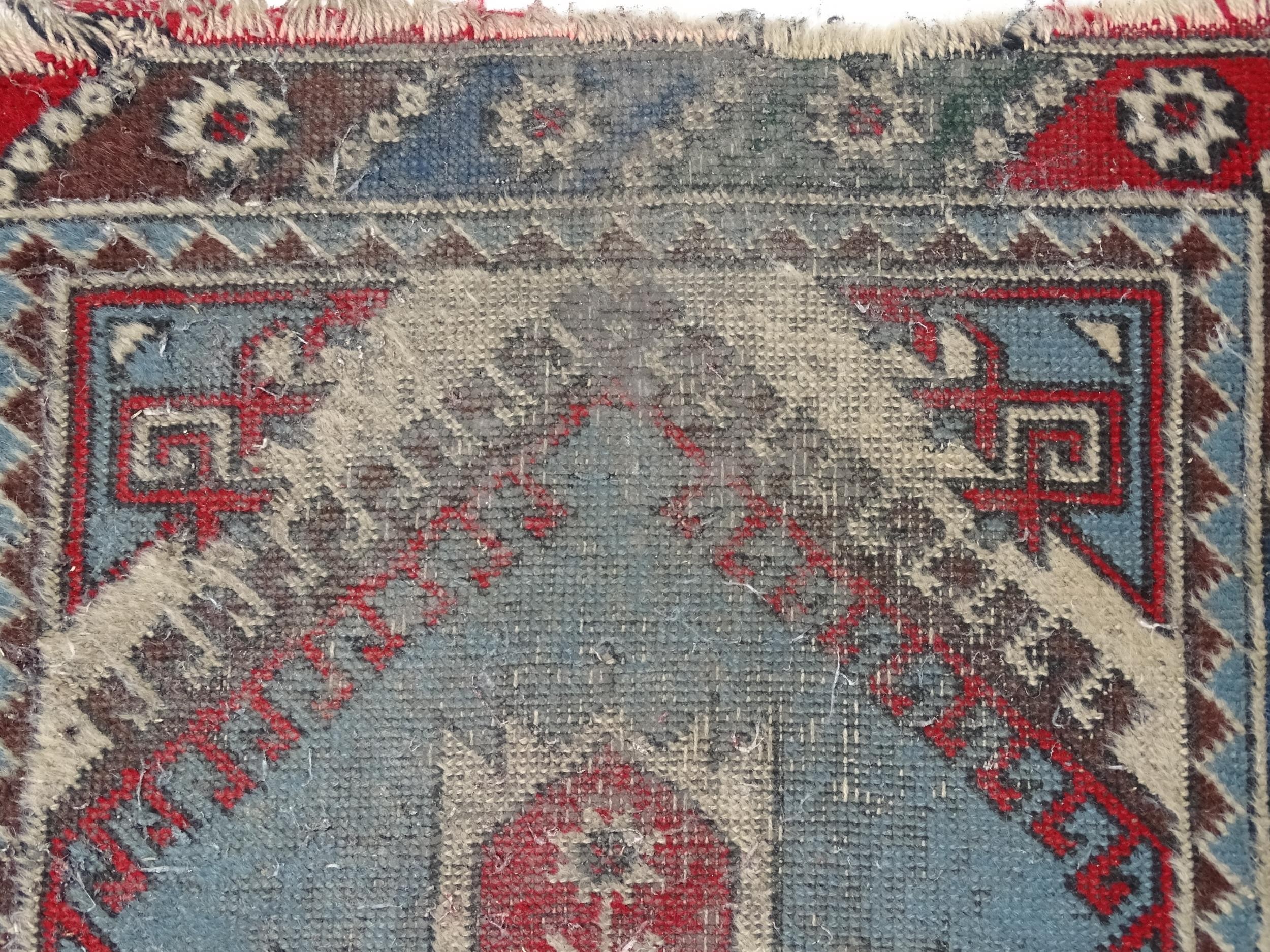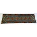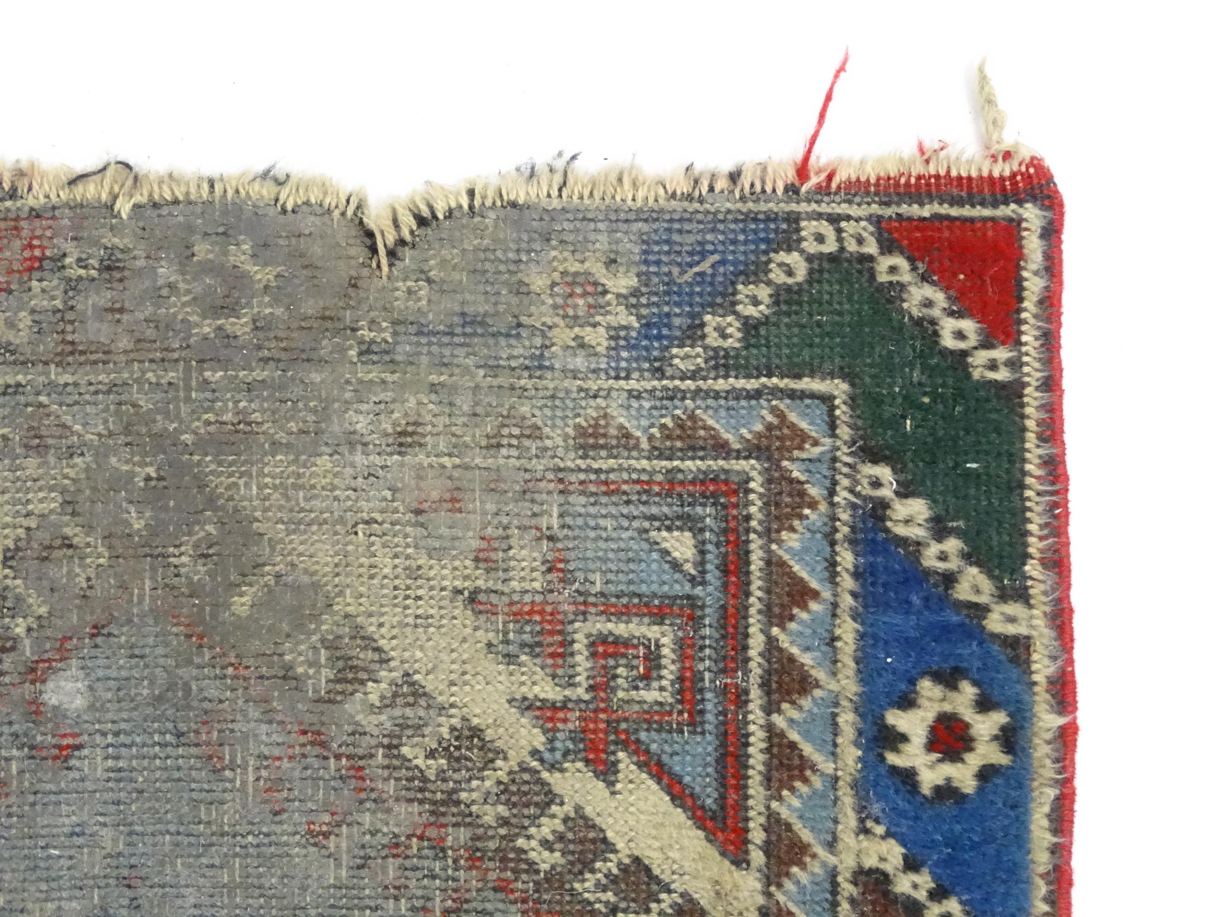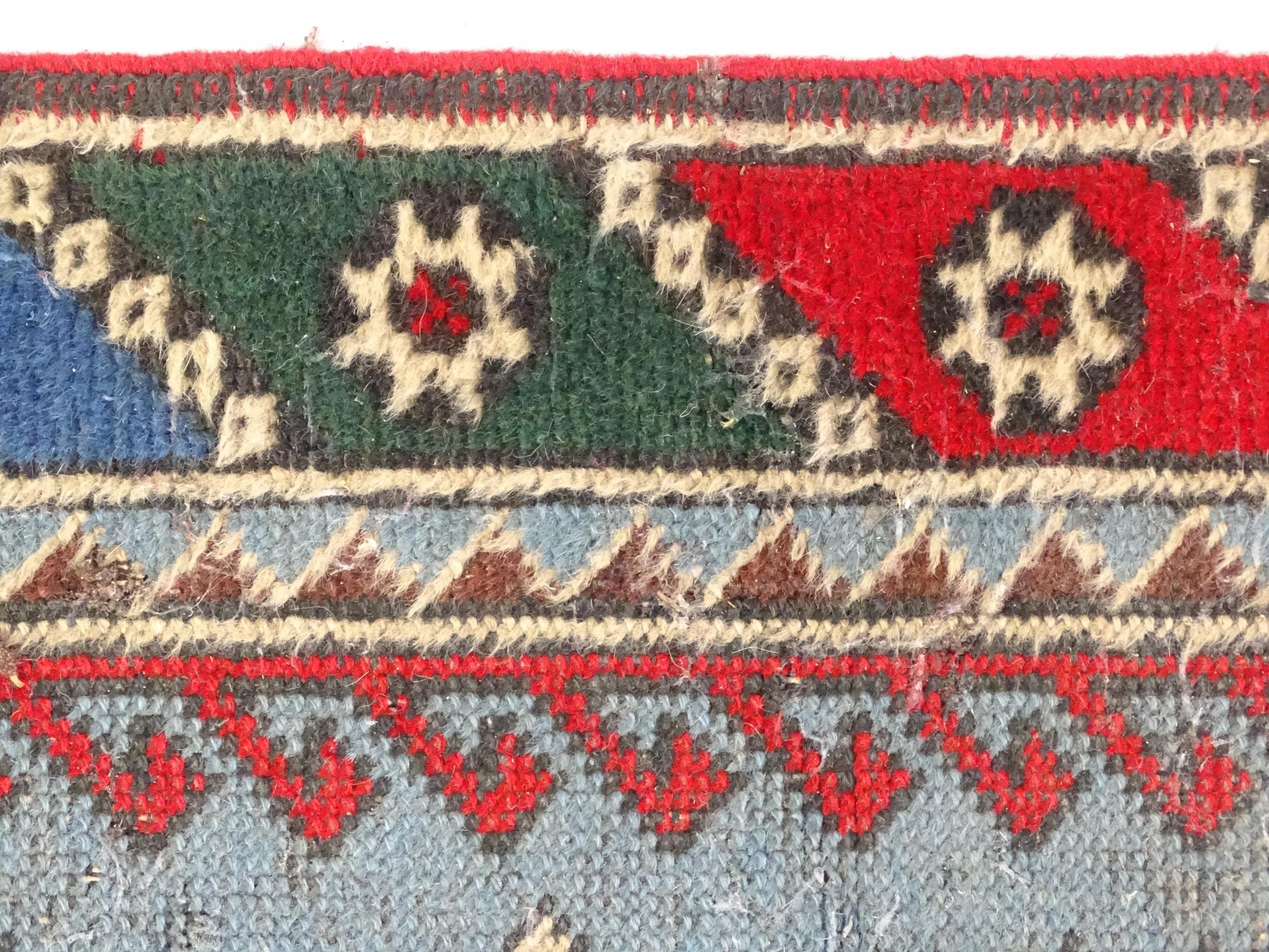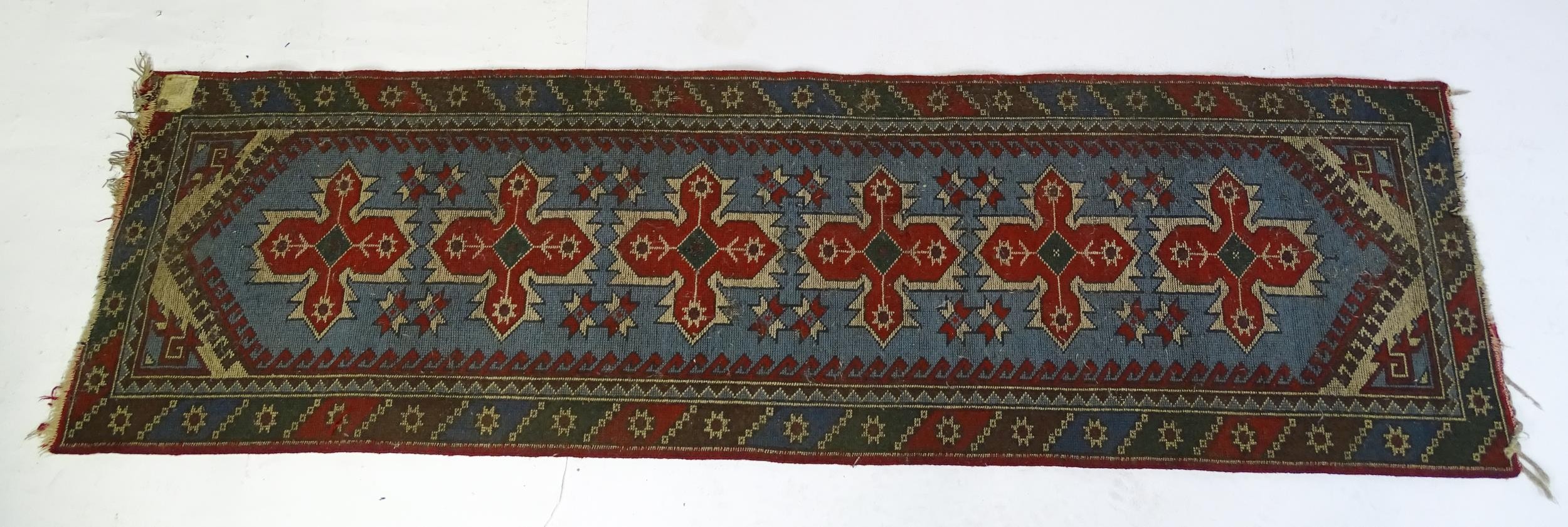 Carpet / Rug : A pale blue ground runner decorated with repeating geometric motifs and banded borders. Approx. 111" x 30 1/2"