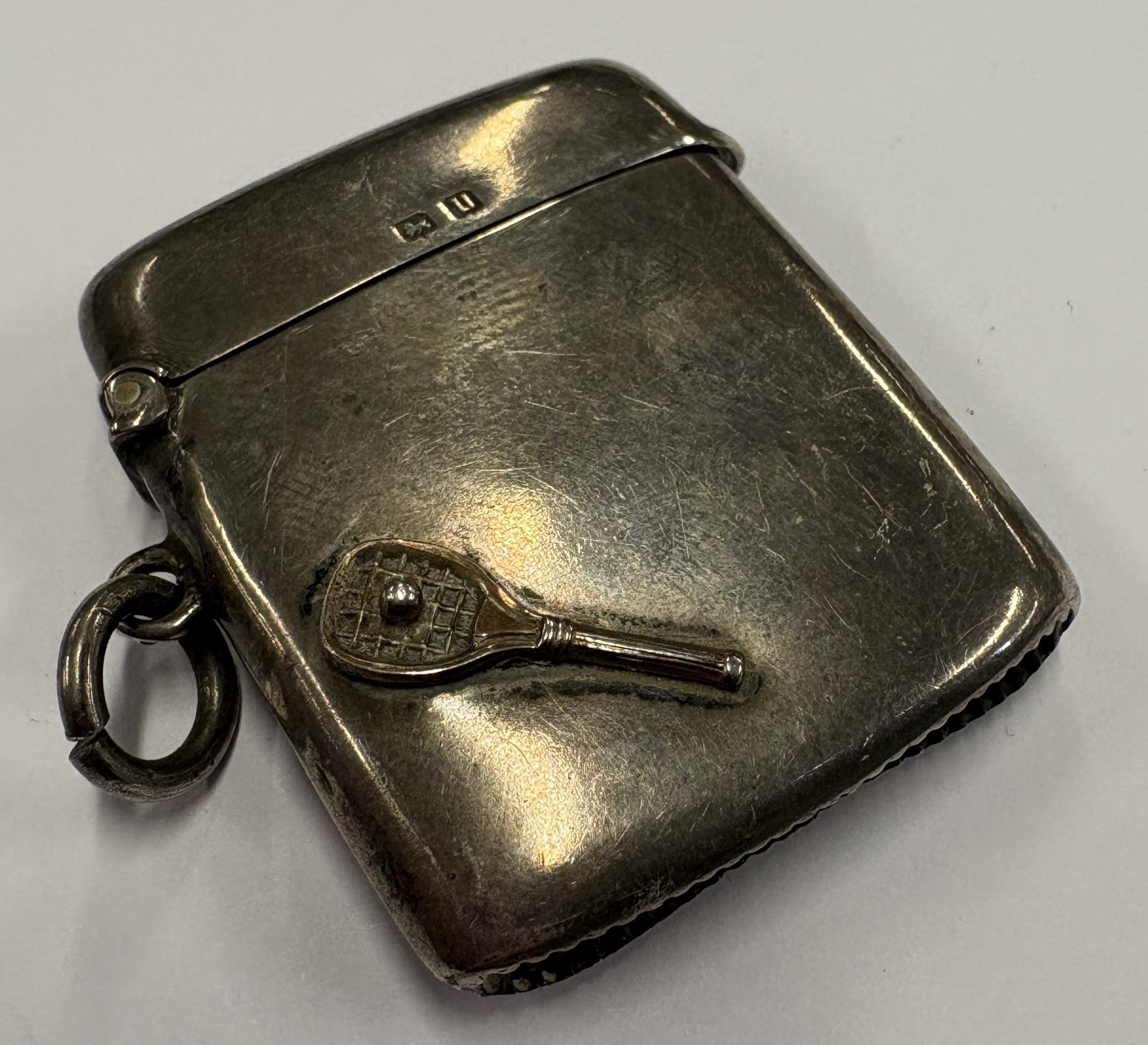 A silver vesta case decorated with a tennis racket. Birmingham 1915. By TM & Co. Approx. 27 grams. Est. £80 - £120.