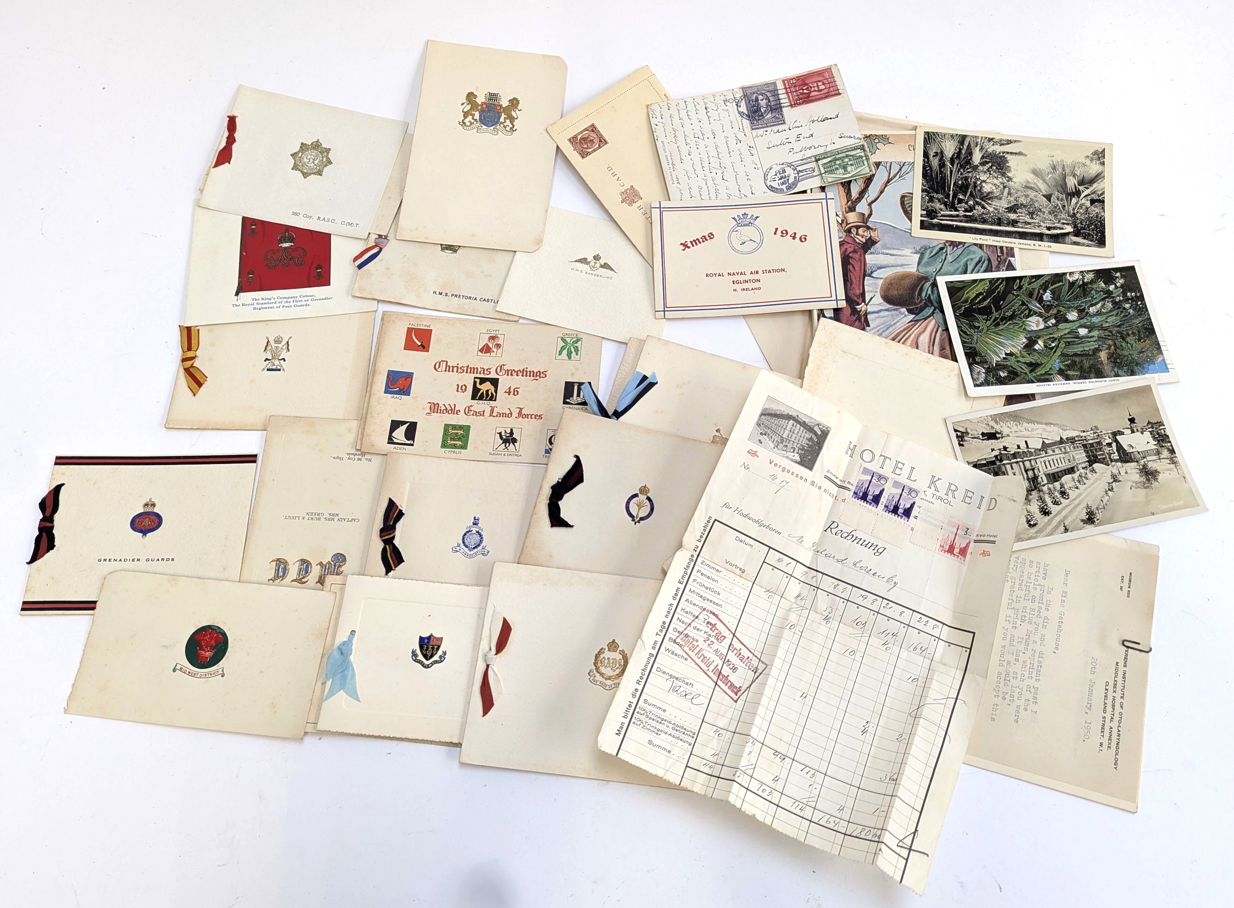 PAPER EPHEMERA. A small group inc. the main interest: a group of 'crested' Christmas cards from various institutions and senders. Some signed: e.g. Lord Mayor of London, a naval aircraft carrier, London clubs/institutions etc. Well-preserved. 1945-46 in the main.