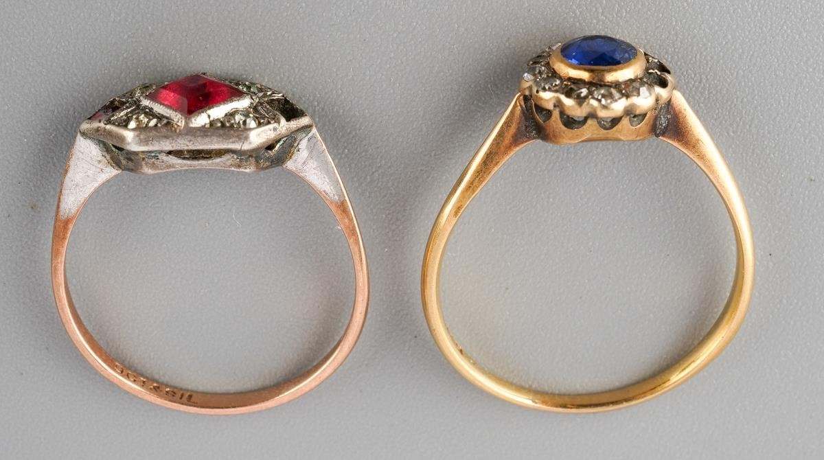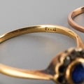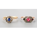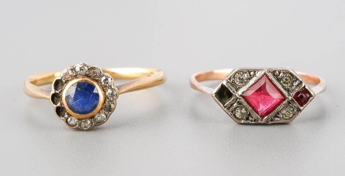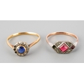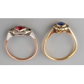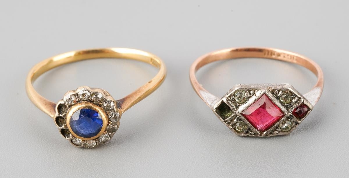 An early 20th century 18ct gold sapphire and diamond cluster ring, together with a paste set ring. The first set with a circular shape blue sapphire bordered by old cut diamonds (some diamonds missing, ring stamped 18ct), together with a paste set ring (some paste missing, stamped 9ct sil), J and L 1/2, approx gross weight 3.1 grams.