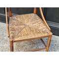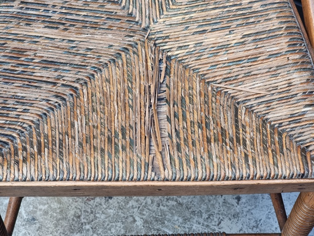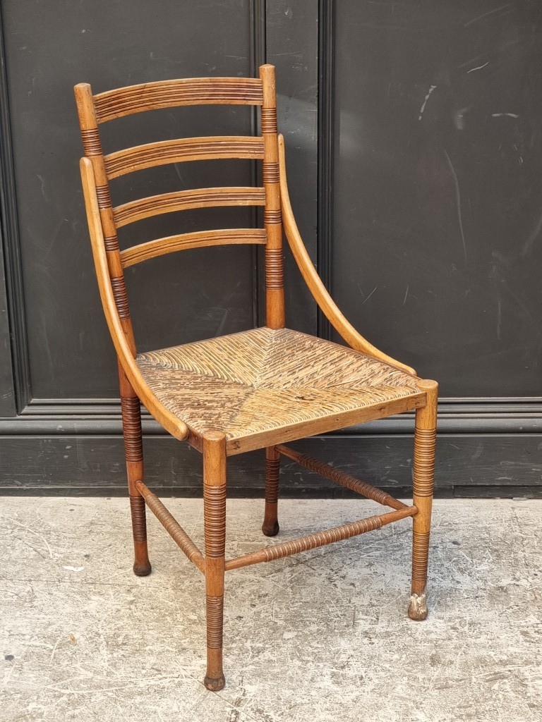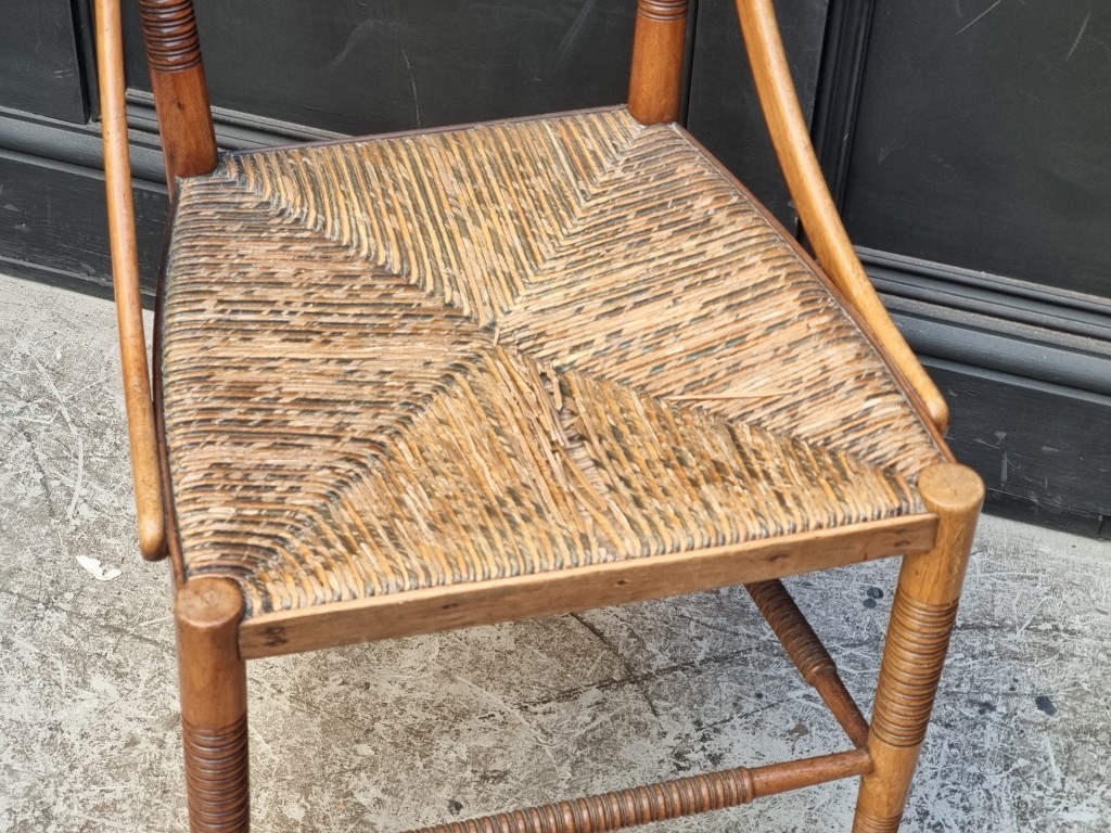 An unusual late Victorian turned mahogany, walnut and rush seated side chair.