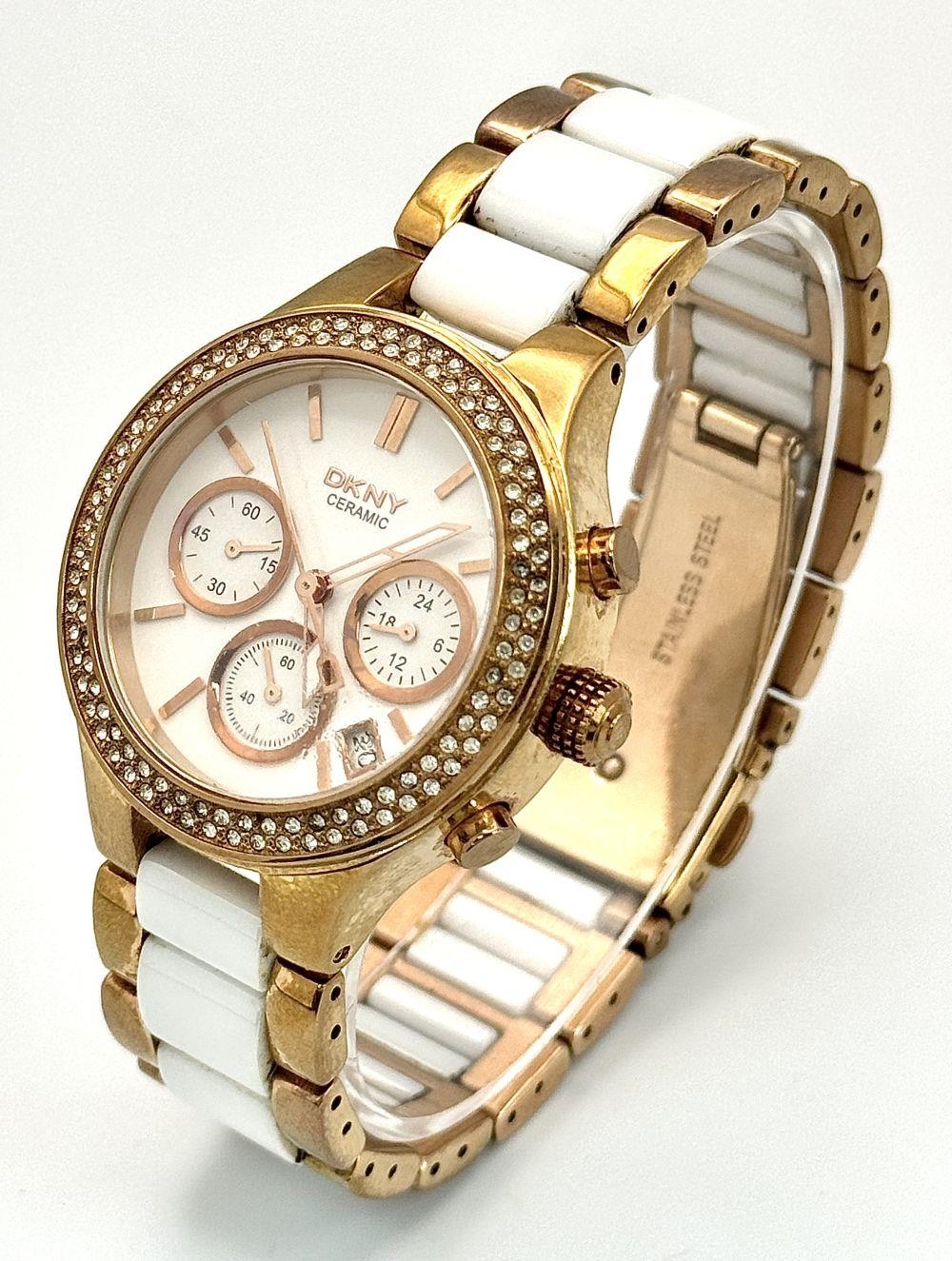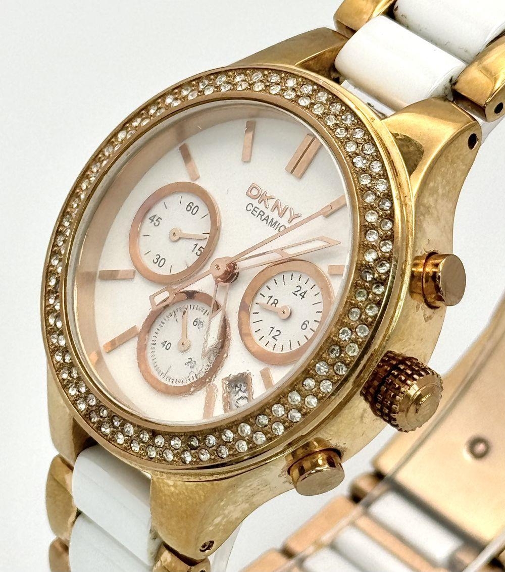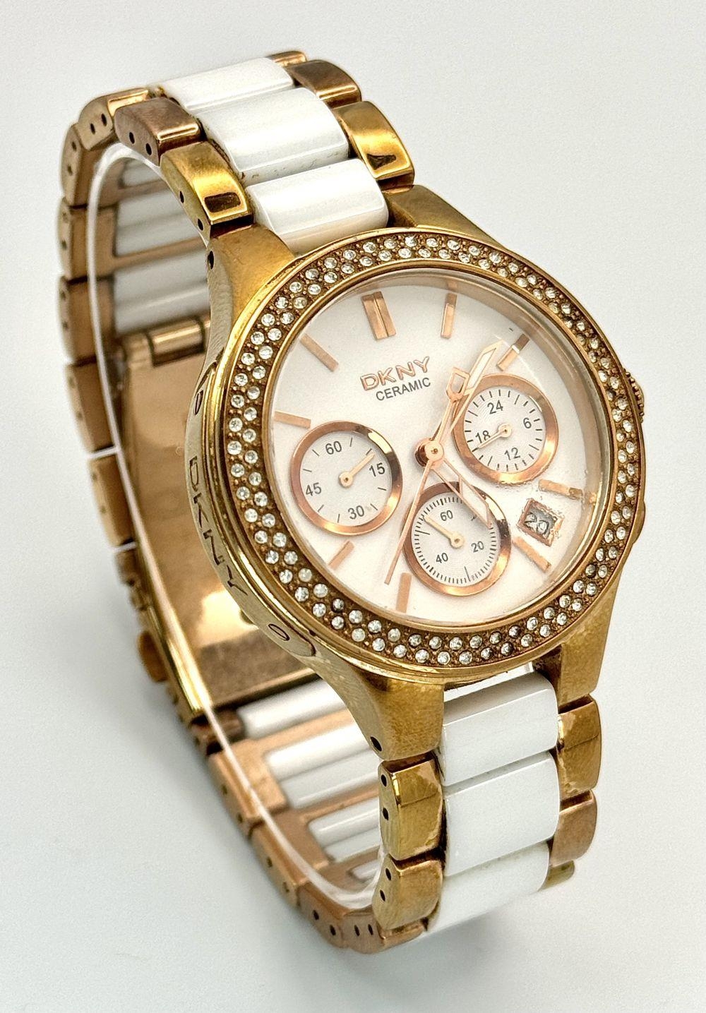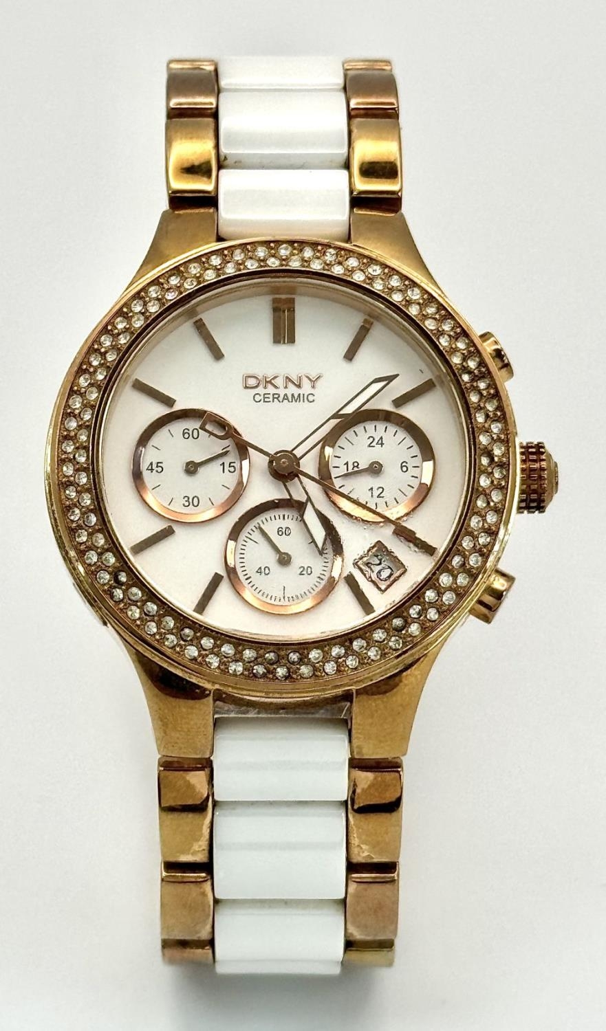 A rose gold plated, Ceramic DKNY Chronometer watch, 38 mm case, bezel with cubic zirconia, white dial with three