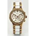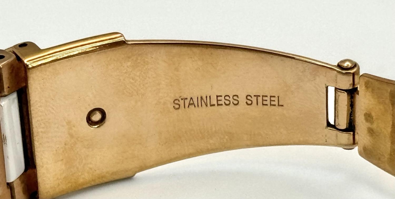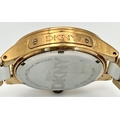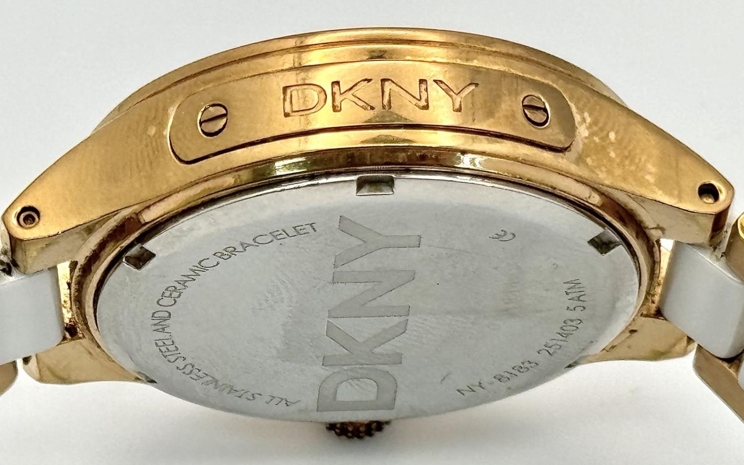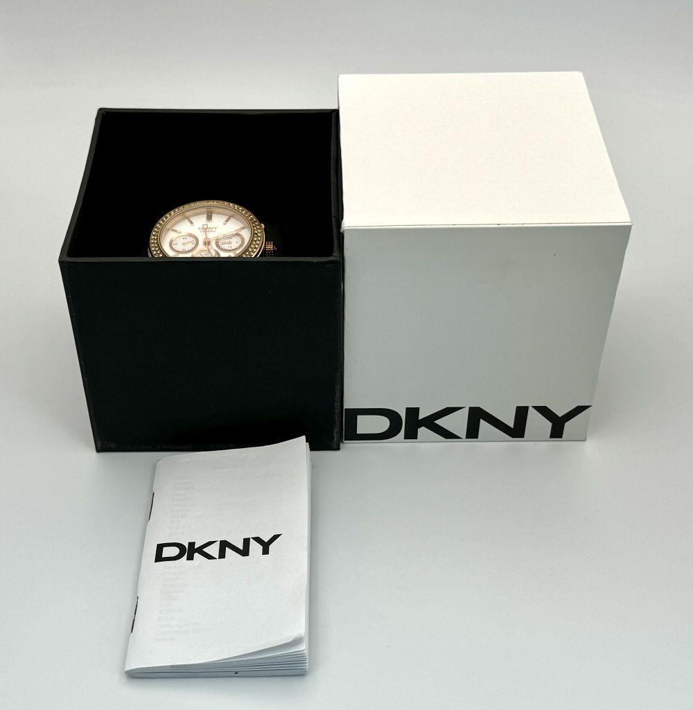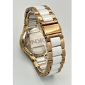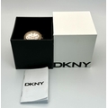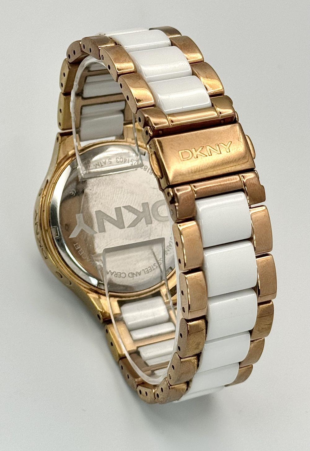 A rose gold plated, Ceramic DKNY Chronometer watch, 38 mm case, bezel with cubic zirconia, white dial with three