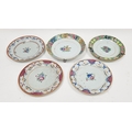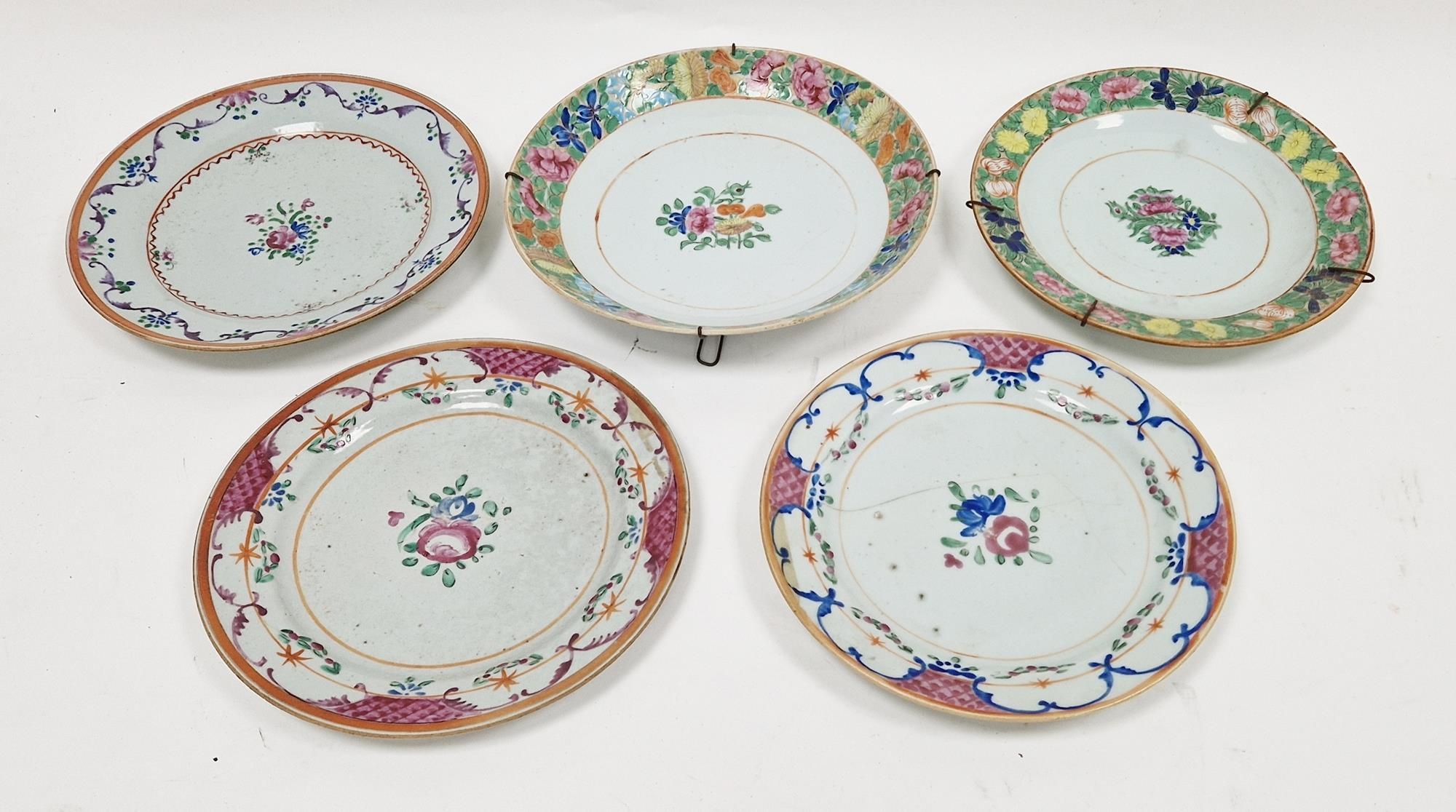 Chinese porcelain shallow dish with multiple flowerhead border, 24cm diameter and the matching smaller plate and three various plates having enamel floral decoration, 22cm diameter (5)