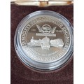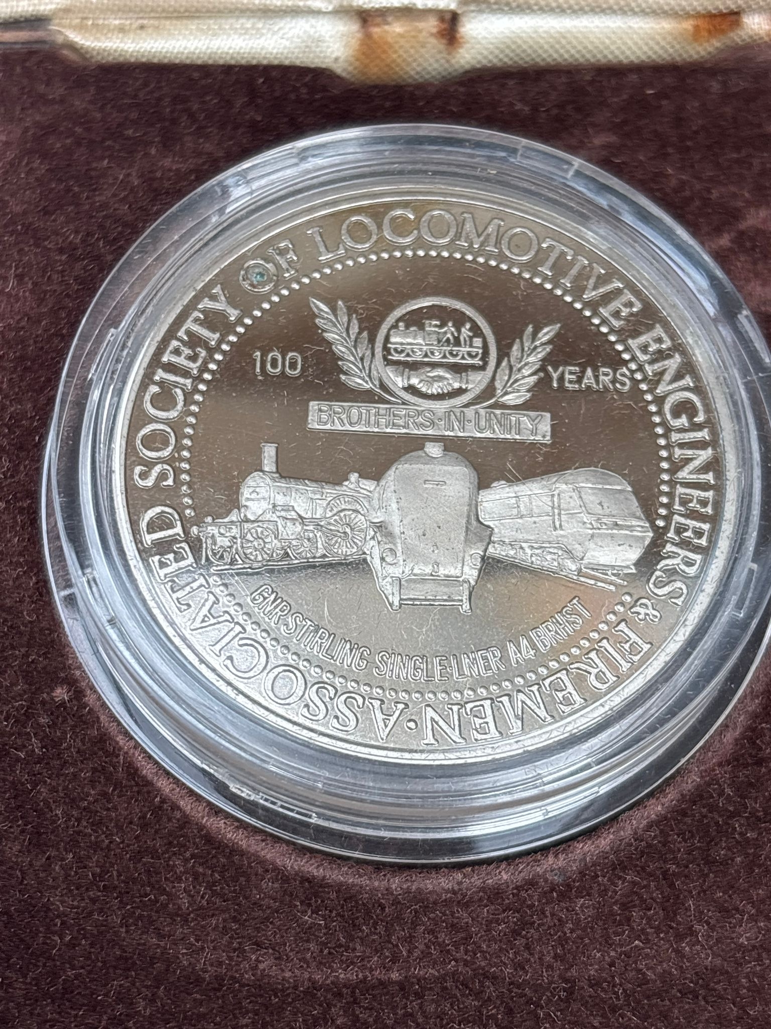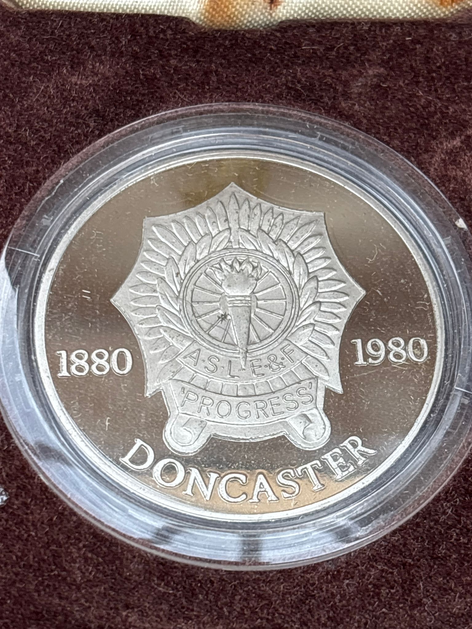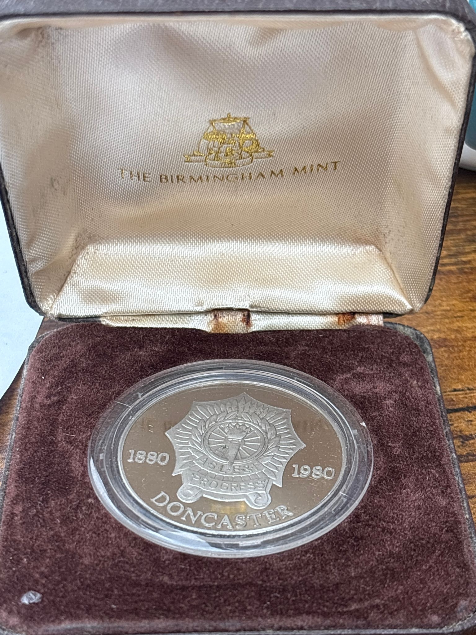 Doncaster Locomotive Engineers Commemorative Medal – 1880–1980 Centenary Striking commemorative medal issued to mark 100 years (1880–1980) of the Doncaster Associated Society of Locomotive Engineers & Firemen (A.S.L.E.&F.). Features detailed locomotive engravings and union crest with motto “Progress”, celebrating Britain’s railway engineering heritage. Housed in original fitted case by The Birmingham Mint, adding to display and collector appeal. Condition: excellent overall, light handling marks, in protective capsule with original case