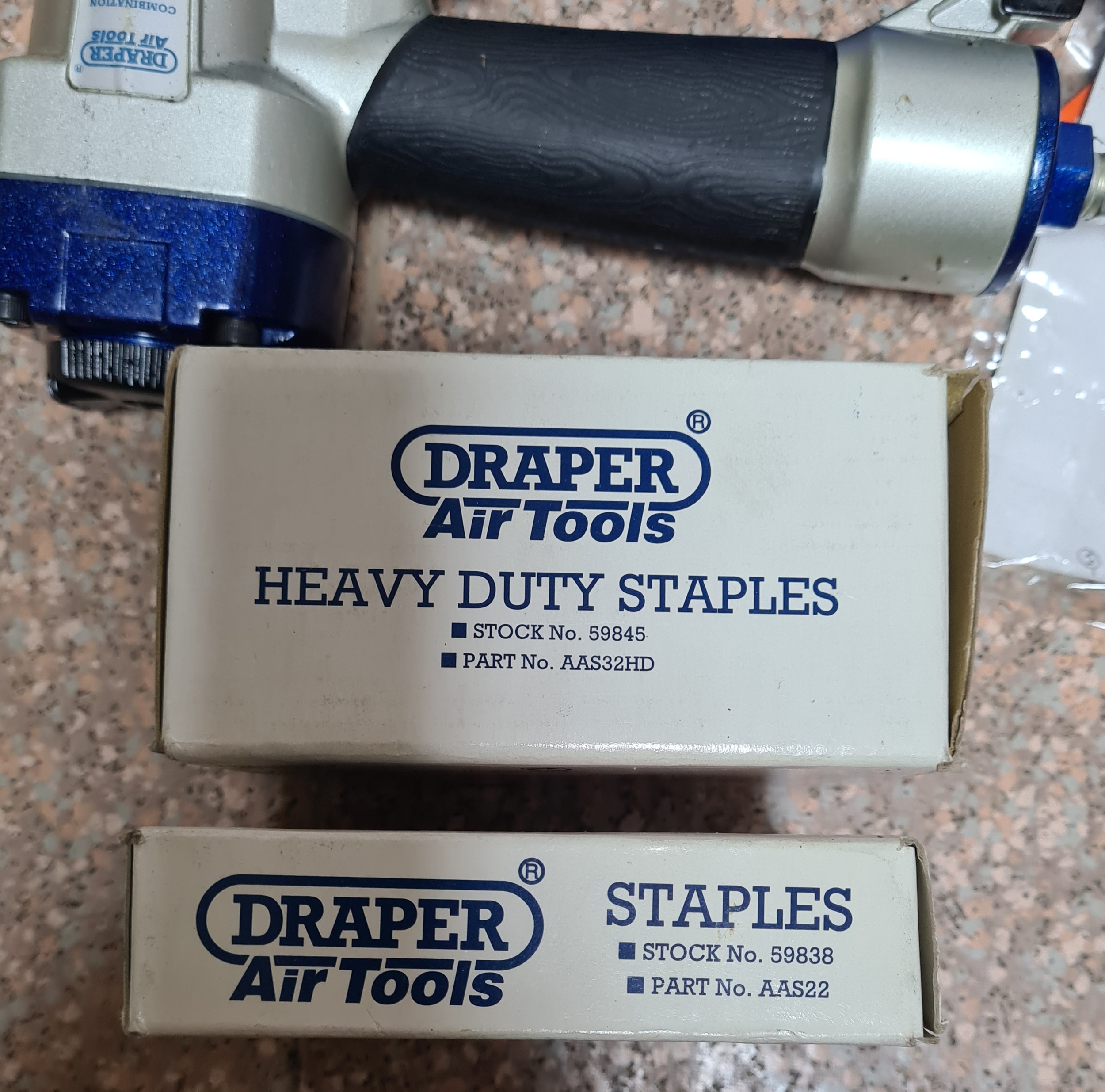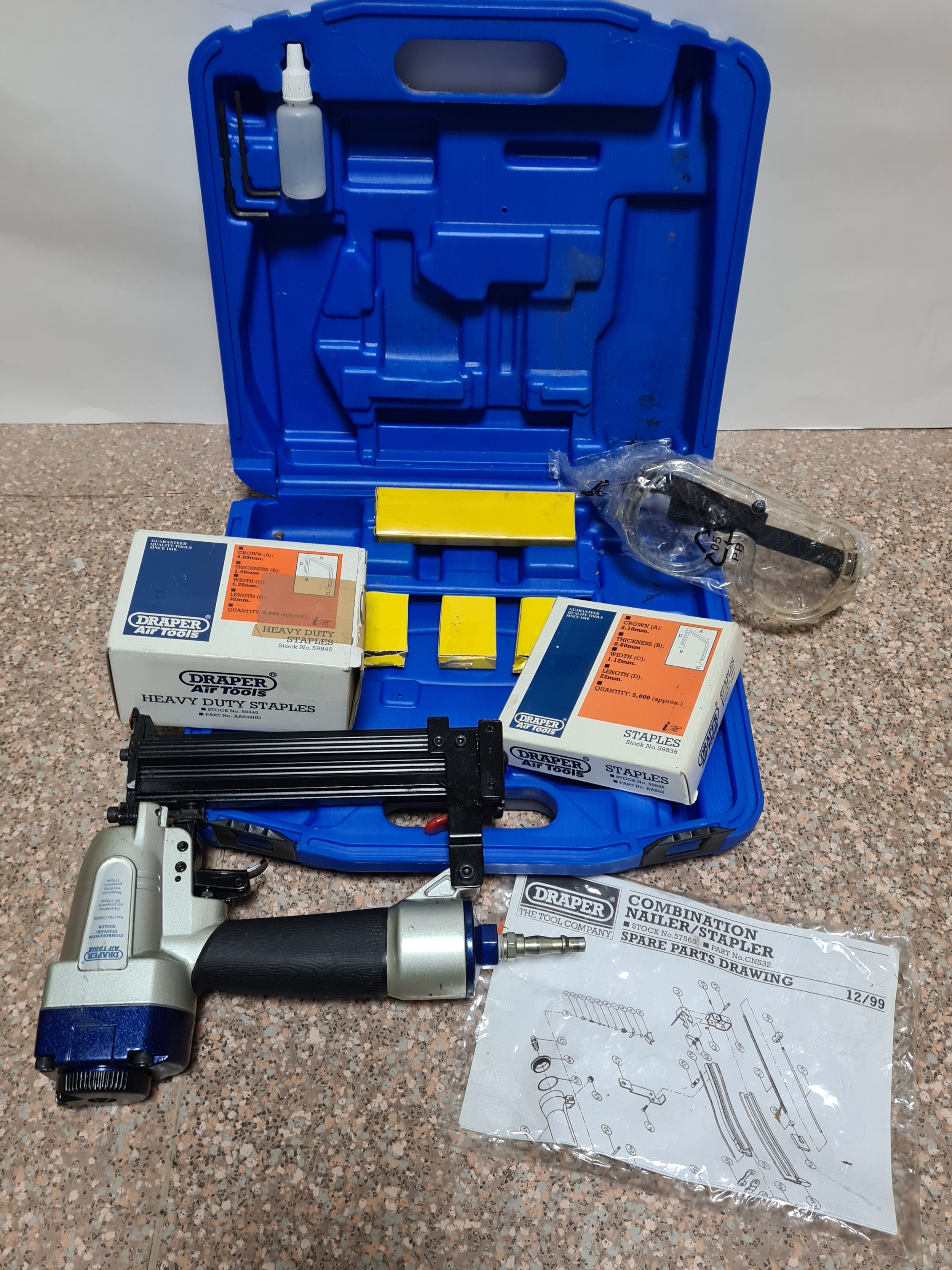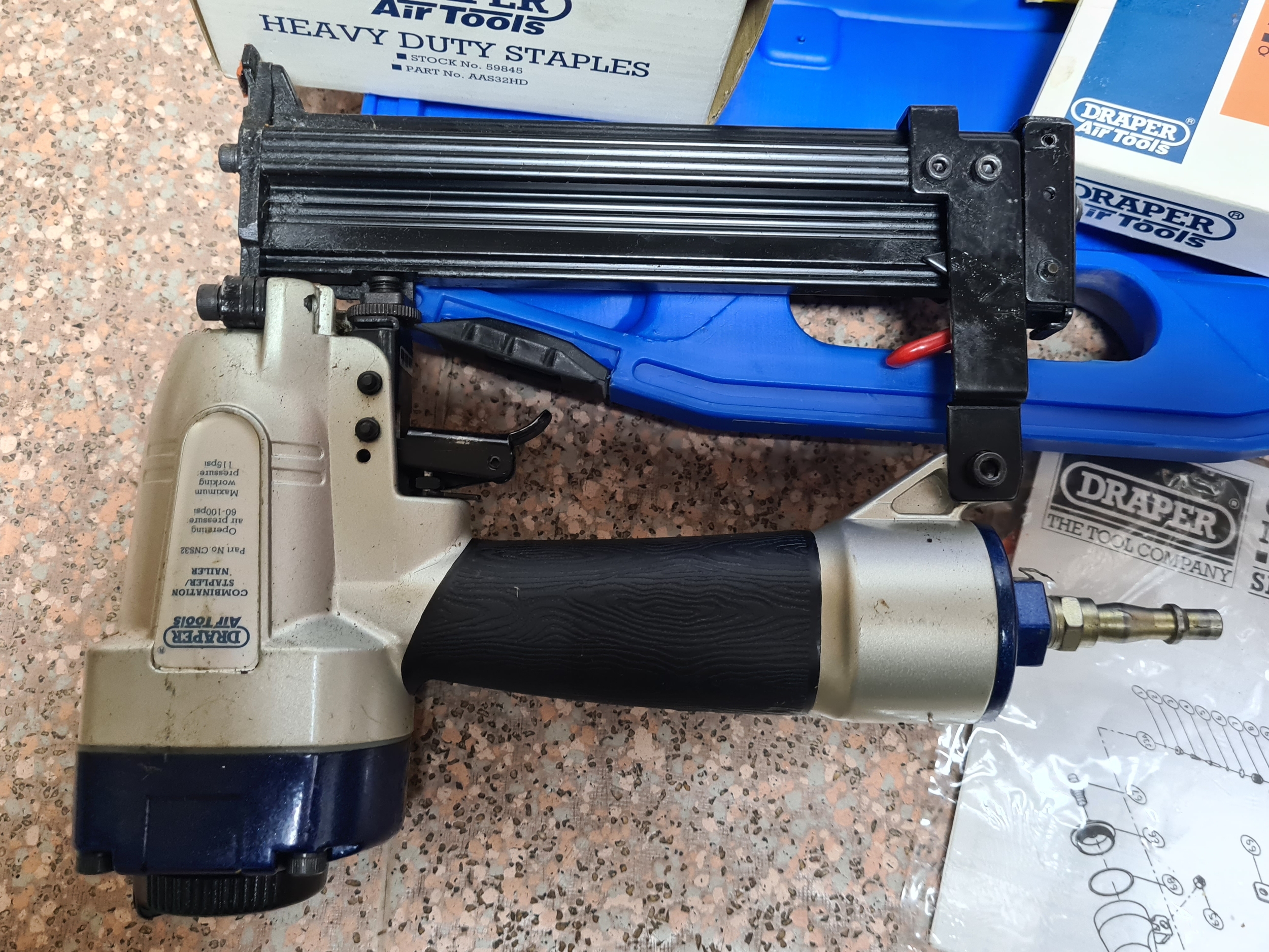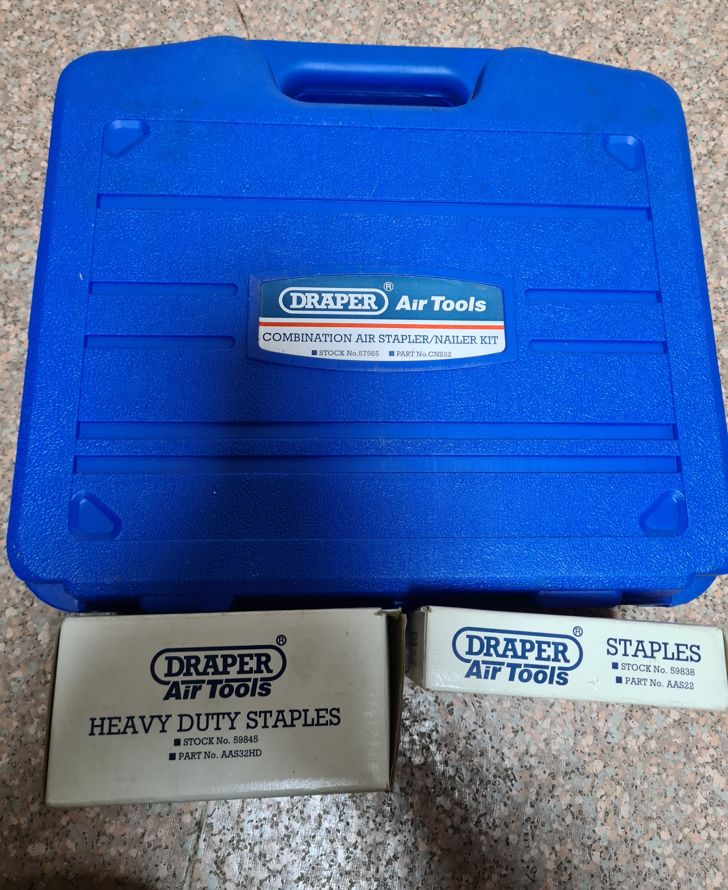 A Draper Combination Nailer /Stapler Air Tool Kit in a plastic box with additional staples and heavy duty staples. No 57565 / CNS32