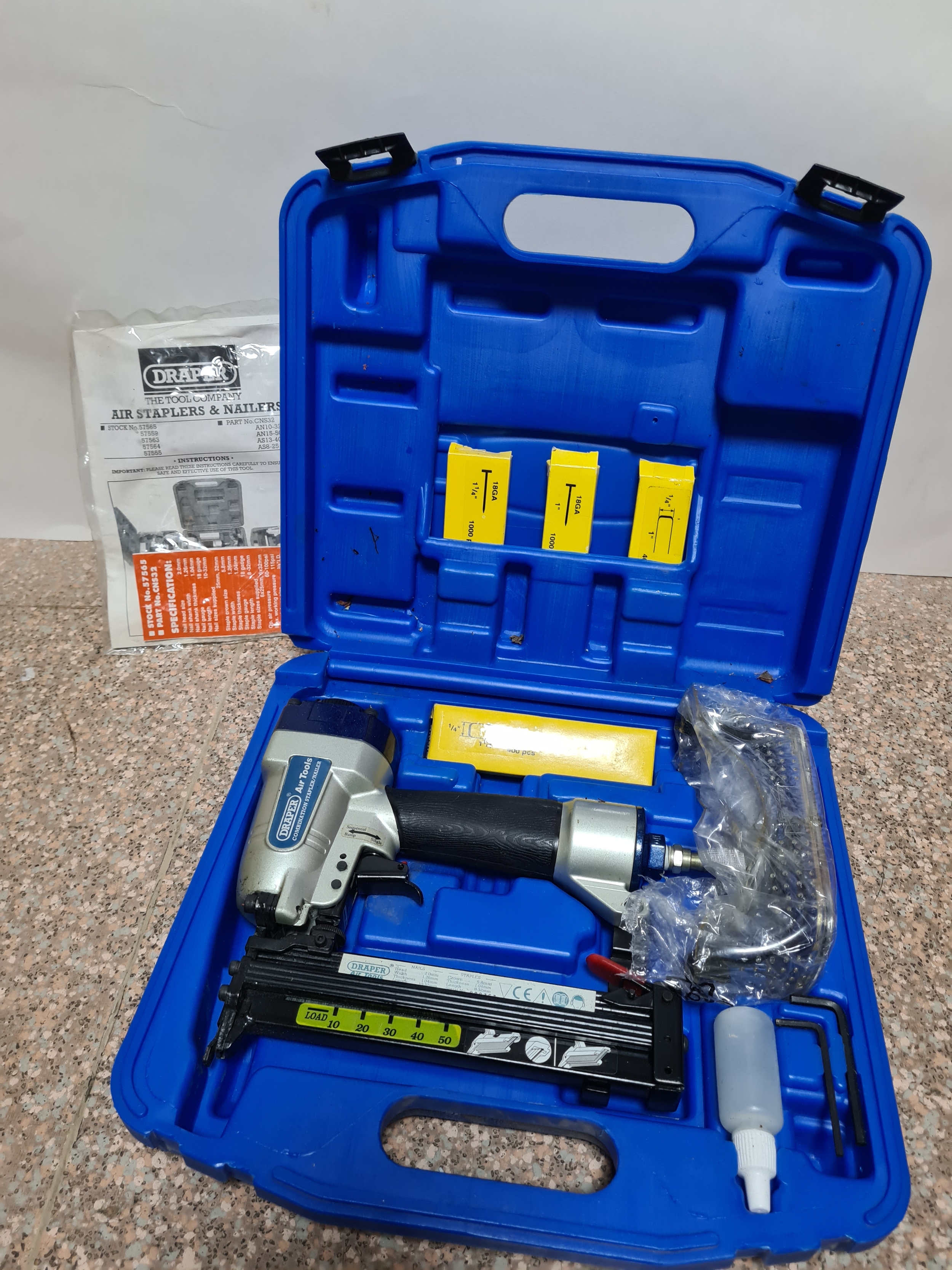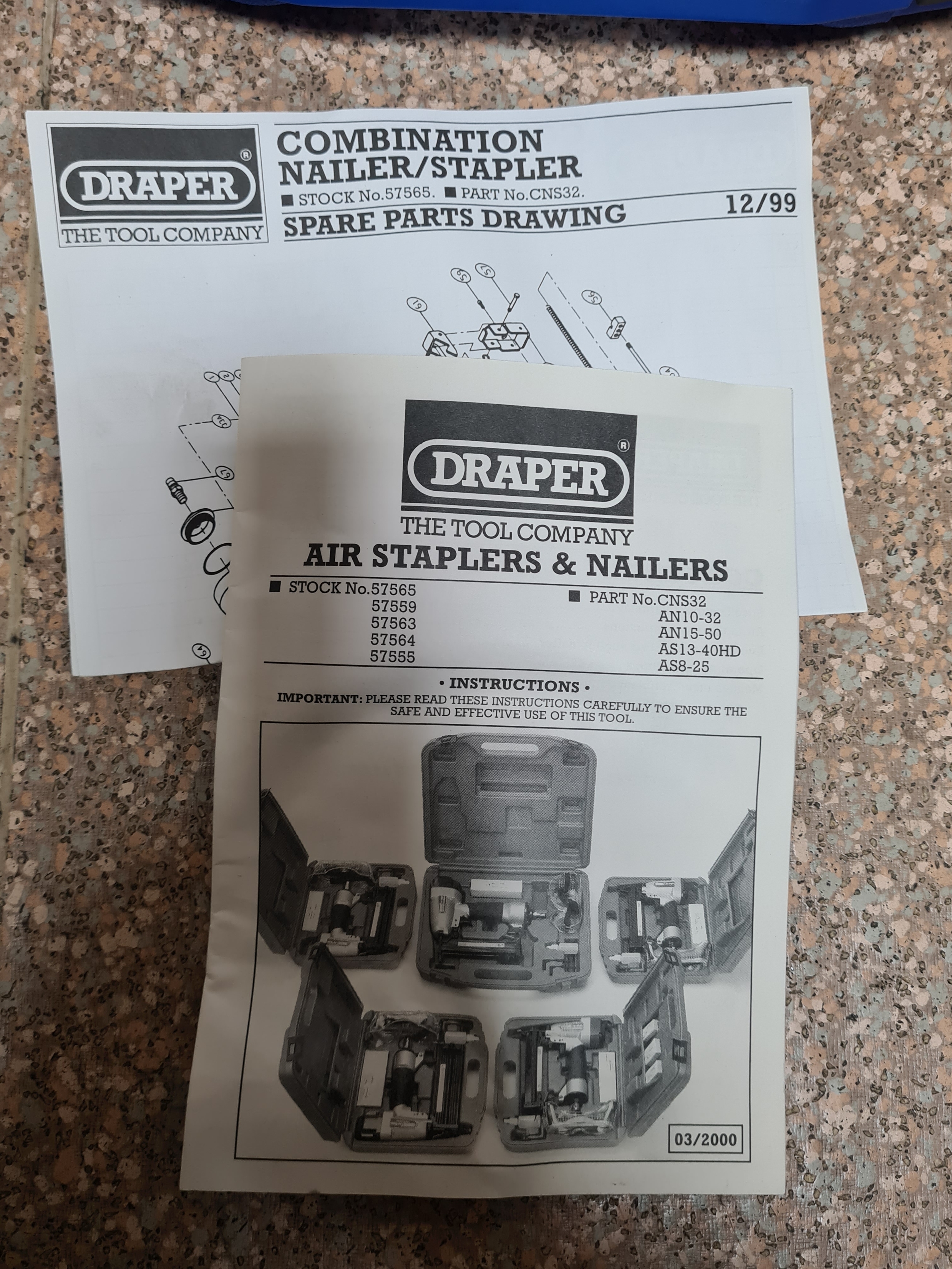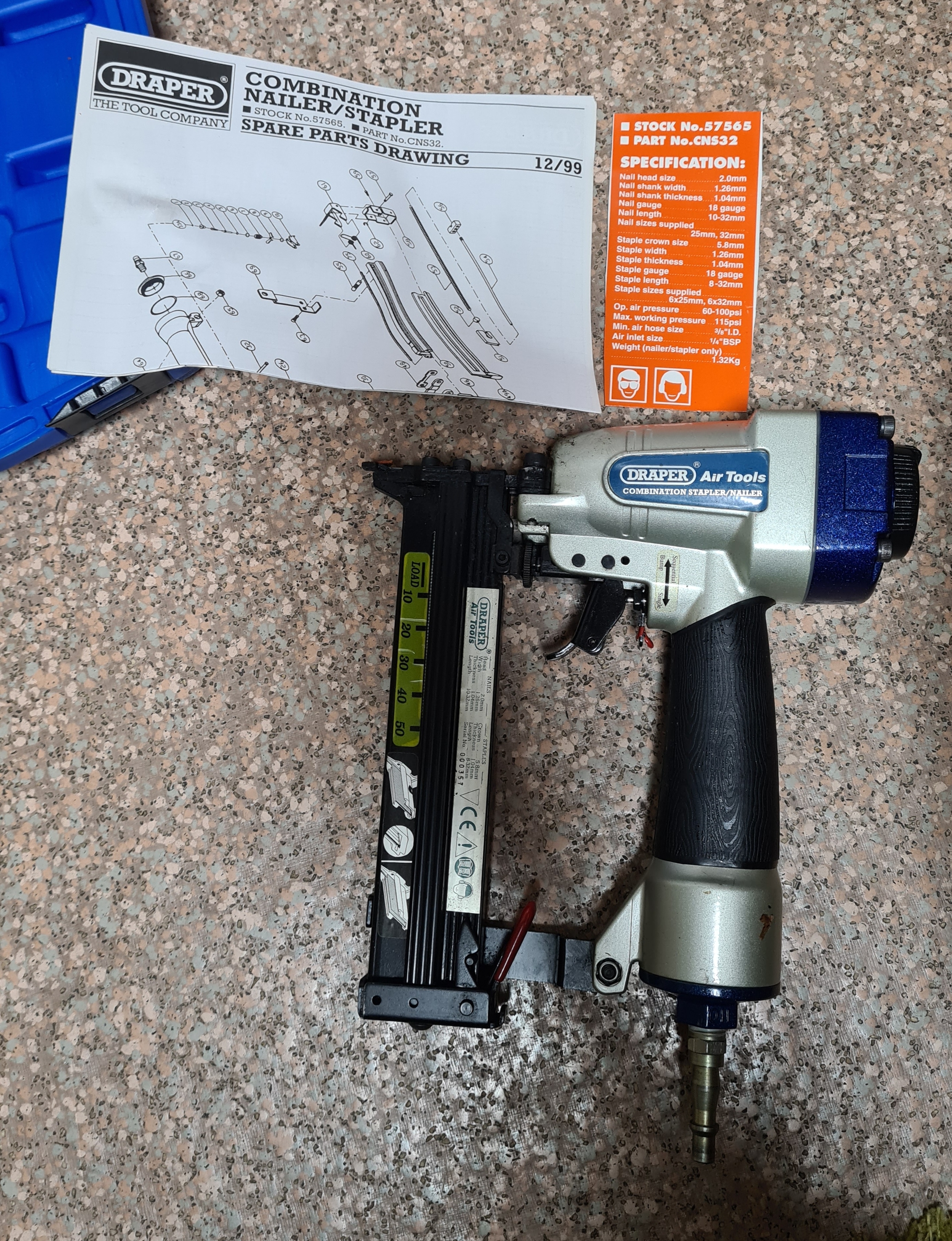 A Draper Combination Nailer /Stapler Air Tool Kit in a plastic box with additional staples and heavy duty staples. No 57565 / CNS32