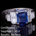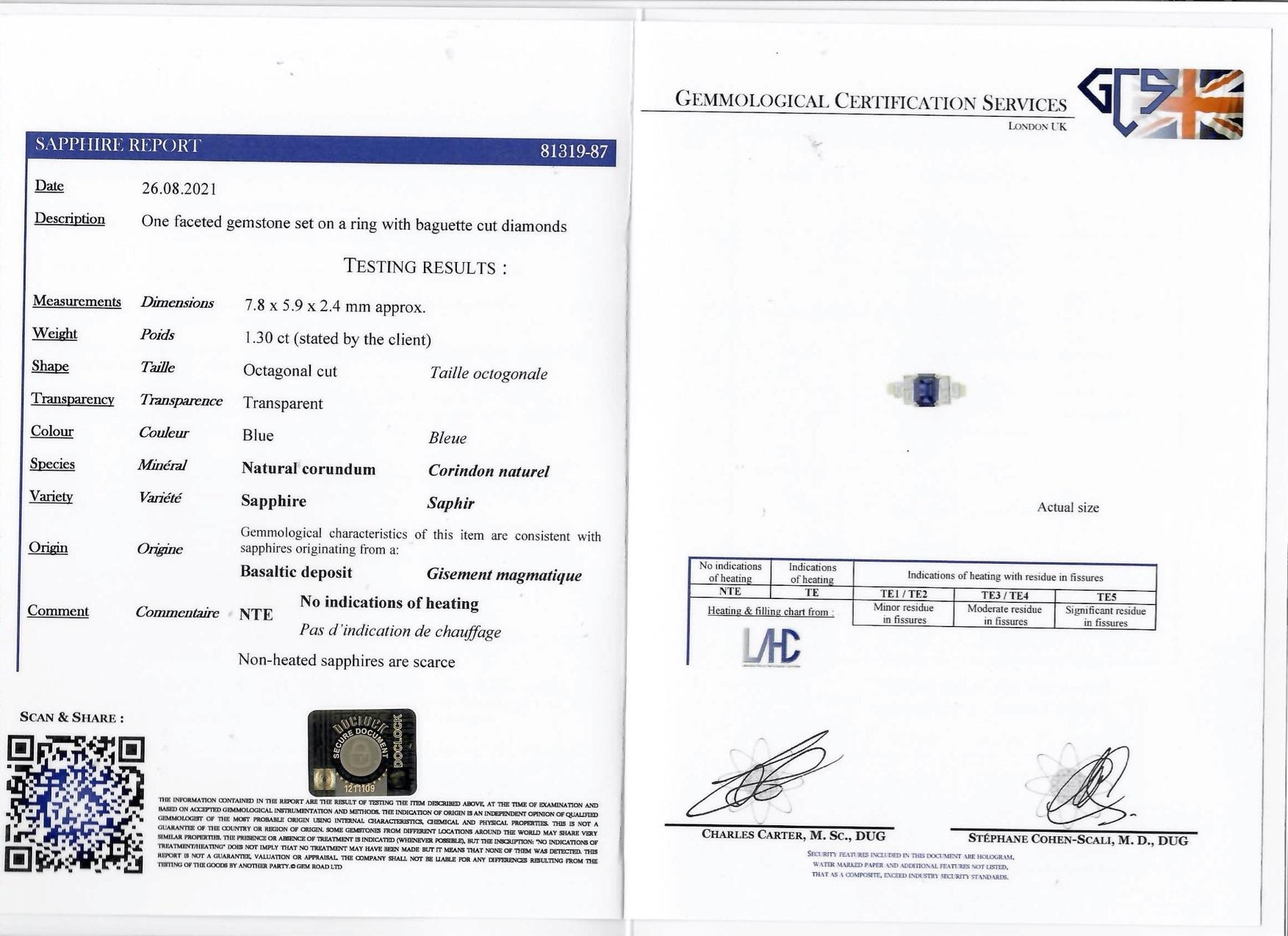 CERTIFICATED SAPPHIRE AND DIAMOND DRESS RING, in 18 ct. white gold. Set with a central octagonal cut sapphire of approx. 1.30 ct. Flanked with 3 baguette cut diamonds on each shoulder, totalling approx. 0.60 ct. Size M. 5.6 grams. Accompanied by GCS London report No. 81319-87 stating that the sapphire is natural, Basaltic deposit. No indications of heating.