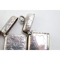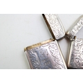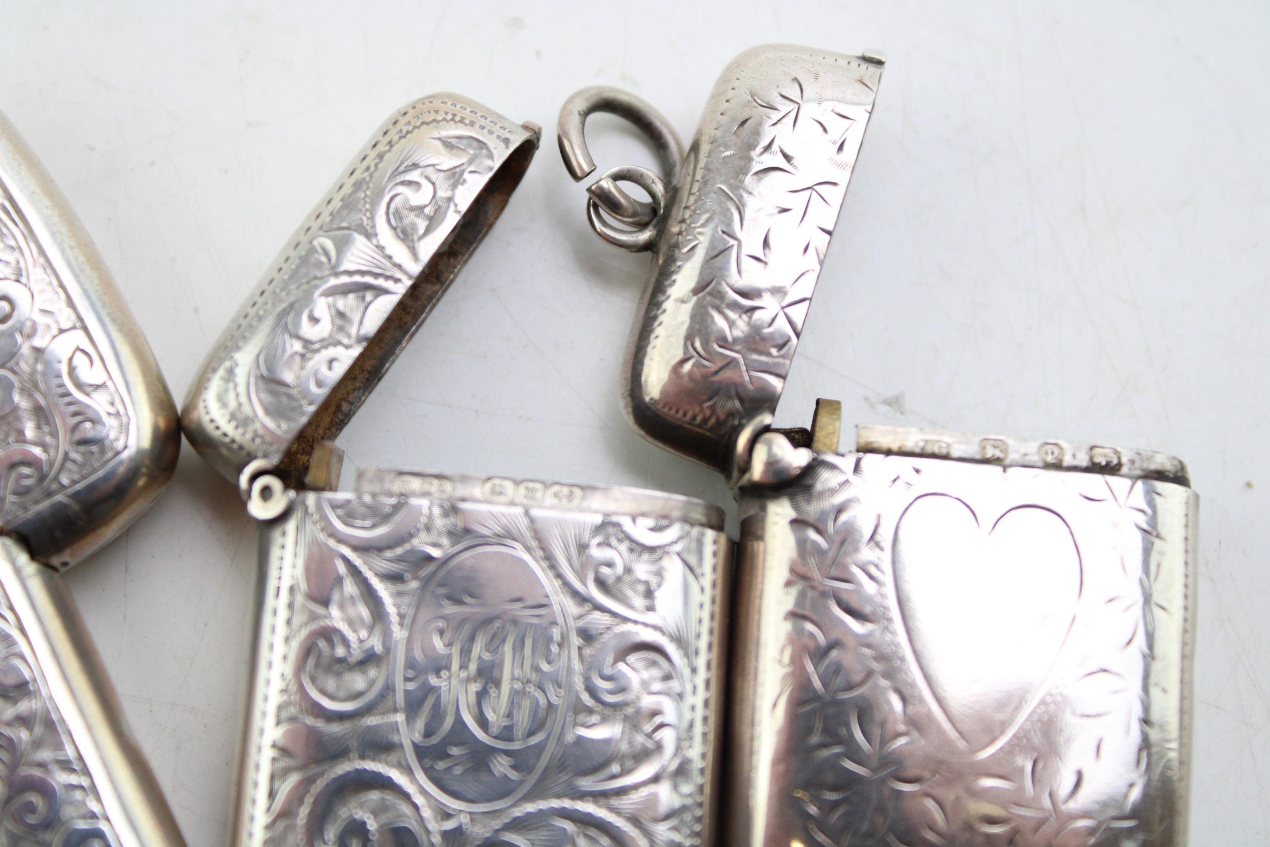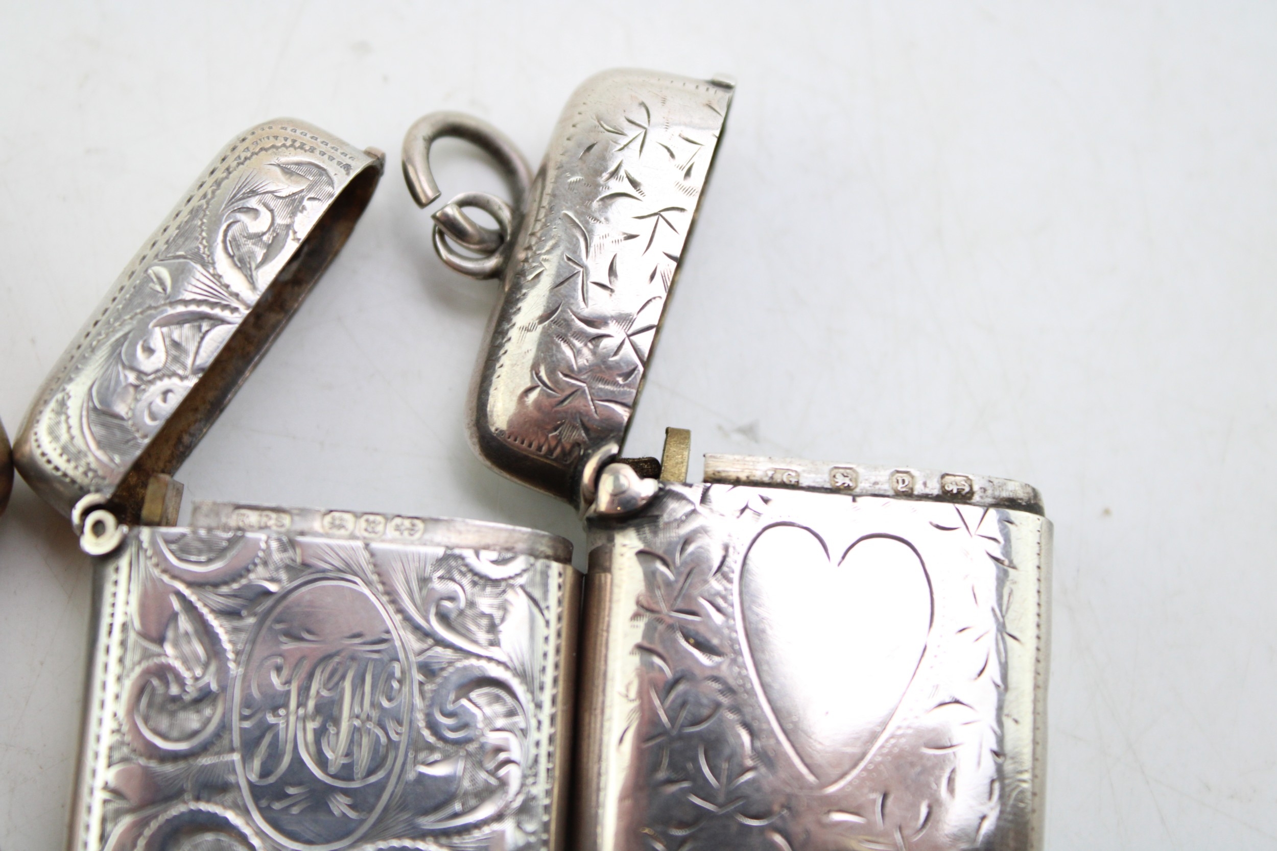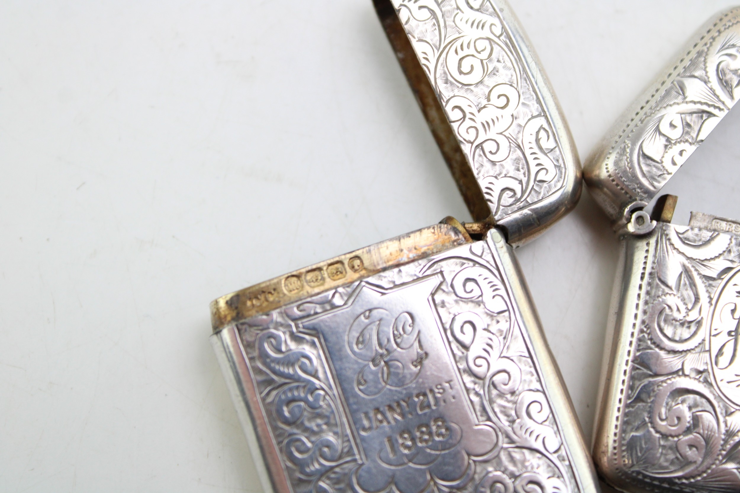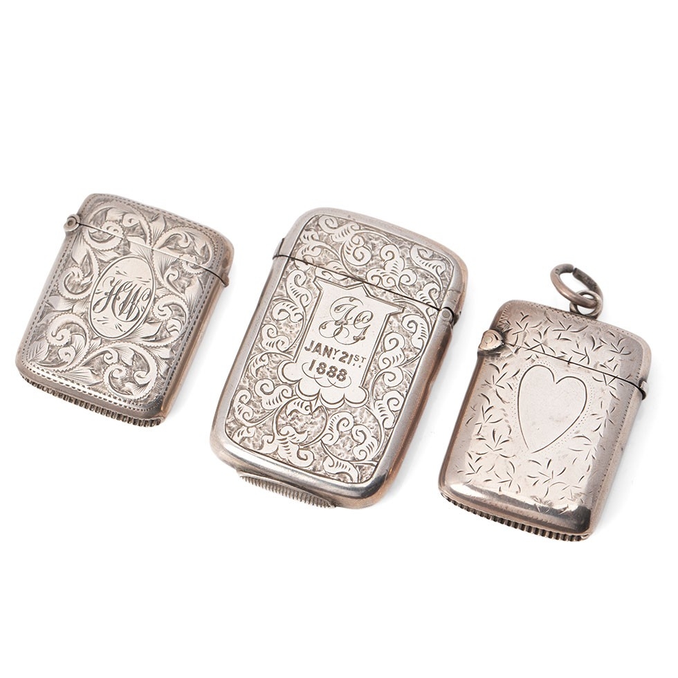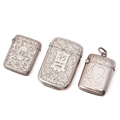 A group of three Victorian silver vesta cases, all of rectangular form, the largest with scrolling acanthus engraving, the shaped reserve monogram and date engraved, Colen Hewer Cheshire, Birmingham 1886, a smaller example with engraved ivy leaf decoration and heart shaped blank reserve, Joseph Gloster, Birmingham 1898, the third similar in size with scrolling acanthus decoration and monogram engraved oval reserve, Randle Brothers, Birmingham 1894, total combined weight 50.0g, 1.61toz.
