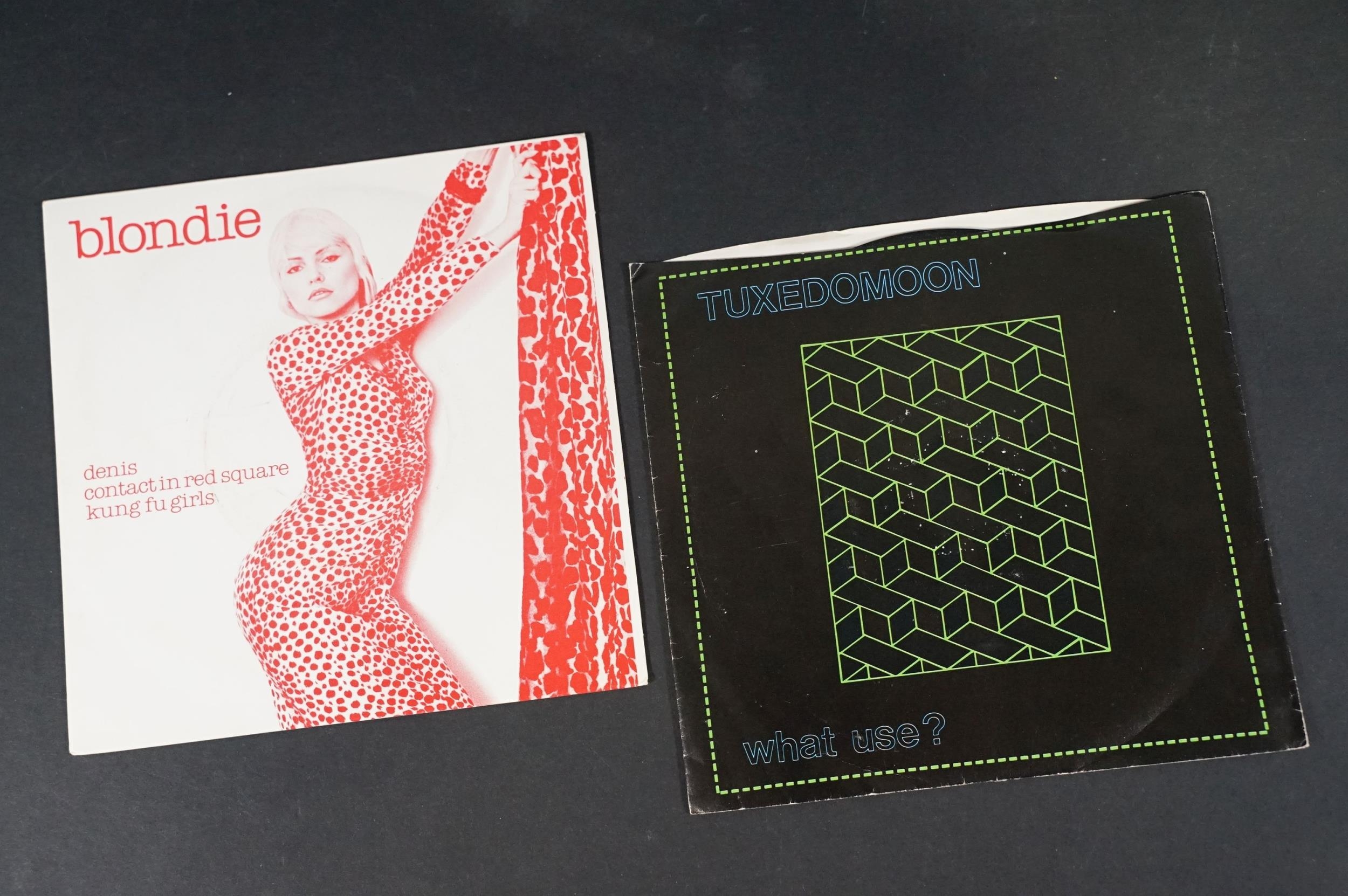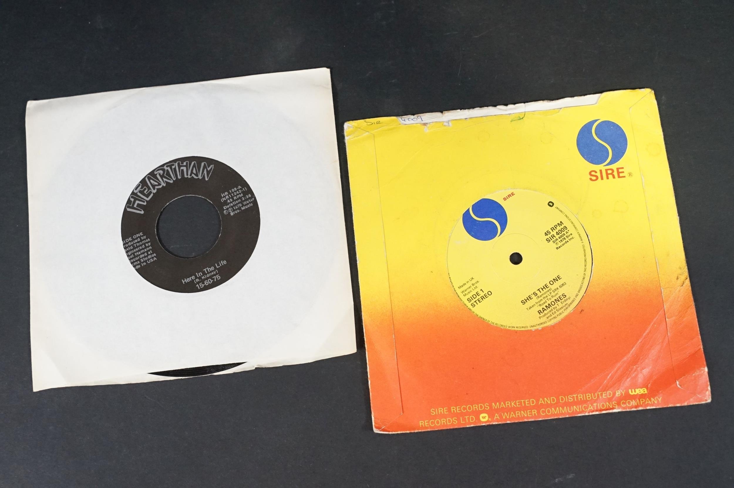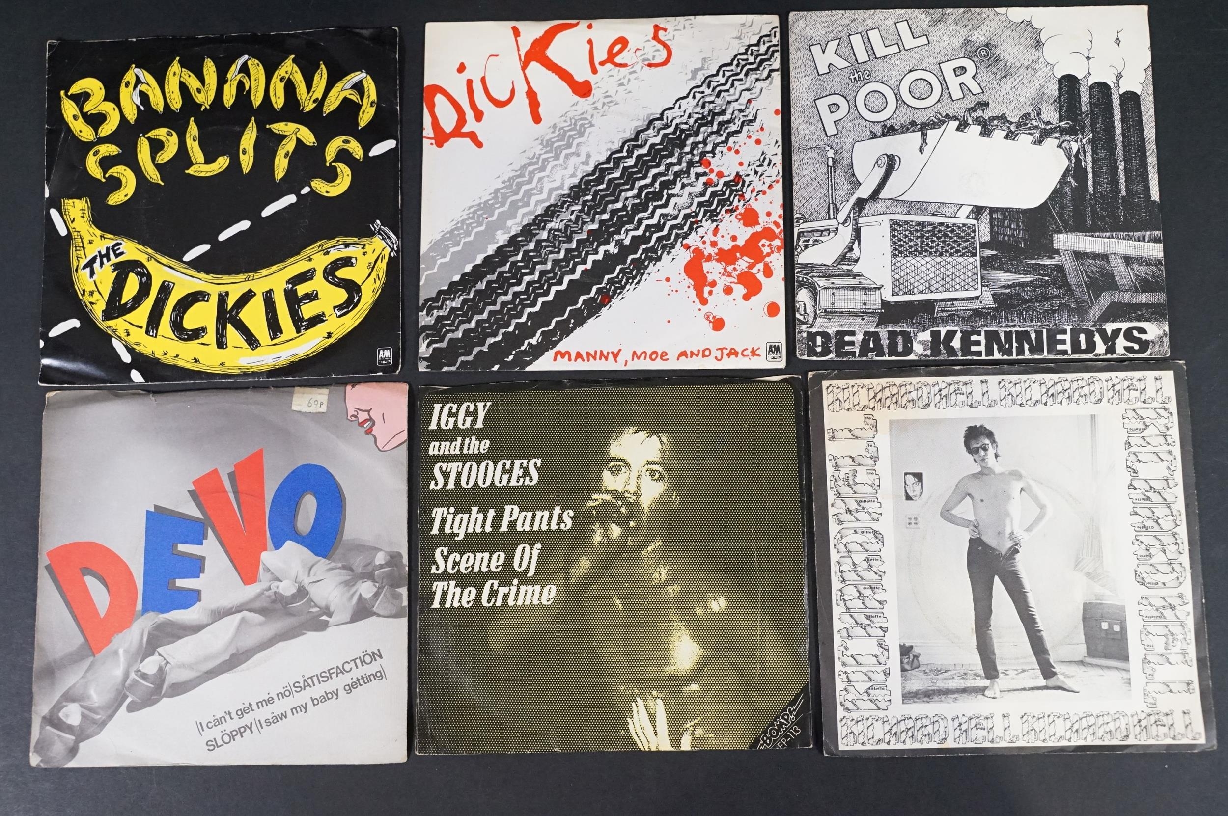 Vinyl - 14 Punk / Post Punk 7” singles by US artists to include: Teenage Jesus And The Jerks (US), Dead Kennedys (with insert), Ramones, Richard Hell (numbered), The Dickies x 2 (one yellow vinyl), Iggy And The Stooges (US), Devo x 2, Material, 15-60-75 (US), Tuxedomoon (US), Snatch, Blondie. Condition VG overall on sleeves and VG+ on vinyl
