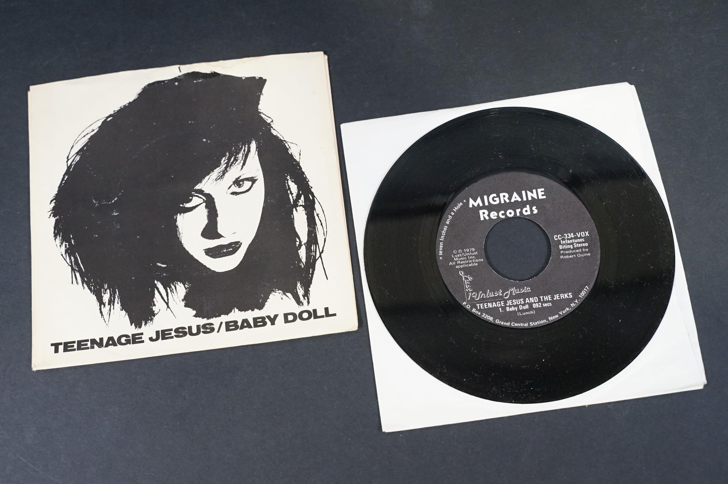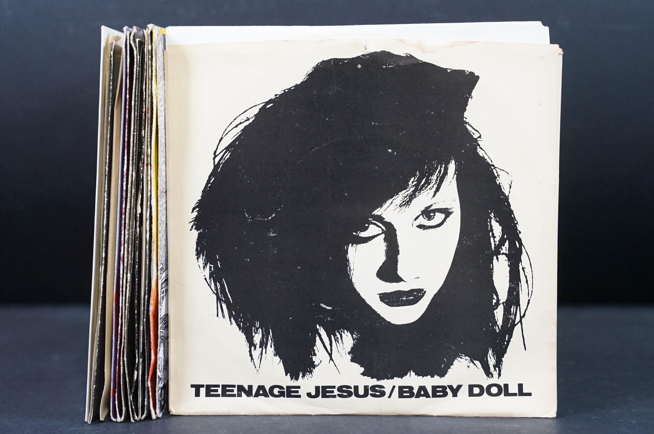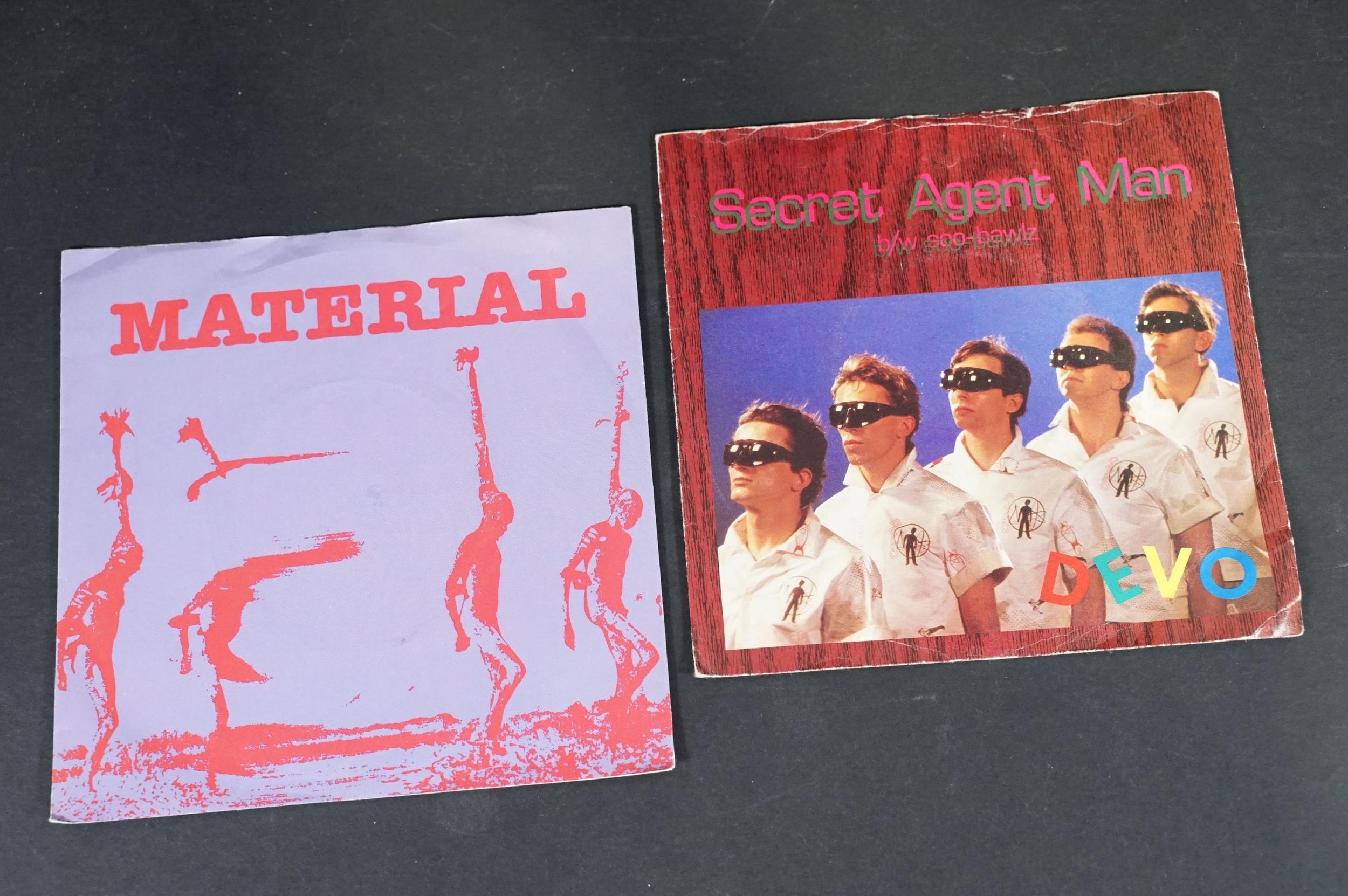 Vinyl - 14 Punk / Post Punk 7” singles by US artists to include: Teenage Jesus And The Jerks (US), Dead Kennedys (with insert), Ramones, Richard Hell (numbered), The Dickies x 2 (one yellow vinyl), Iggy And The Stooges (US), Devo x 2, Material, 15-60-75 (US), Tuxedomoon (US), Snatch, Blondie. Condition VG overall on sleeves and VG+ on vinyl
