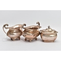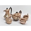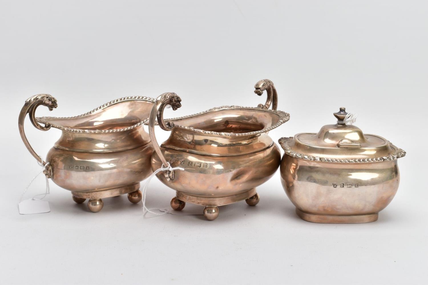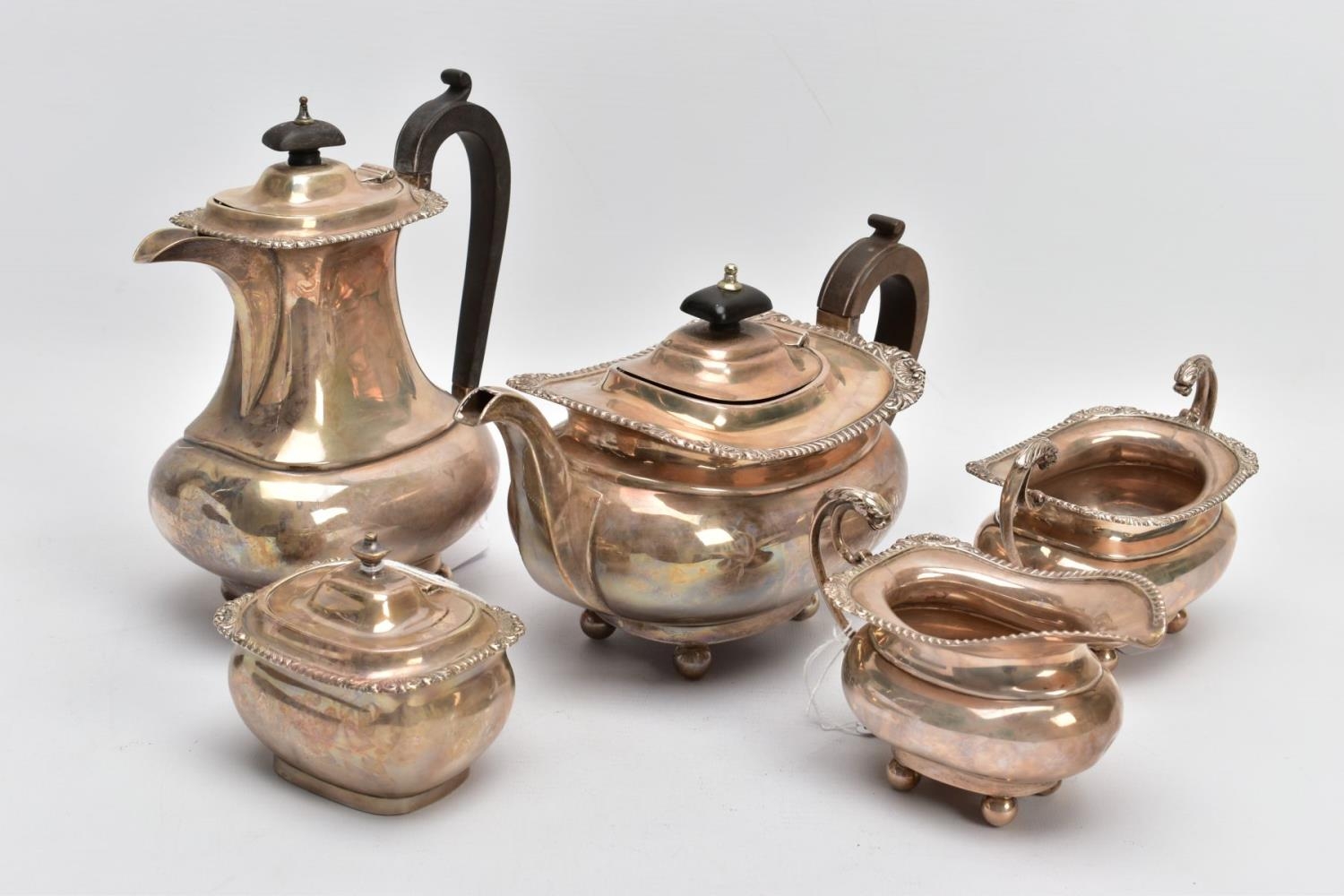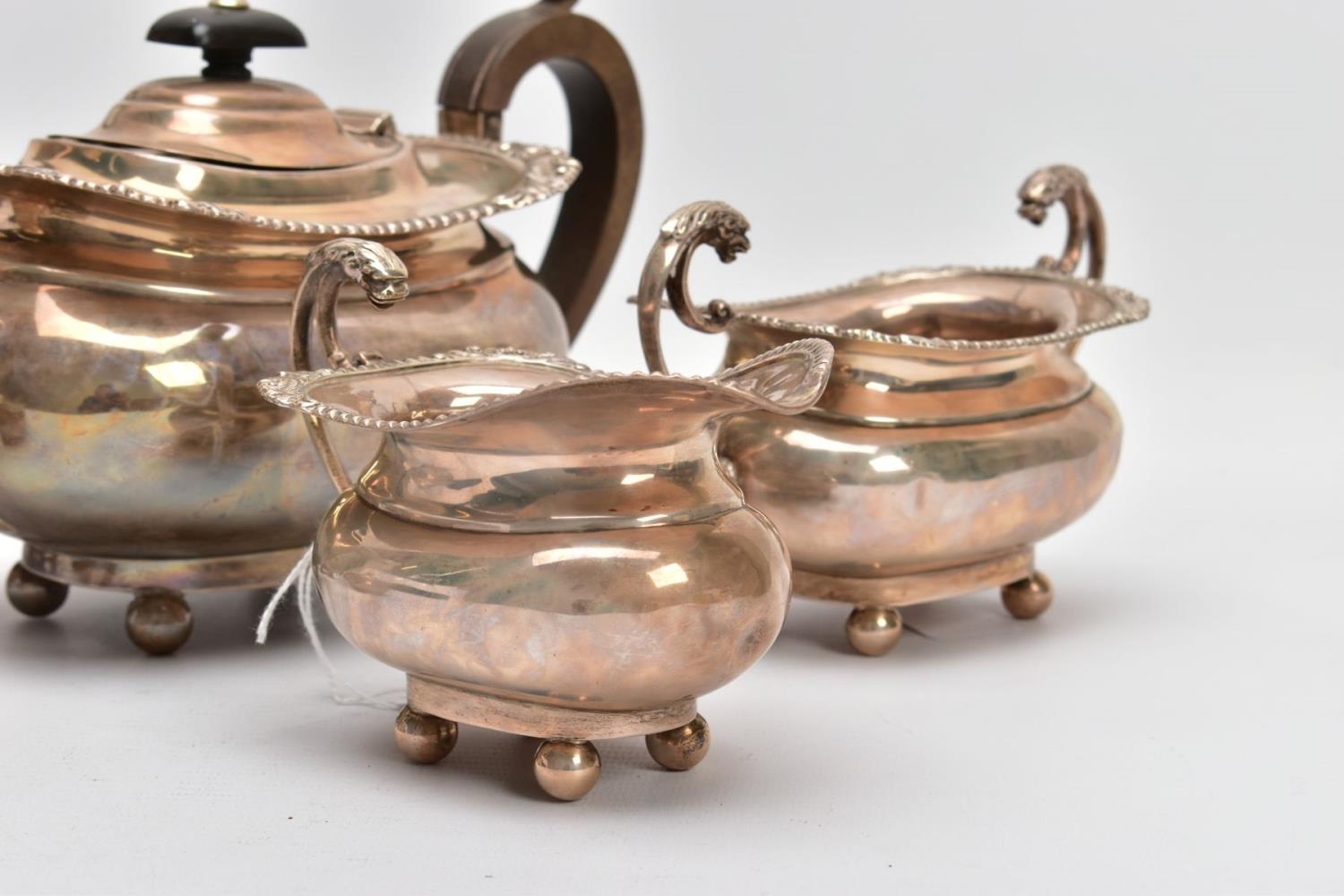 A SILVER FIVE-PIECE TEA SET, to include a teapot and hot water jug each with a wooden scroll handle and finial, gadrooned and scroll decorative rim, baluster form, raised on four ball feet, together with twin stylised lion head handle sugar bowl and milk jug, also with a lidded teabag dispenser on a flat base, each piece hallmarked 'Thomas Edward Atkins' Birmingham 1909, approximate gross weight 1614.4 grams, 51.90 ozt (Condition report: slight tarnishing on all pieces, teapot lid and water jug lids do not sit flush, water jug, milk jug and sugar bowl have dinks to the sides)