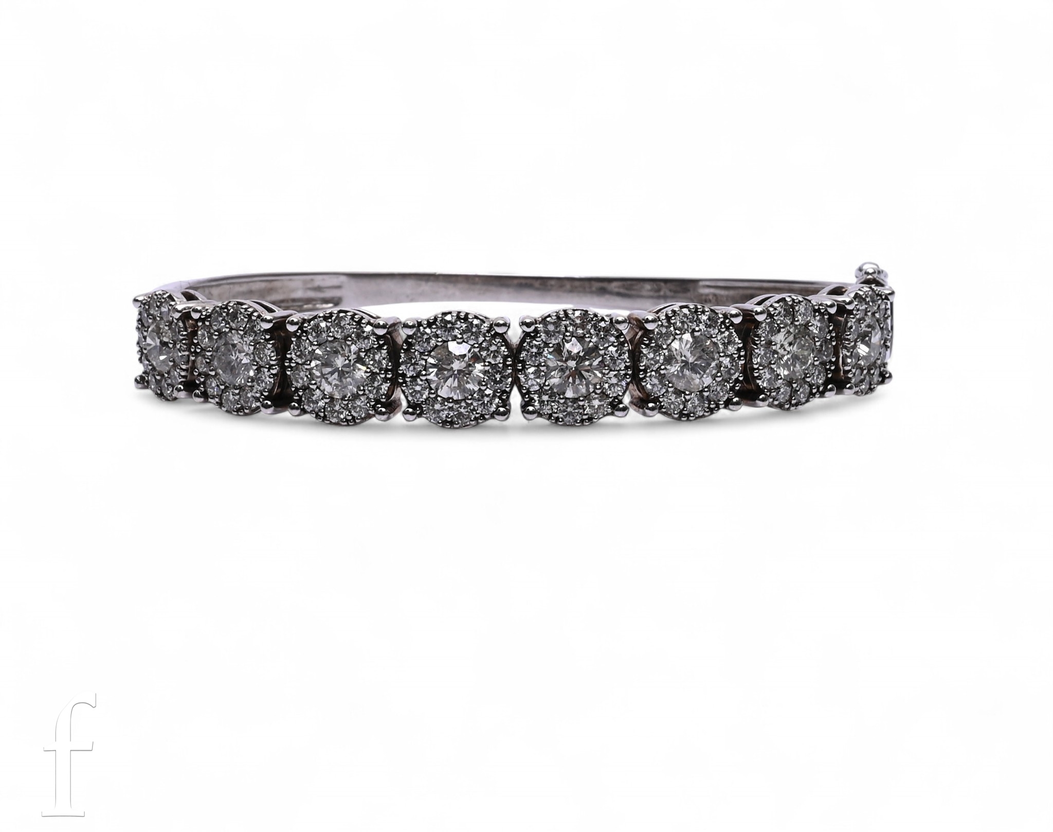 A diamond bangle, composed of eight diamond clusters each set with a principle brilliant-cut diamond, within a border of ten brilliant-cut diamonds, claw set on a plain white gold hinged bangle, hallmarked for 18 carat white gold, total weight 31.4g, inner circumference approximately 6cm.