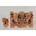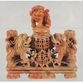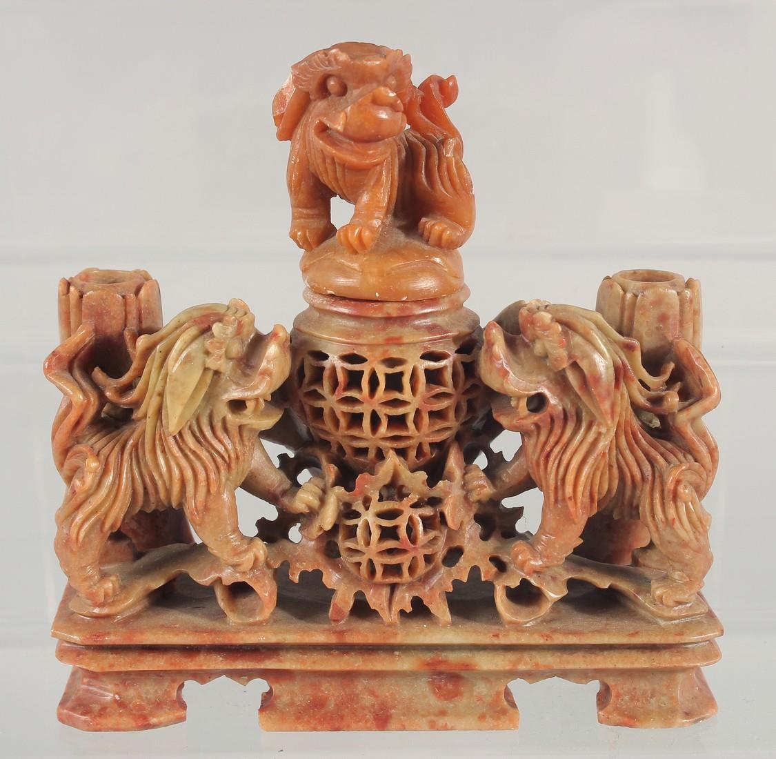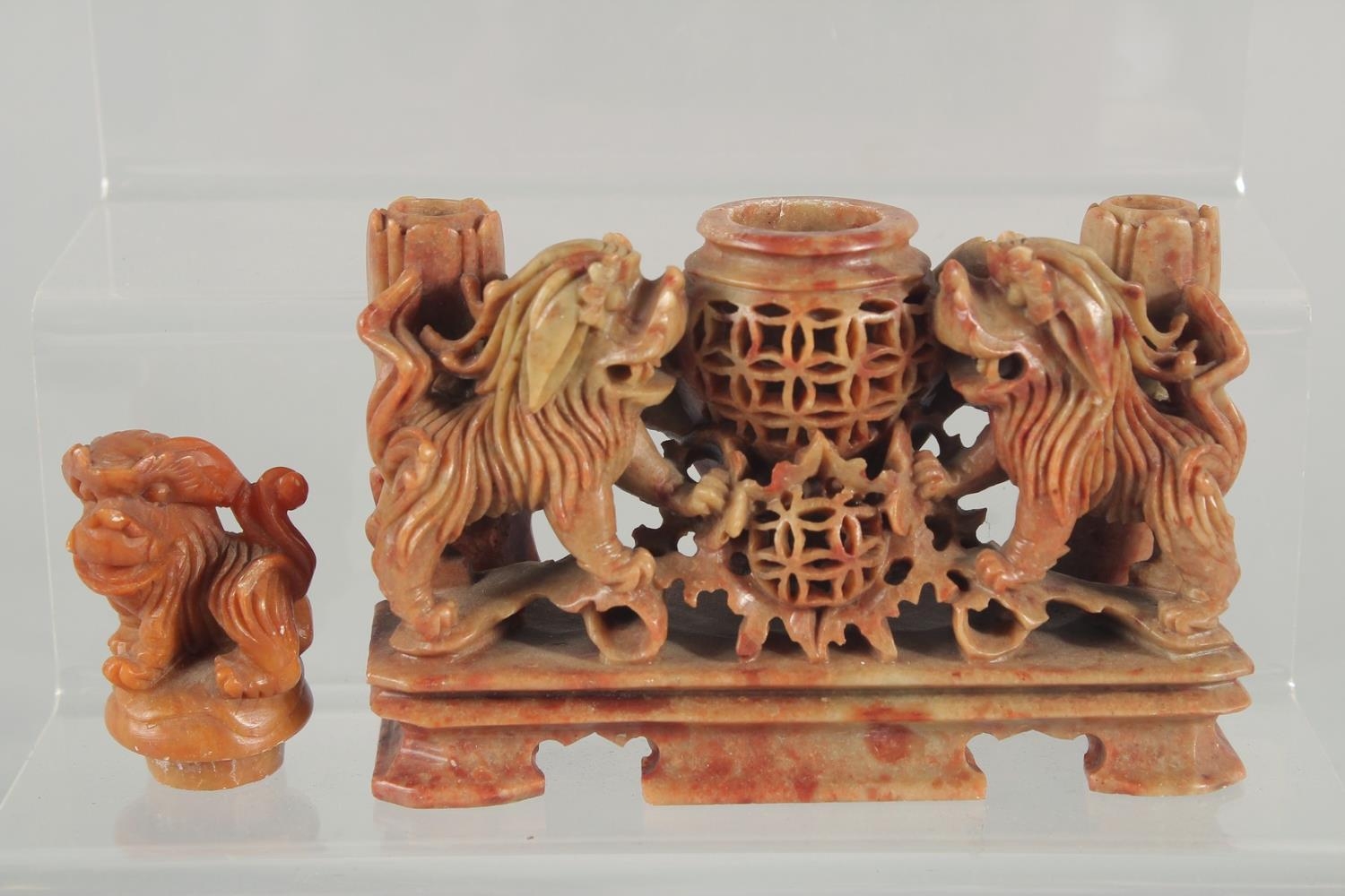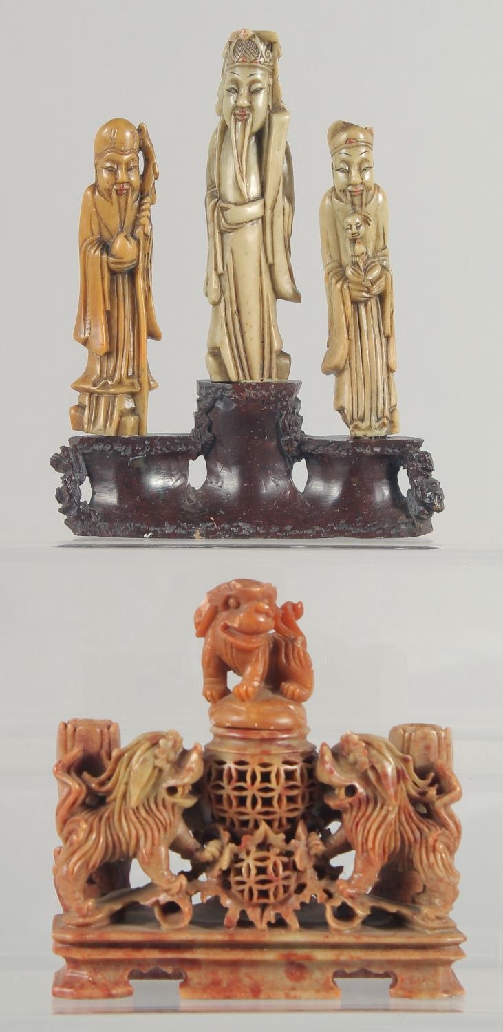 TWO CHINESE SOAPSTONE CARVINGS, one carved with foo dogs, the other of immortals on a soapstone base, (2).