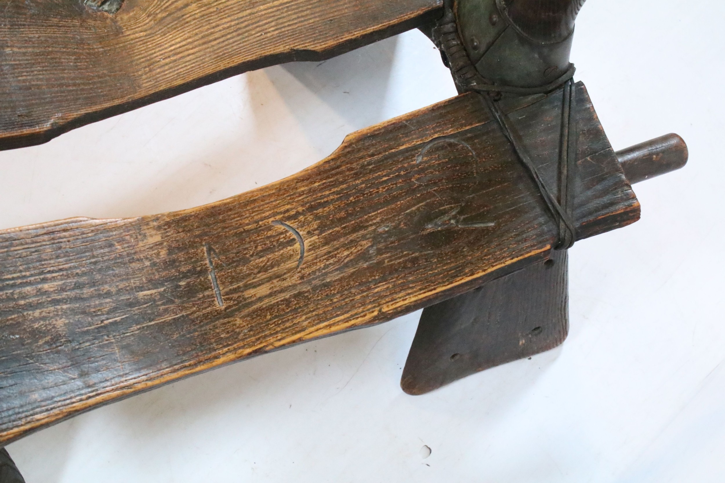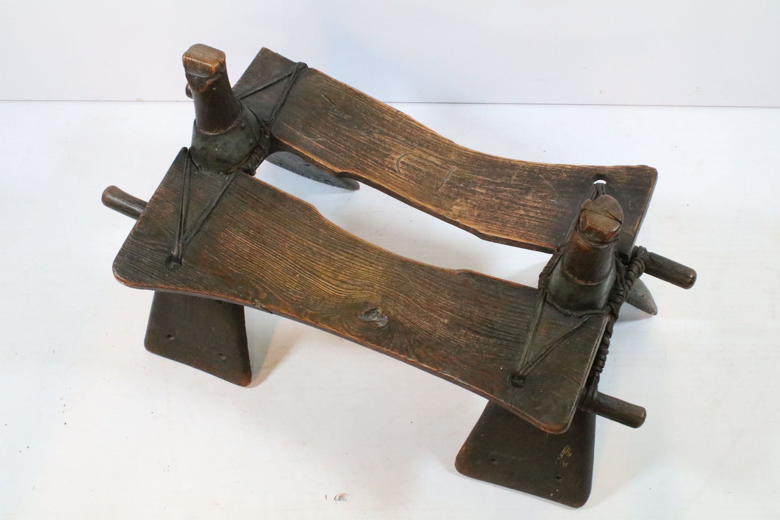 Early 20th Century North African camel saddle stool, with impressed marks to side, measures 80cm approx Length