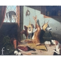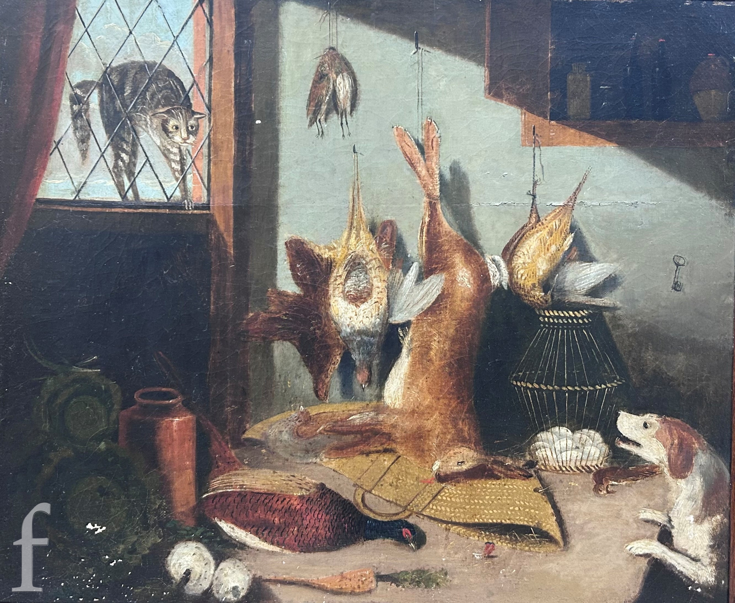 English Primitive School (19th Century) - The Game Larder, oil on canvas, framed, 50cm x 60cm, frame size 65cm x 74.5cm.