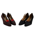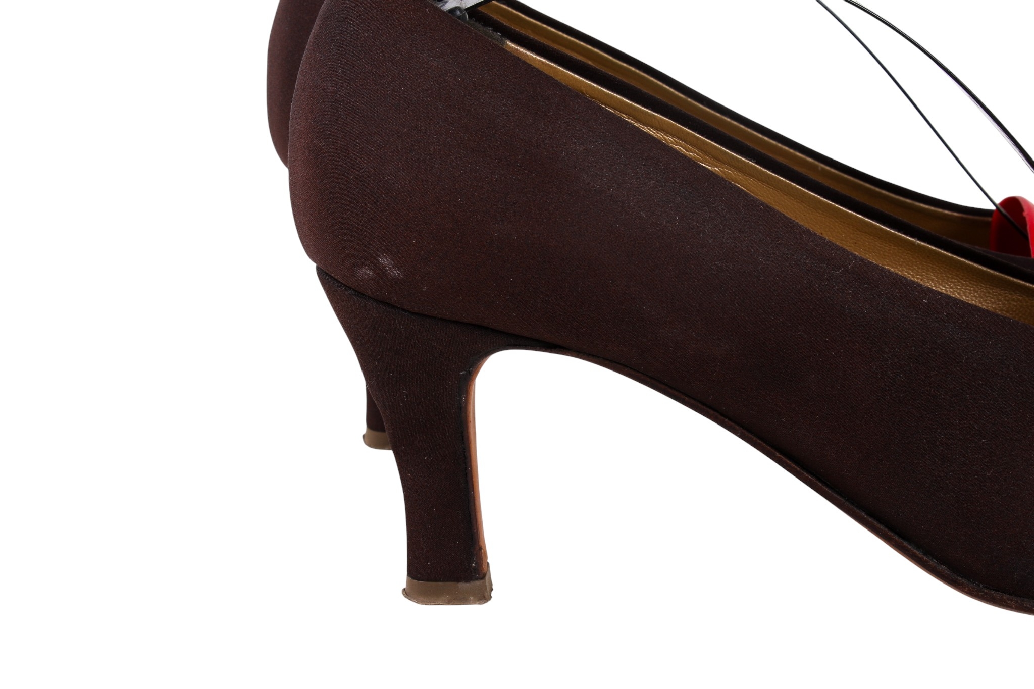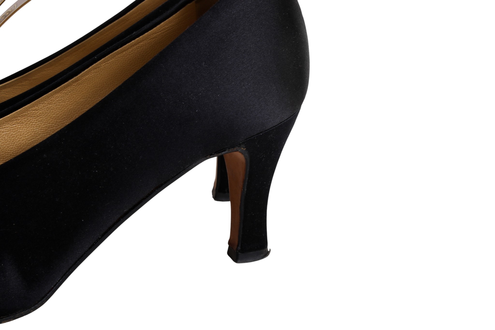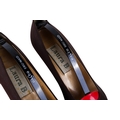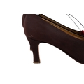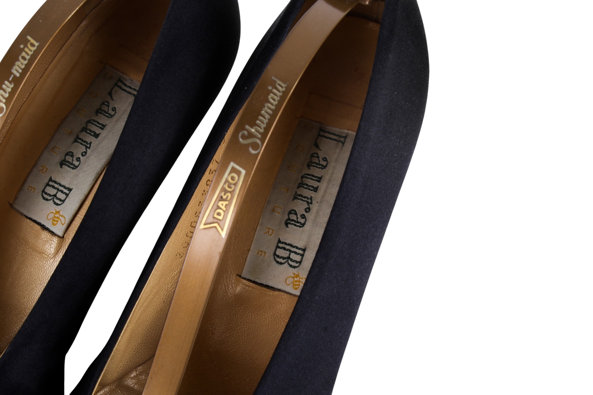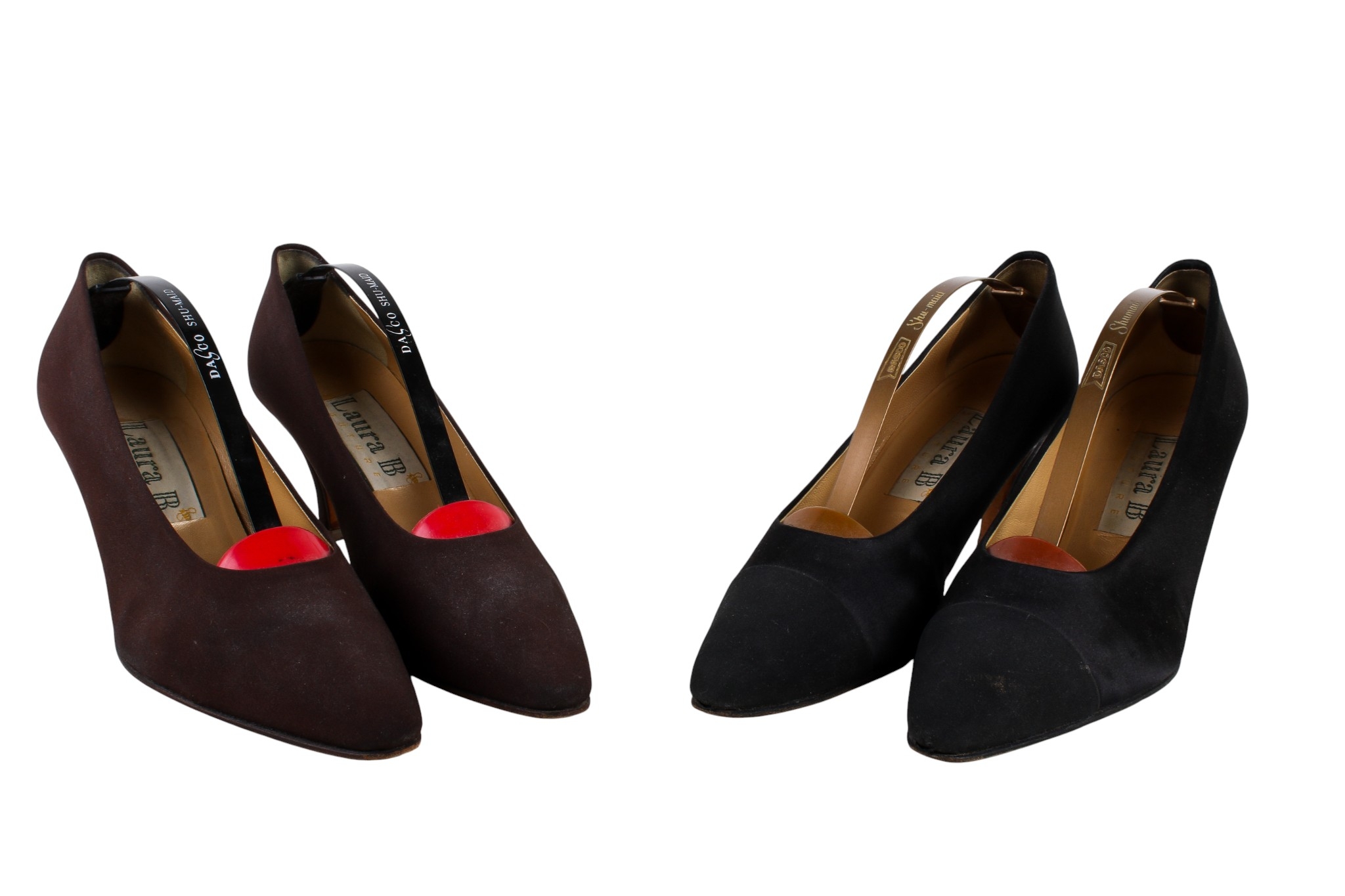 Two pairs of Laura B Coutre high heel shoes. Comprising a pair of brown fabric court shoes with stiletto heels, size 39 1/2, and a pair of black satin court shoes with stiletto heels, size 39 1/2