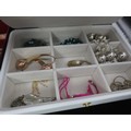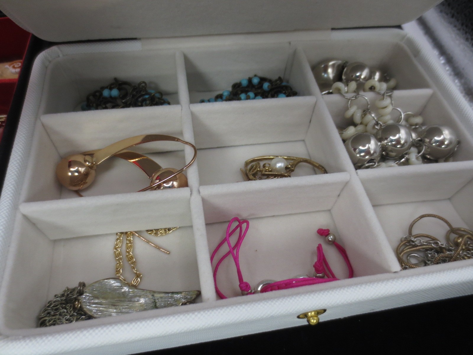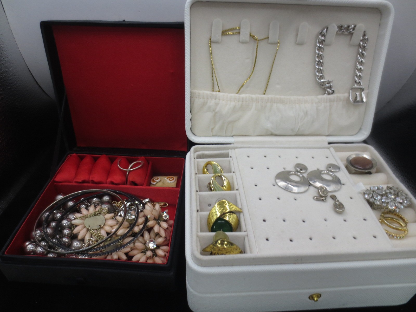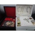 Costume jewellery contained in a white fabric-clad jewellery box, and a fabric-clad jewellery box embroidered with a cockerel