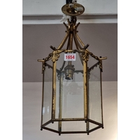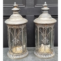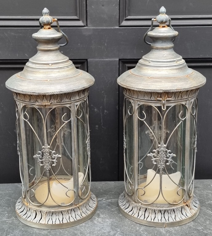 A pair of metal and glass cylindrical hanging lanterns, total height 64cm, (s.d. to one bow glass panel).