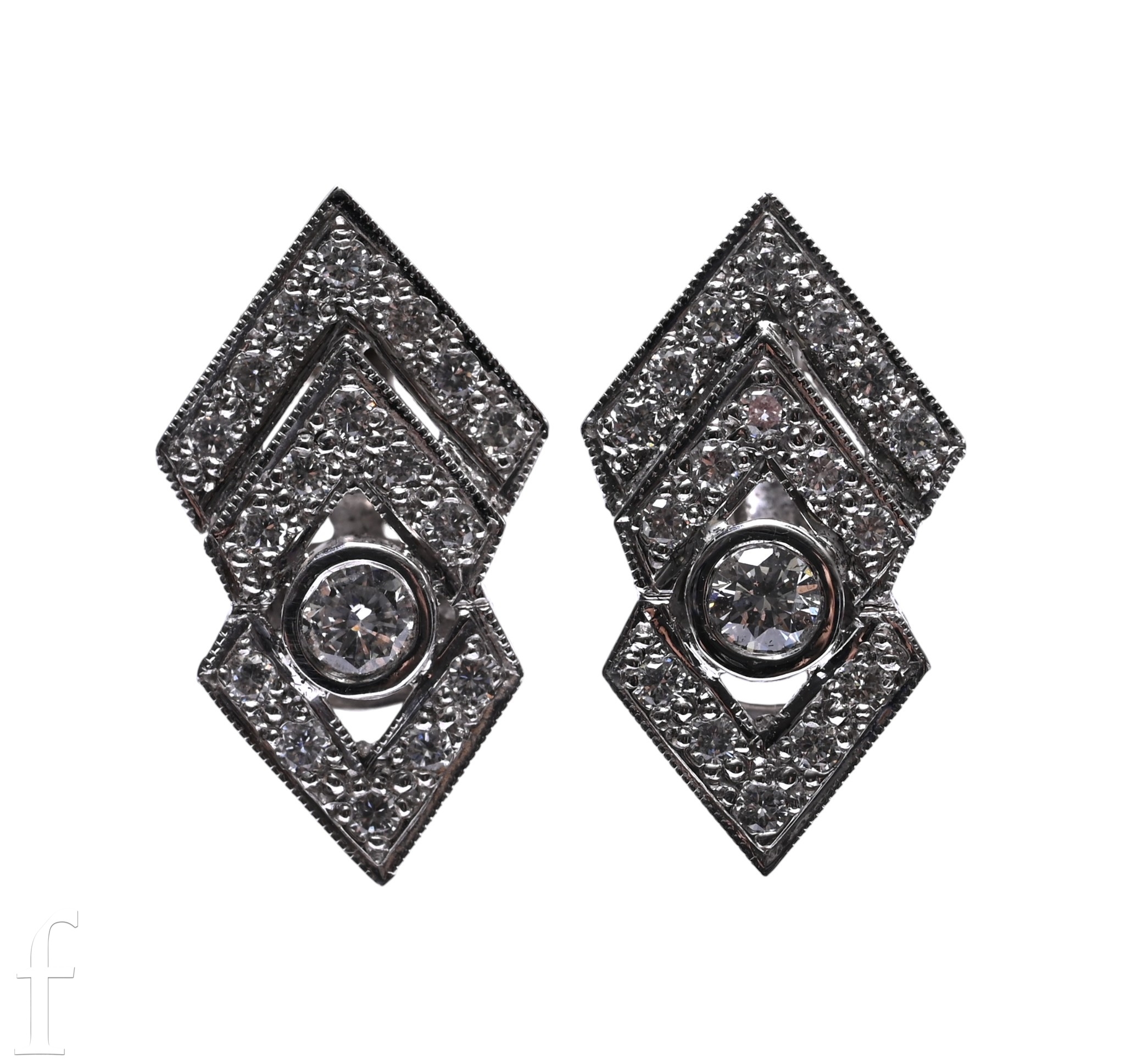 A pair of diamond earrings, of geometric design, the central collet set brilliant-cut diamonds within diamond set mount, clip fittings, marked for 18 carat gold, total weight 6.6g, 2cm x 1cm.