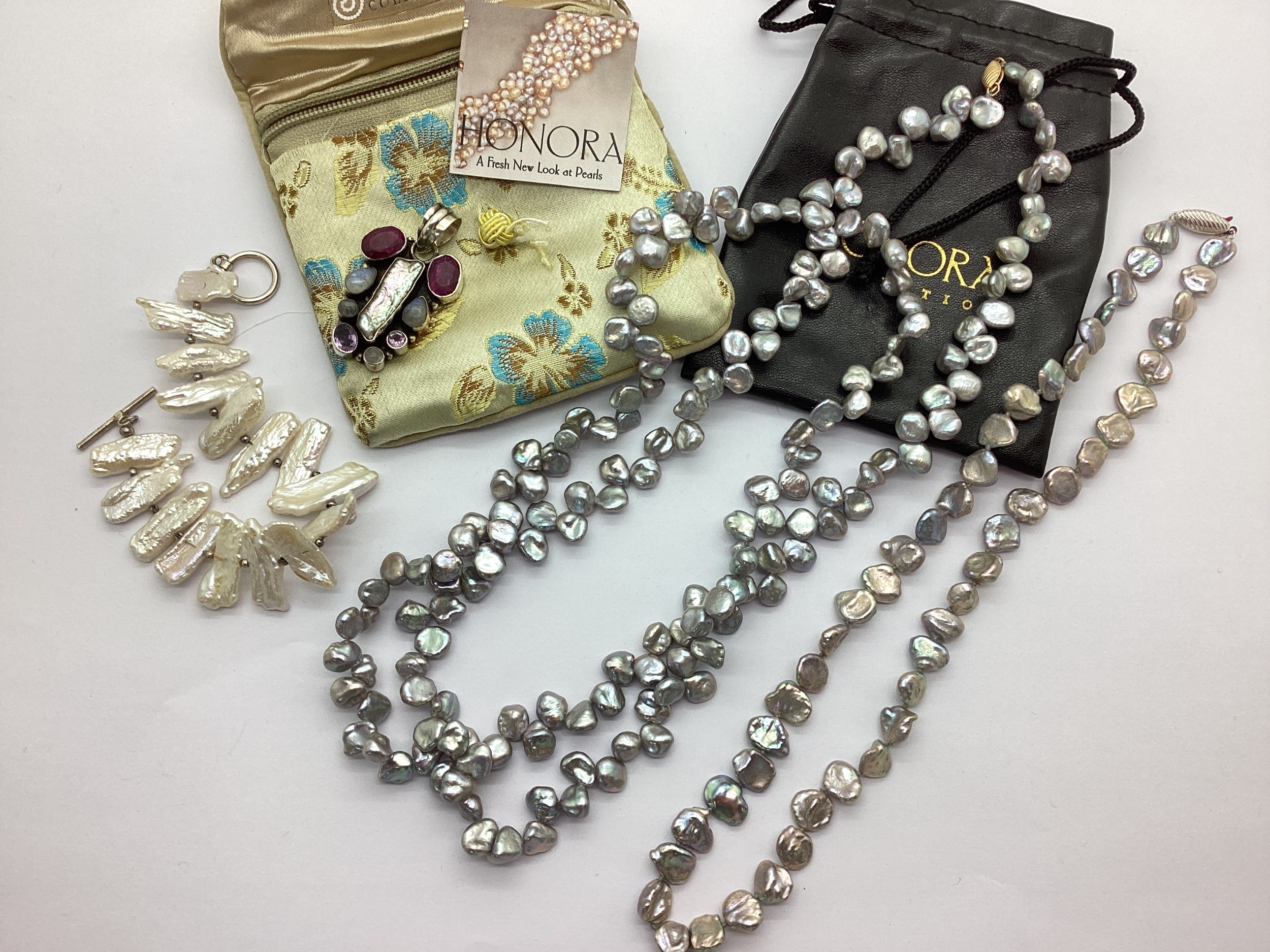 Honora; A "14K" Gold Clasp Opera Length Baroque Pearl Necklace, together with a "14K" white gold clasped pearl bead necklace, baroque pearl bracelet to T-bar clasp stamped "925" and a modernist style stone set pendant, stamped "925". (4)