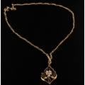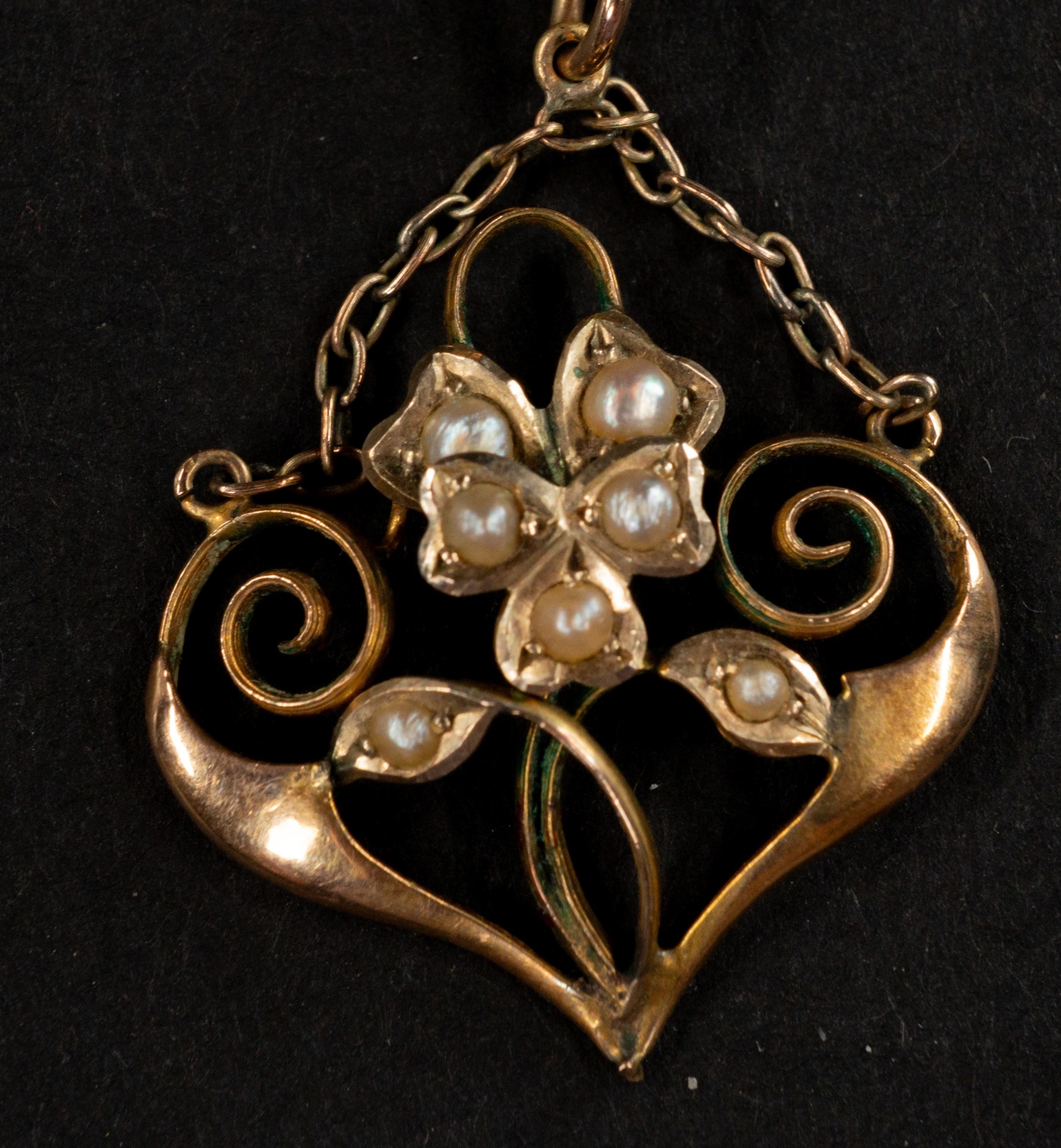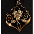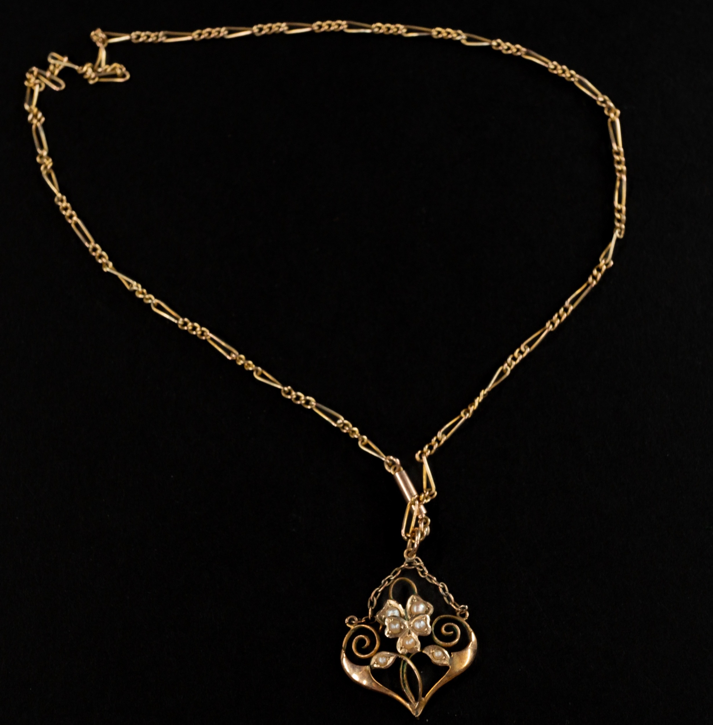Jewellery: 9ct gold fancy curb link chain, 38cm long, with an open triangular scroll drop pendant attached, set with five seed pearls, total weight 5.3g.